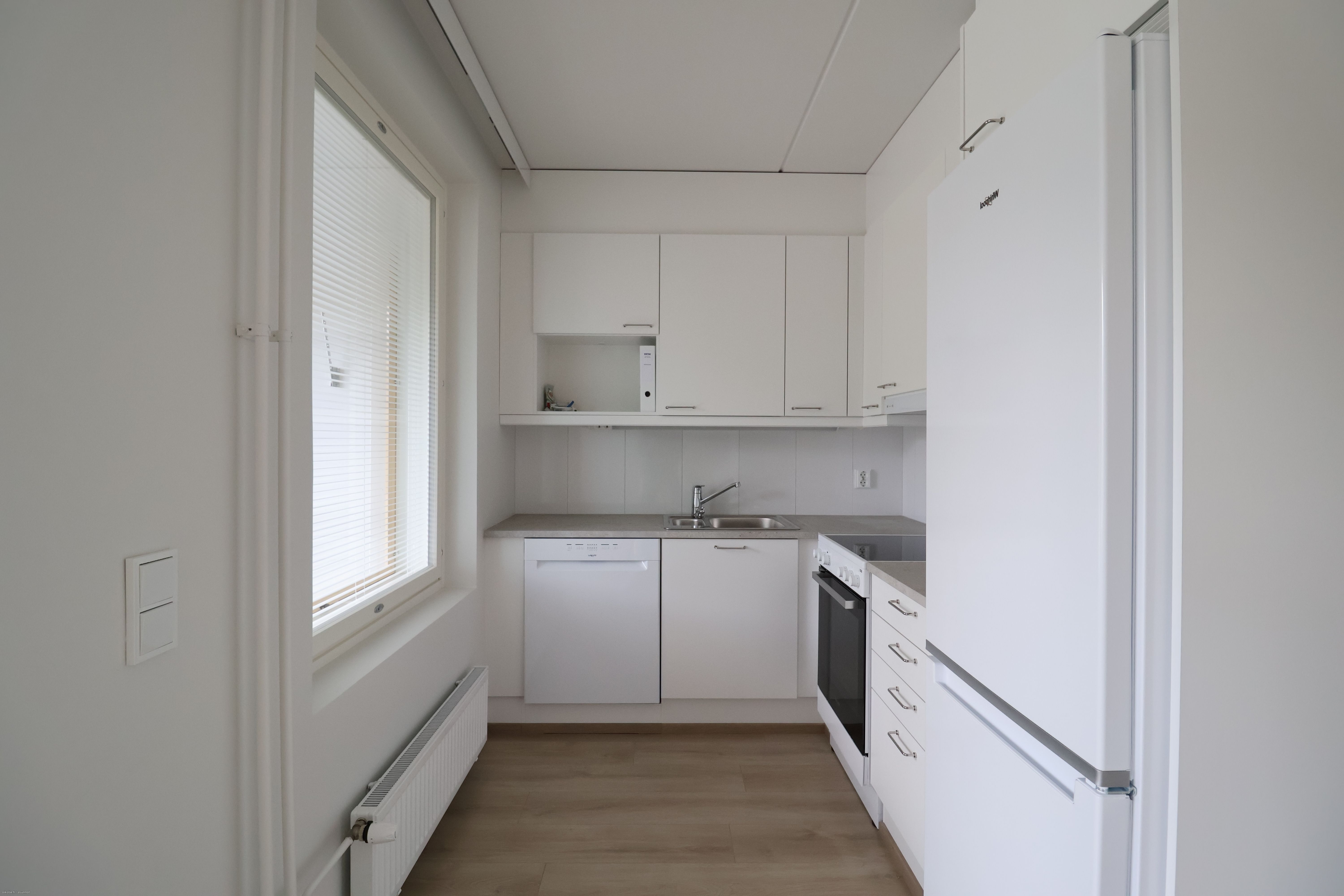 Tässä valoisassa asunnossa seinät ovat vaaleilla maalipinnoilla ja lattiana on puunsävyinen laminaatti. Keittiön varusteluun kuuluu astianpesukone, uuni, liesi sekä jääkaappi-pakastin. Kylpyhuoneesta löytyy paikka ja liitännät pesukoneelle. Lisämukavuutta tuo lasitettu parveke. Taloyhtiöstä löytyy pesutupa, sauna sekä huoneistokohtaiset irtaimistovarastot.