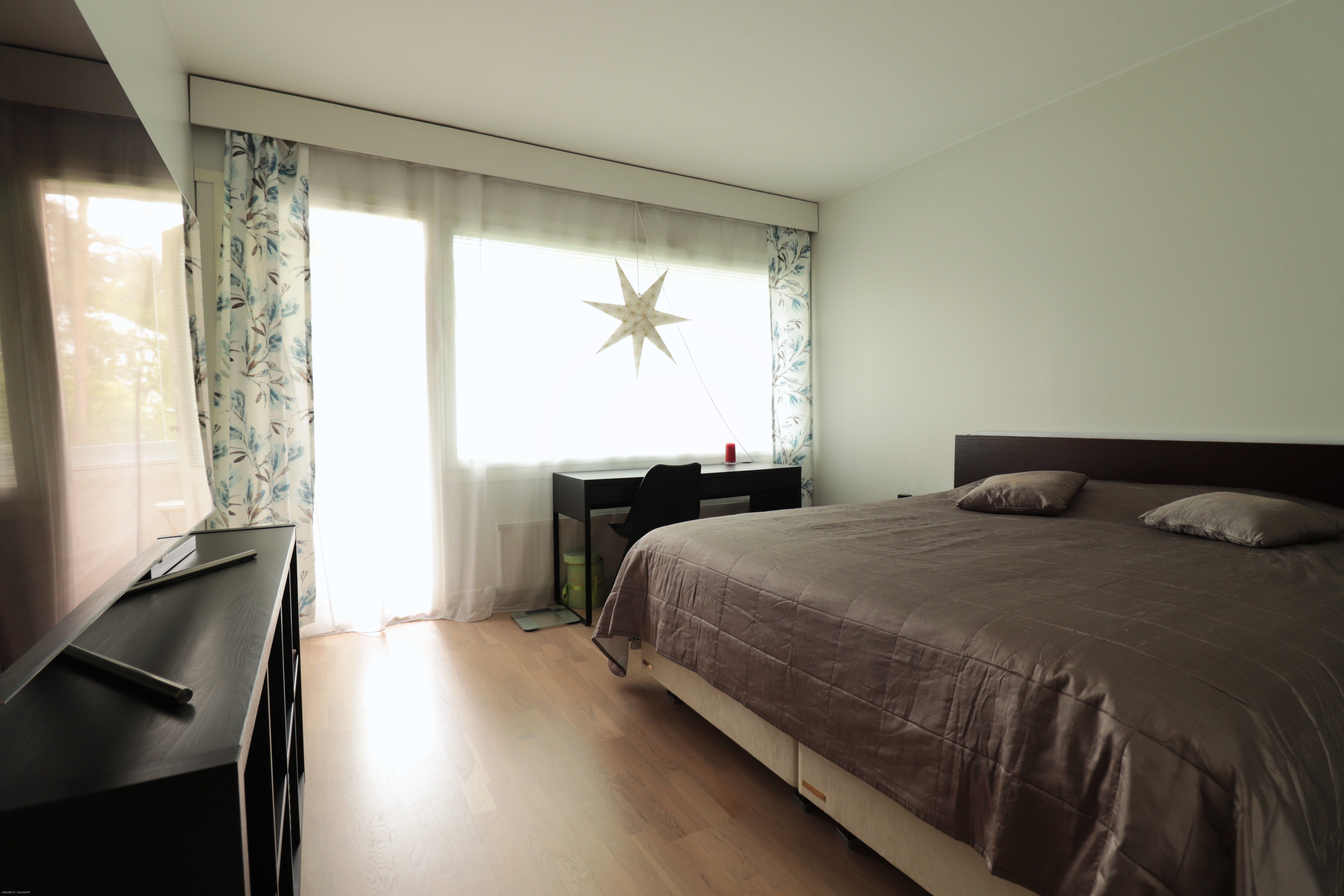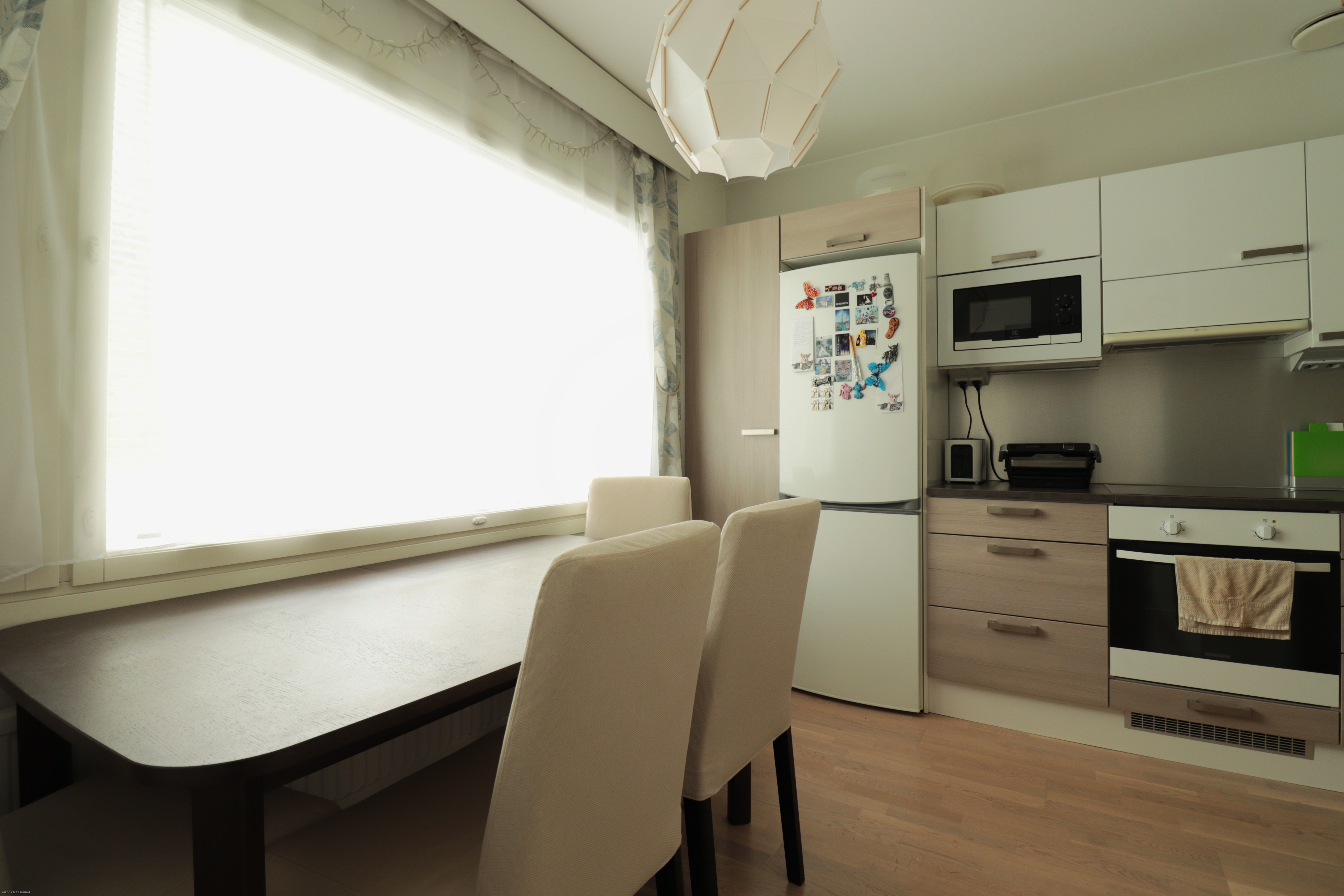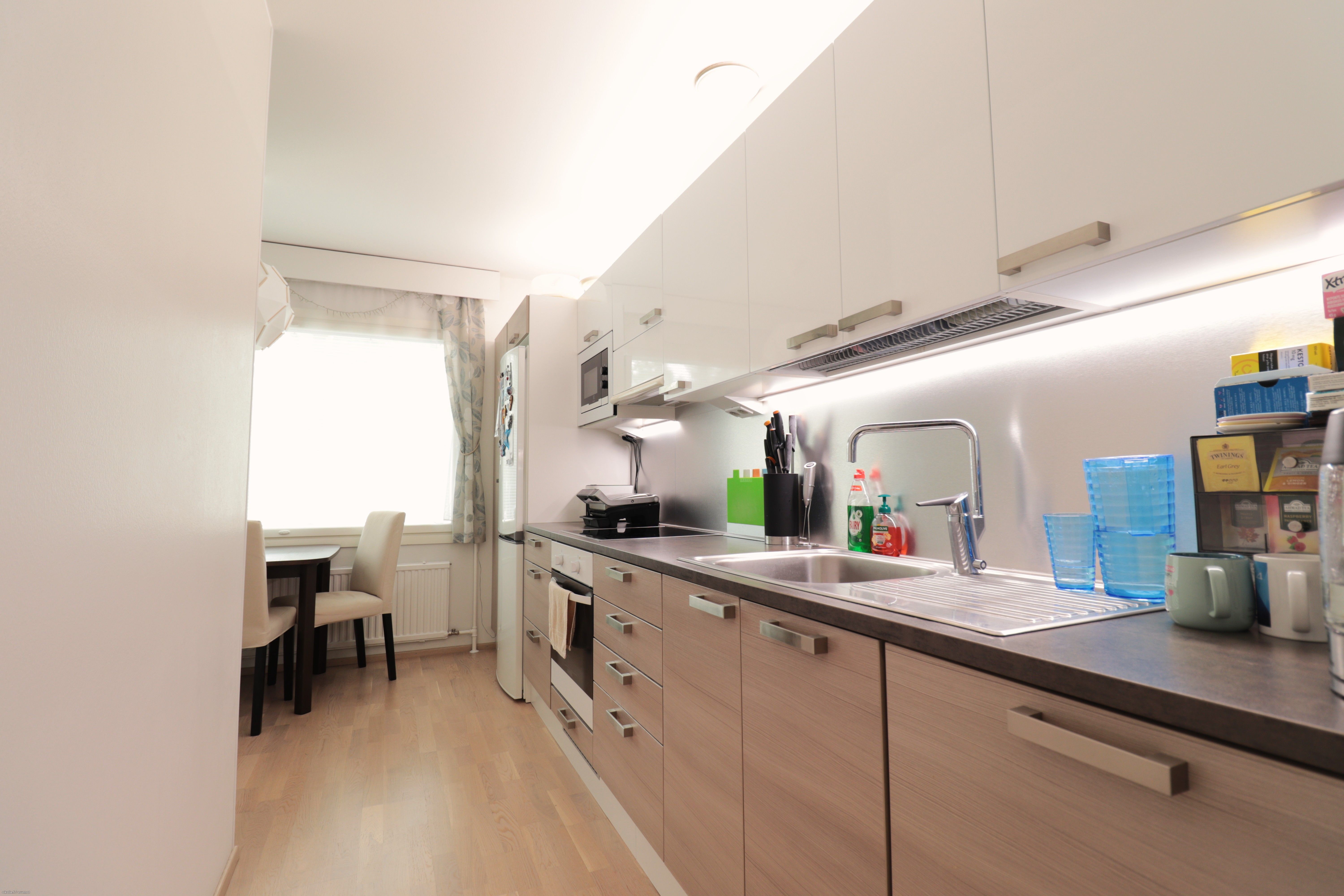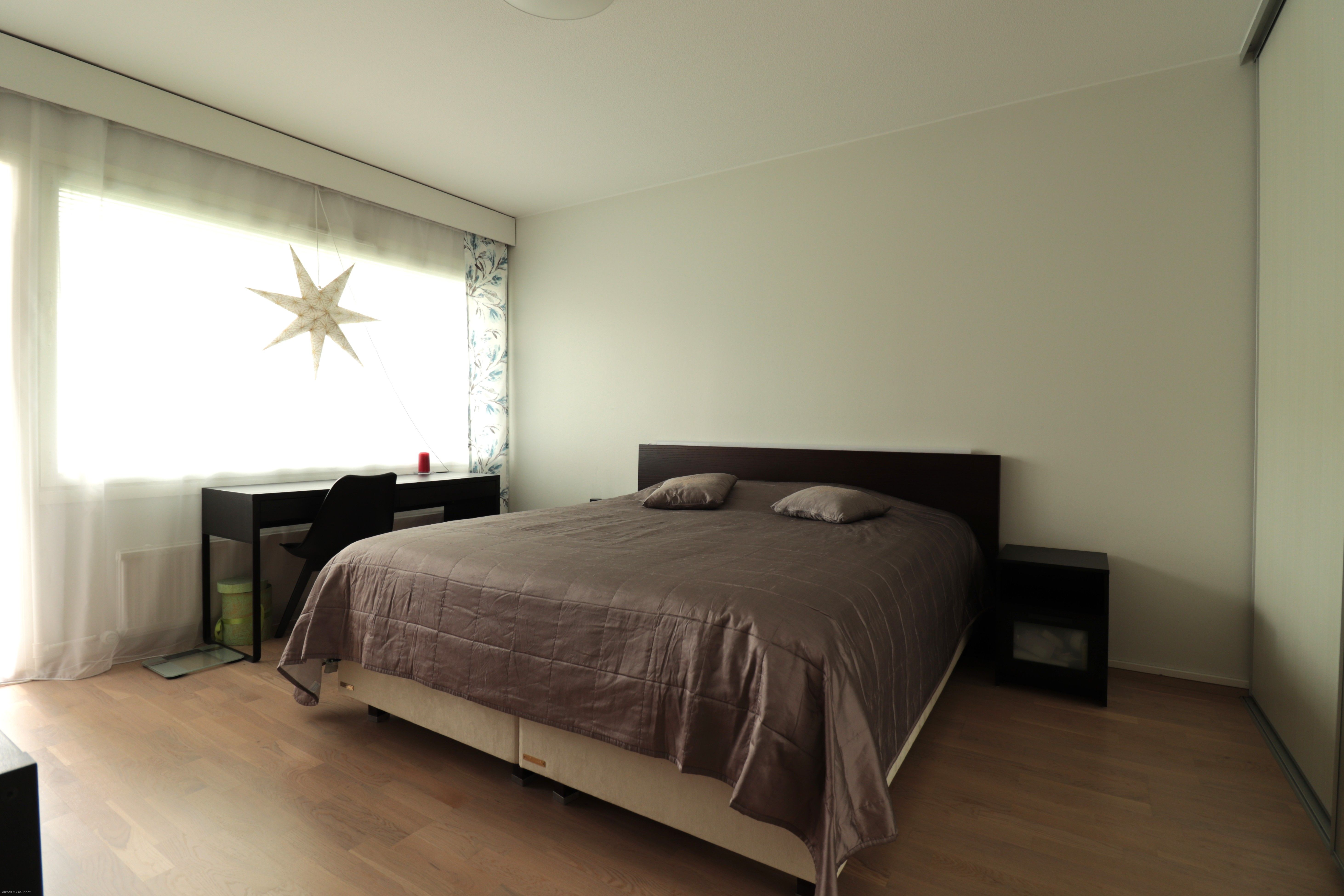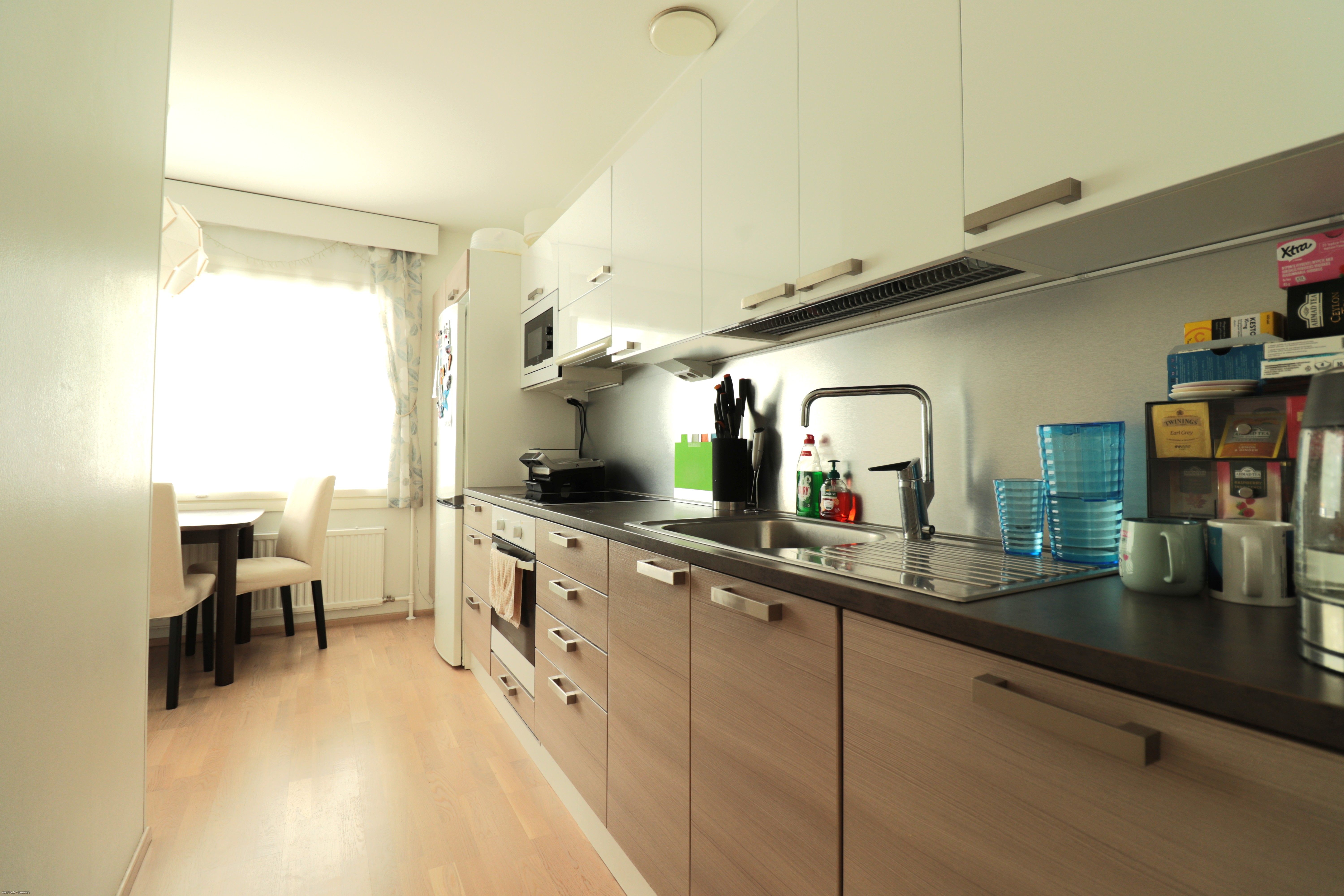 Keittiön varustukseen kuuluu kaikki tarpeellinen; astianpesukone, jääkaappi/pakastin, uuni/liesi ja mikroaaltouuni. Huoneistossa on kaksi tilavaa makuuhuonetta, josta toisesta käynti lasitetulle parvekkeelle. Säilytystilaa lisäämässä reilun kokoinen vaatehuone. Kylpyhuoneessa on asukkaan käyttöön valmiiksi laadukas pyykinpesukone! Asunto on mahdollista vuokrata osittain kalustettuna, kysy lisätietoja!
