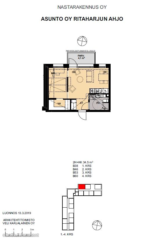 | Huoneiston kokoonpano | 2h,kh,kh,vh,l.parv,ak nro 13 |