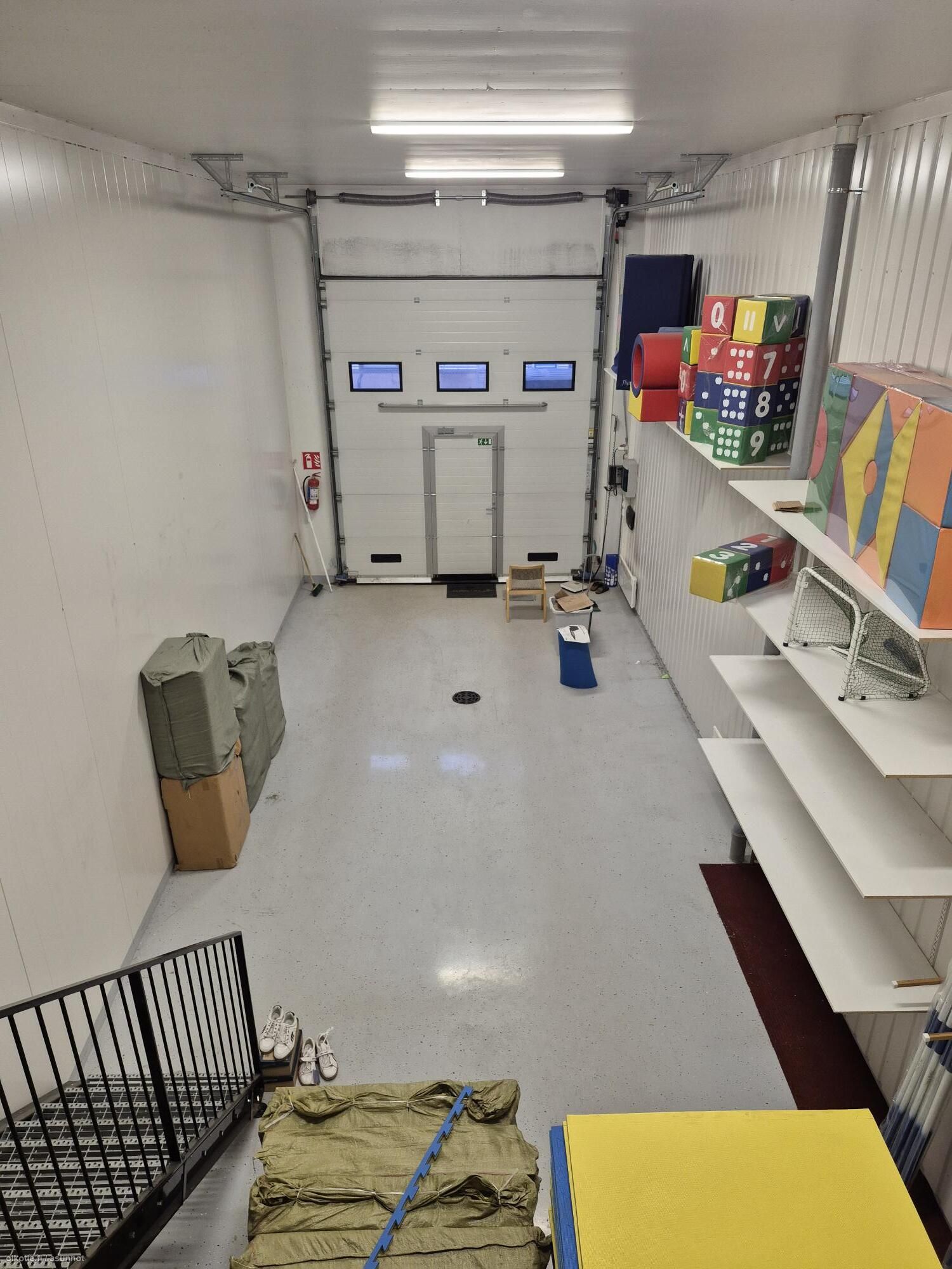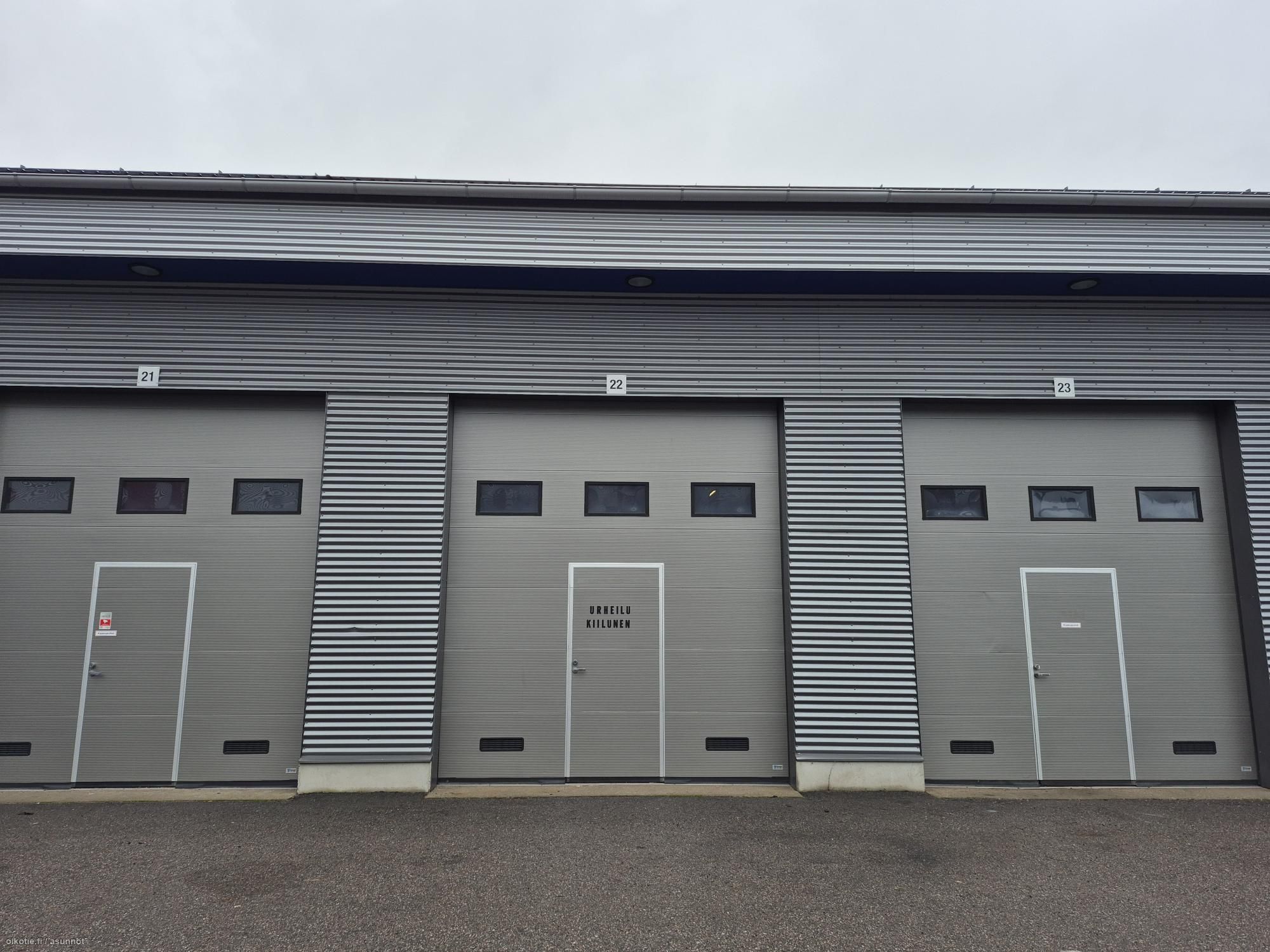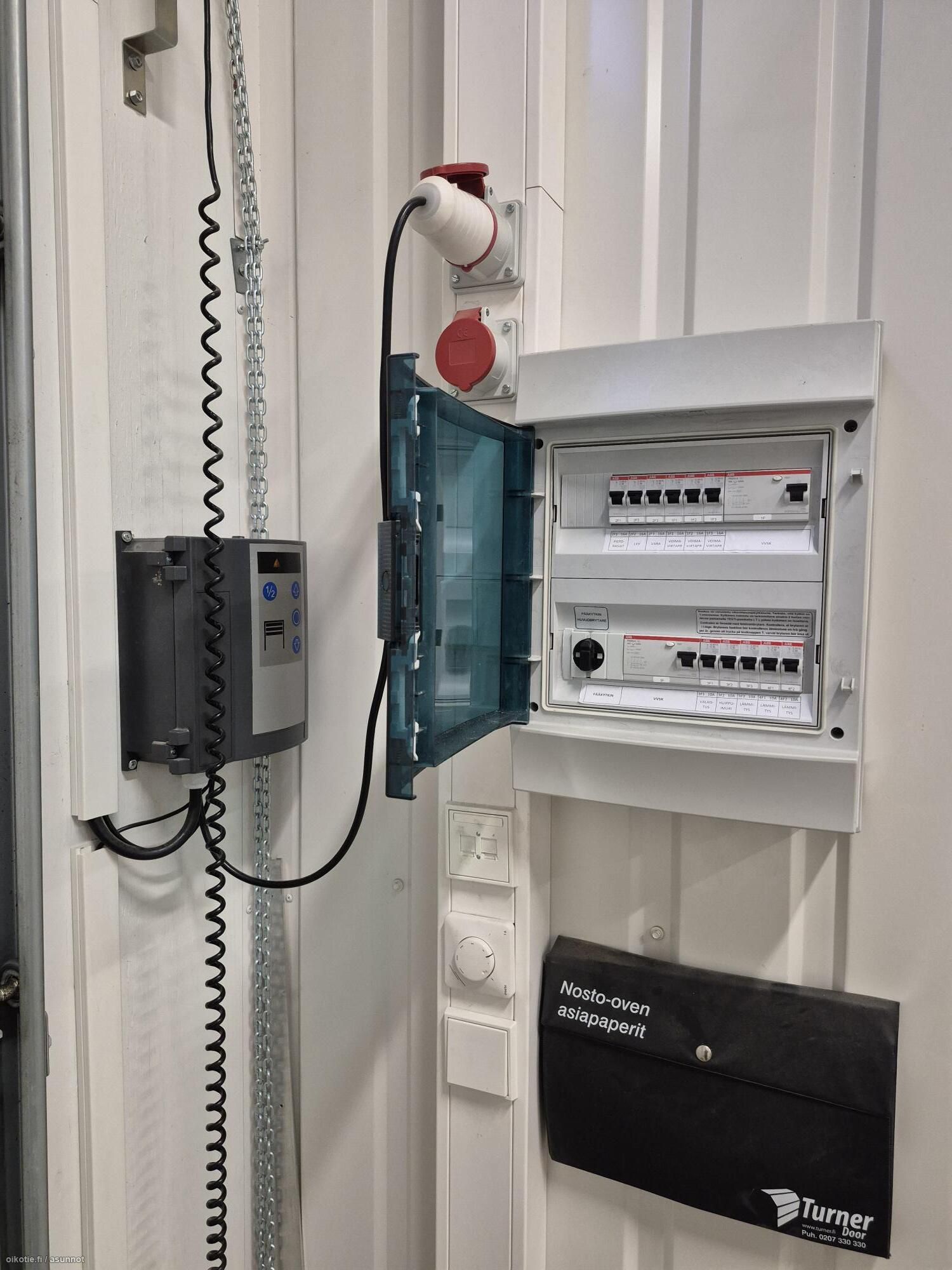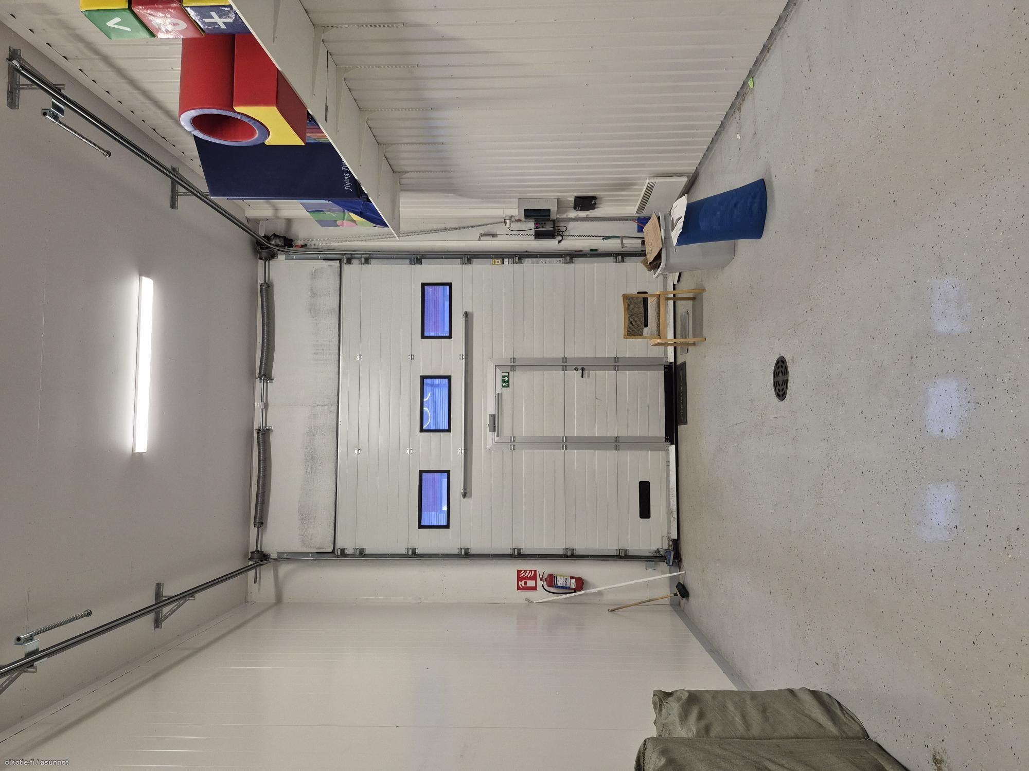 Moottoroitu nosto-ovi 3,45 * 3,8m. Vapaakorkeus 5m ja parvella 2,4m.