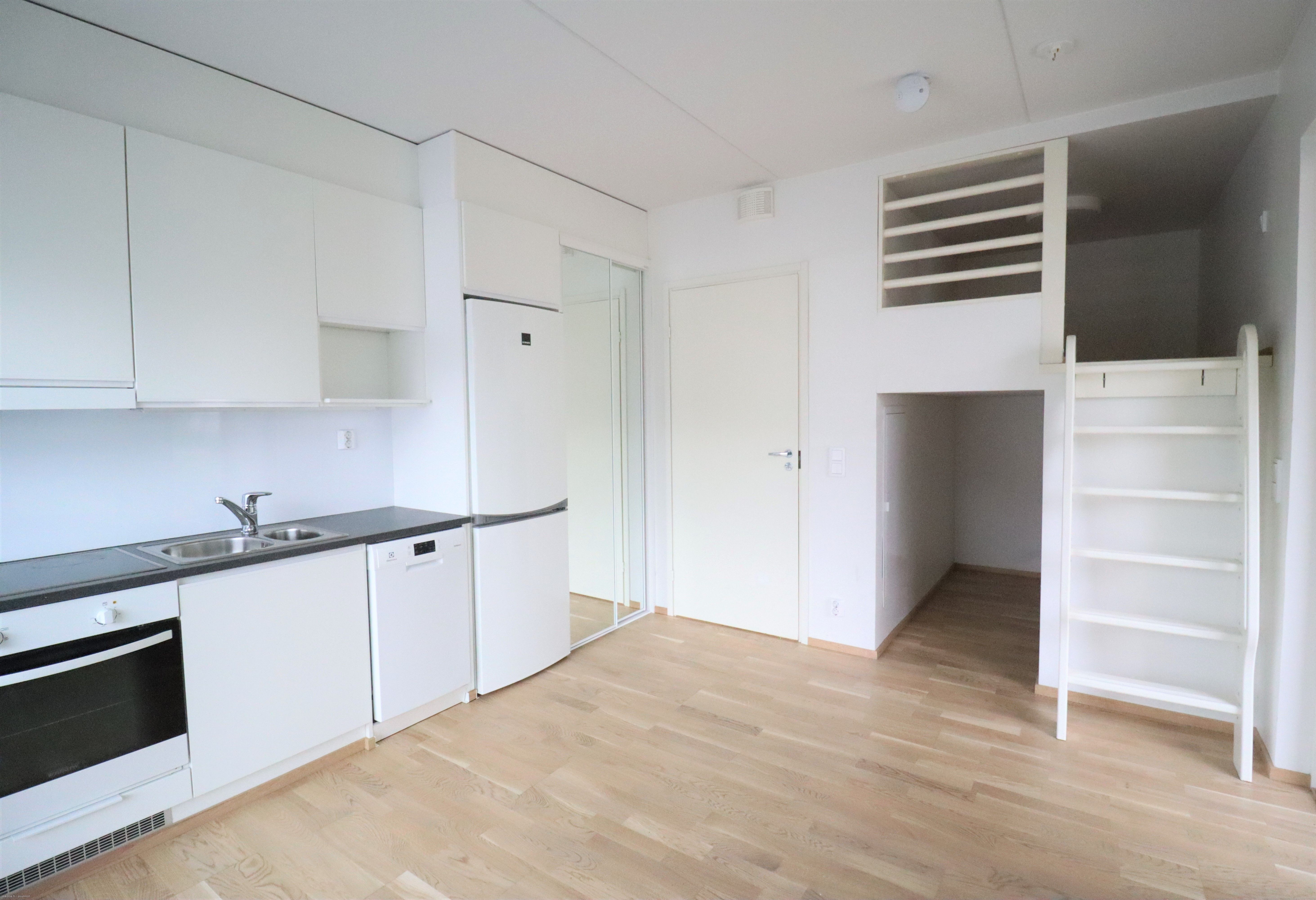 Tässä kodikkaassa yksiössä on makuuparvi, joka helpottaa asunnon sisustamista ja tuo lisää tilaa asumiseen. Asunnon vaatehuone antaa tarpeellista säilytystilaa ja luo arjen luksusta. Tilava lasitettu terassi lisää asumismukavuutta. Tyylikkässä keittiössä on kaikki nykyaikaiset kodinkoneet mm. astianpesukone. Kylpyhuoneessa tilaa ja liitännät pyykinpesukoneelle.
