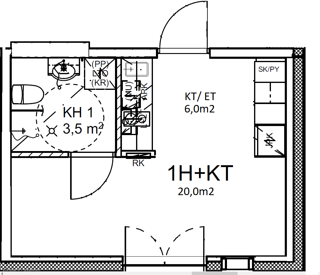 | Huoneiston kokoonpano | 1h+k+ranskalainen parveke |