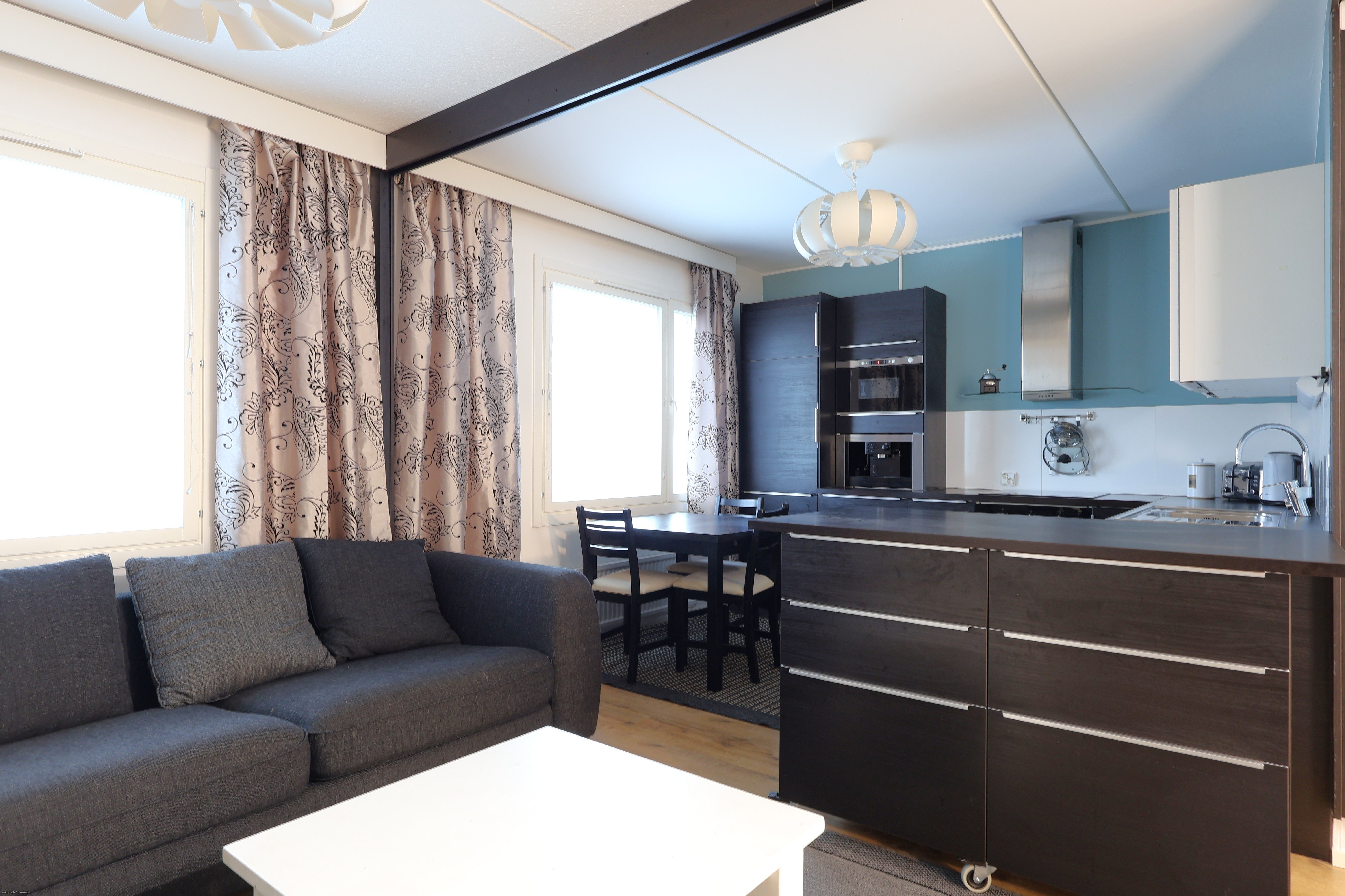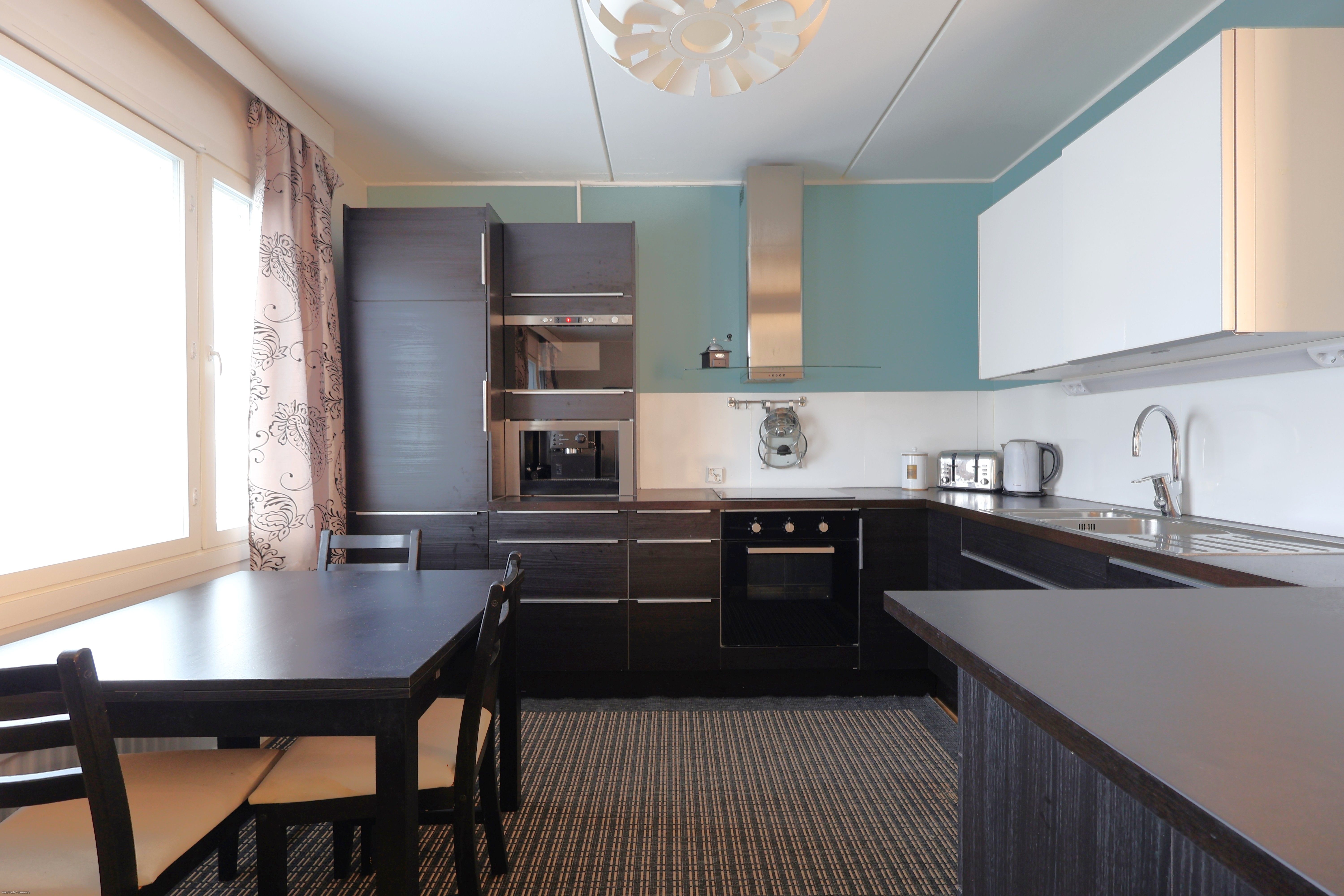 Asunnossa on kaunis vaalea laminaatti, seinät maalattu vaaleiksi. Keittiö on tilava ja siellä on runsaasti kaappitilaa. Keittiön varustukseen kuuluu jääkaappipakastin, uuni, liesi, mikroaaltouuni, astianpesukone sekä kahvikone. Kaikki keittiön kodinkoneet on kalusteisiin integroitu. Kylpyhuone on juuri remontoitu ja sieltä löytyy paikka ja liitännät pyykinpesukoneelle. Asunnossa on iso lasitettu parveke.