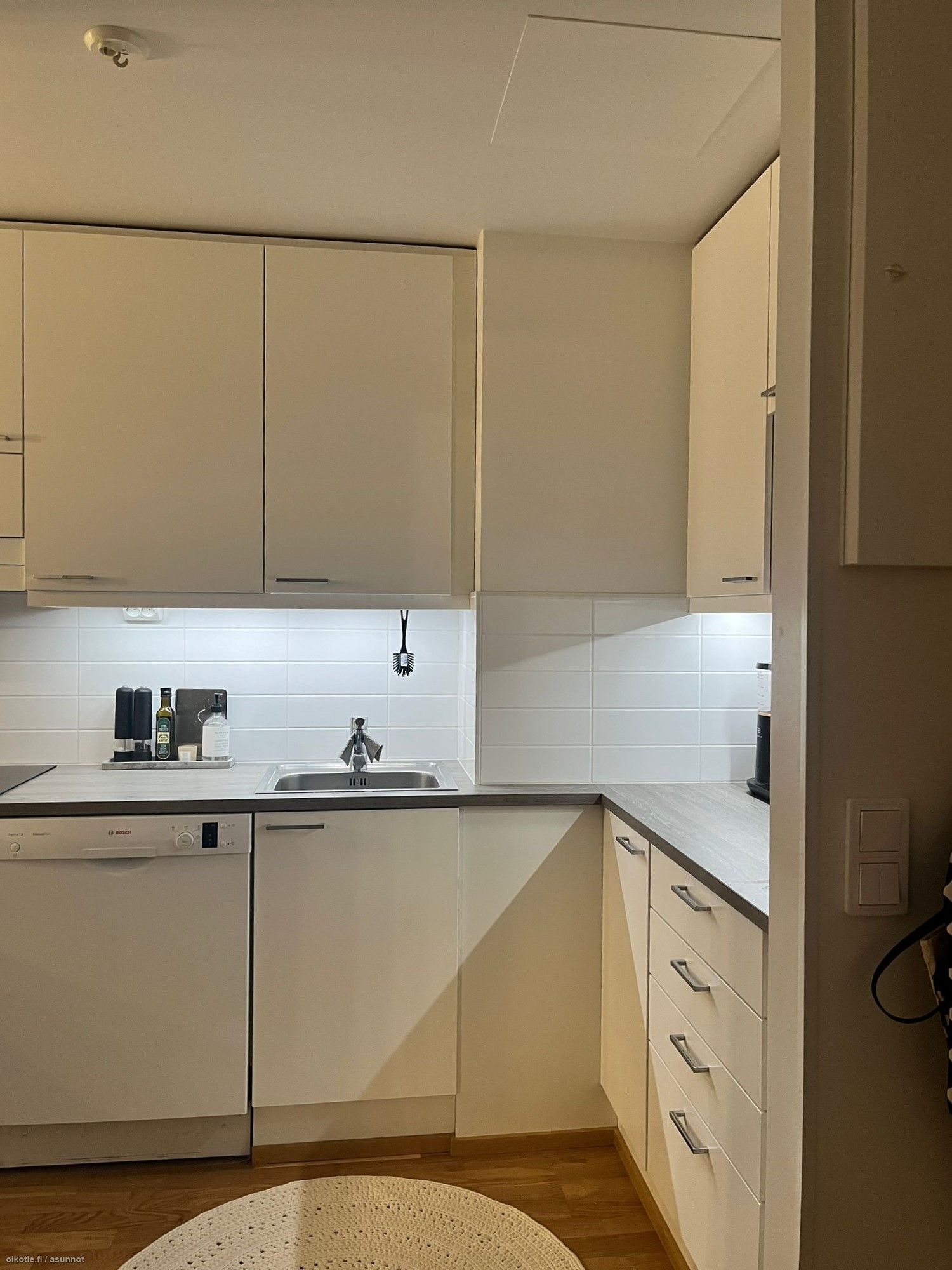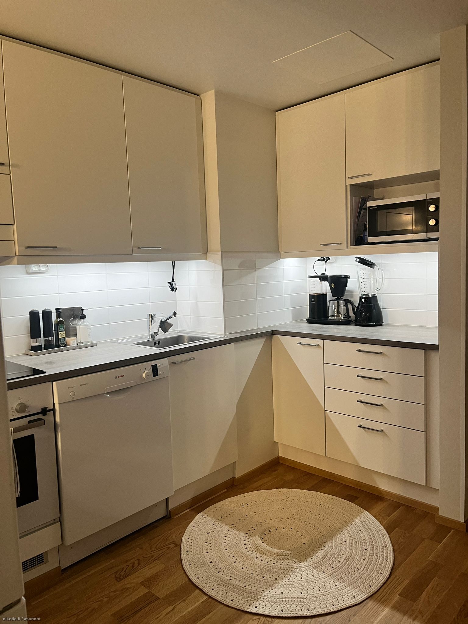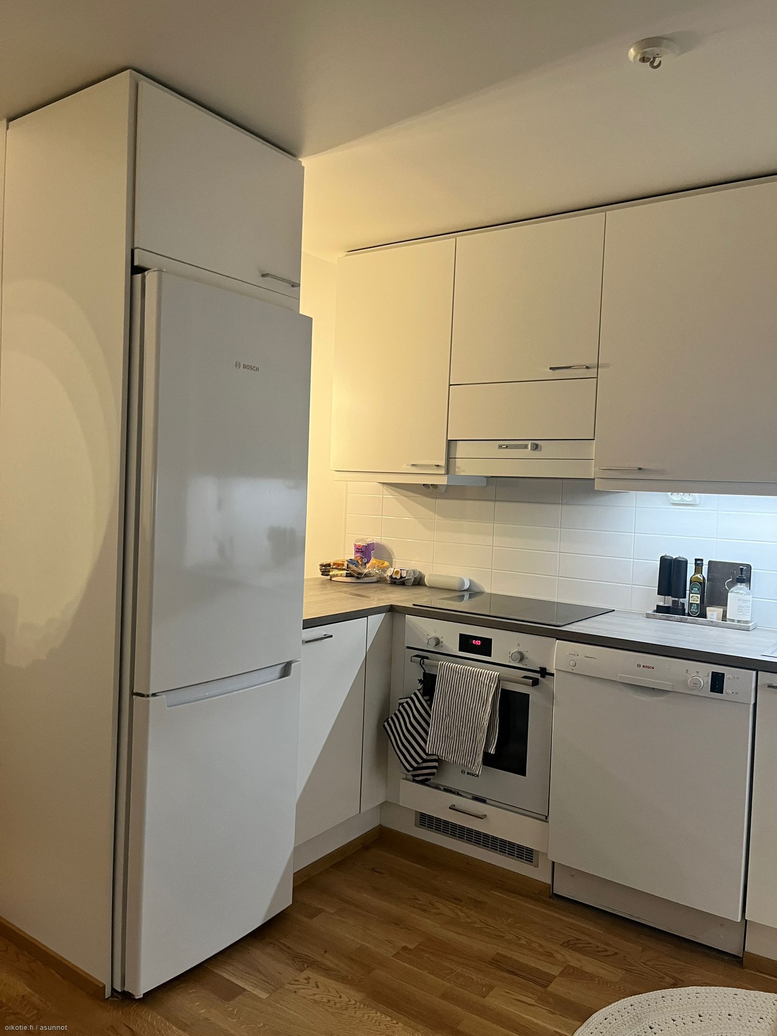 Asunnossa on laadukkaat materiaalit, lattiat parkettia ja seinät valkoisiksi maalatut. Keittiön varustuksena tasokkaat Boschin valkoiset kodinkoneet, jääkaappi-pakastin, kalusteeseen upotettu liesi ja liesitaso, sekä astianpesukone. Kylpyhuoneeseen saat asennettua oman pyykinpesukoneen. Säilytystilaa löytyy myös hyvin, mm. tilava vaatehuone.