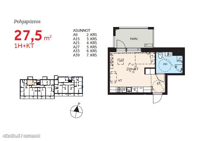 | Huoneiston kokoonpano | 1h,kt,kh,las.parv. |