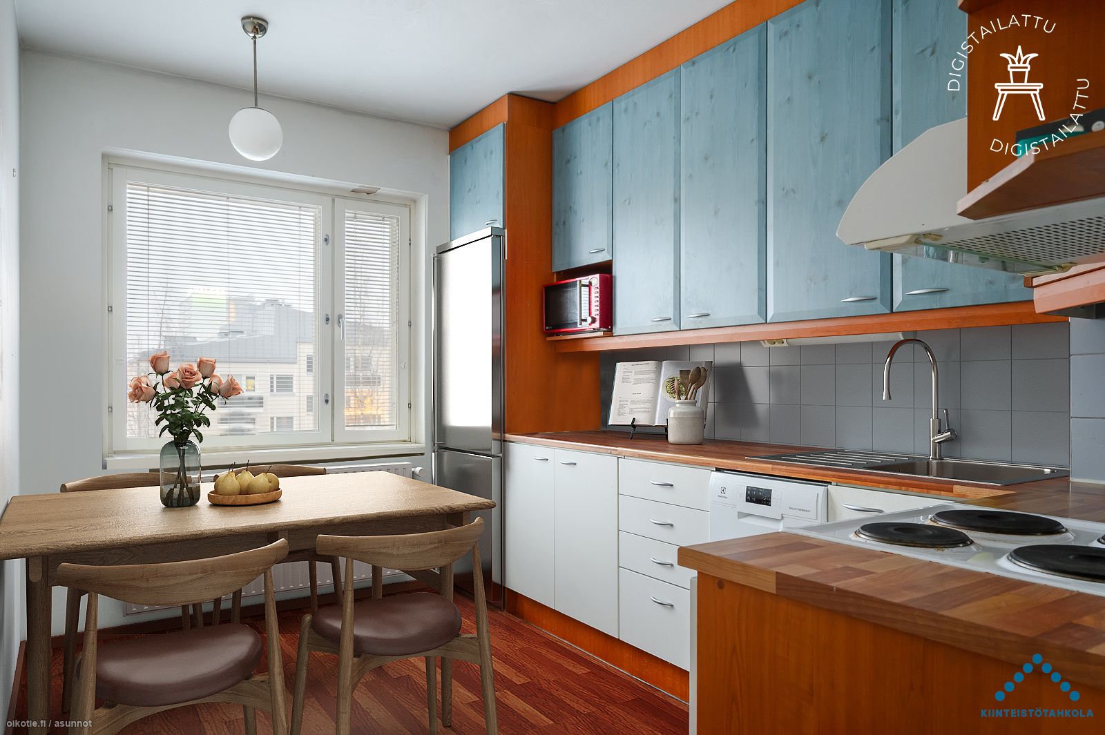 | Keittiön varusteet | Varusteet: Jääkaappipakastin, Astianpesukone. Työtaso: Laminaattitaso. Liesi: Sähköliesi, Liesituuletin |