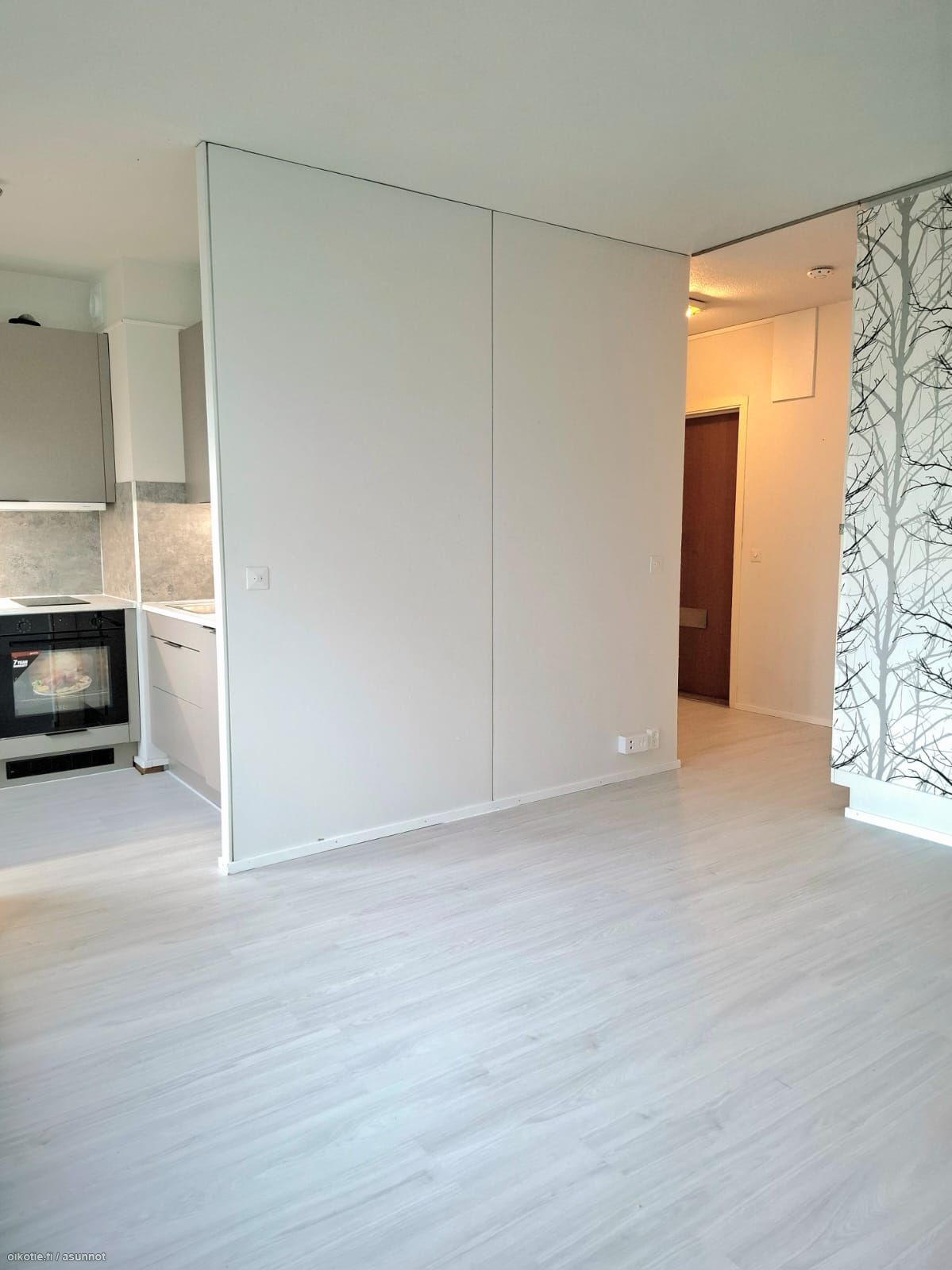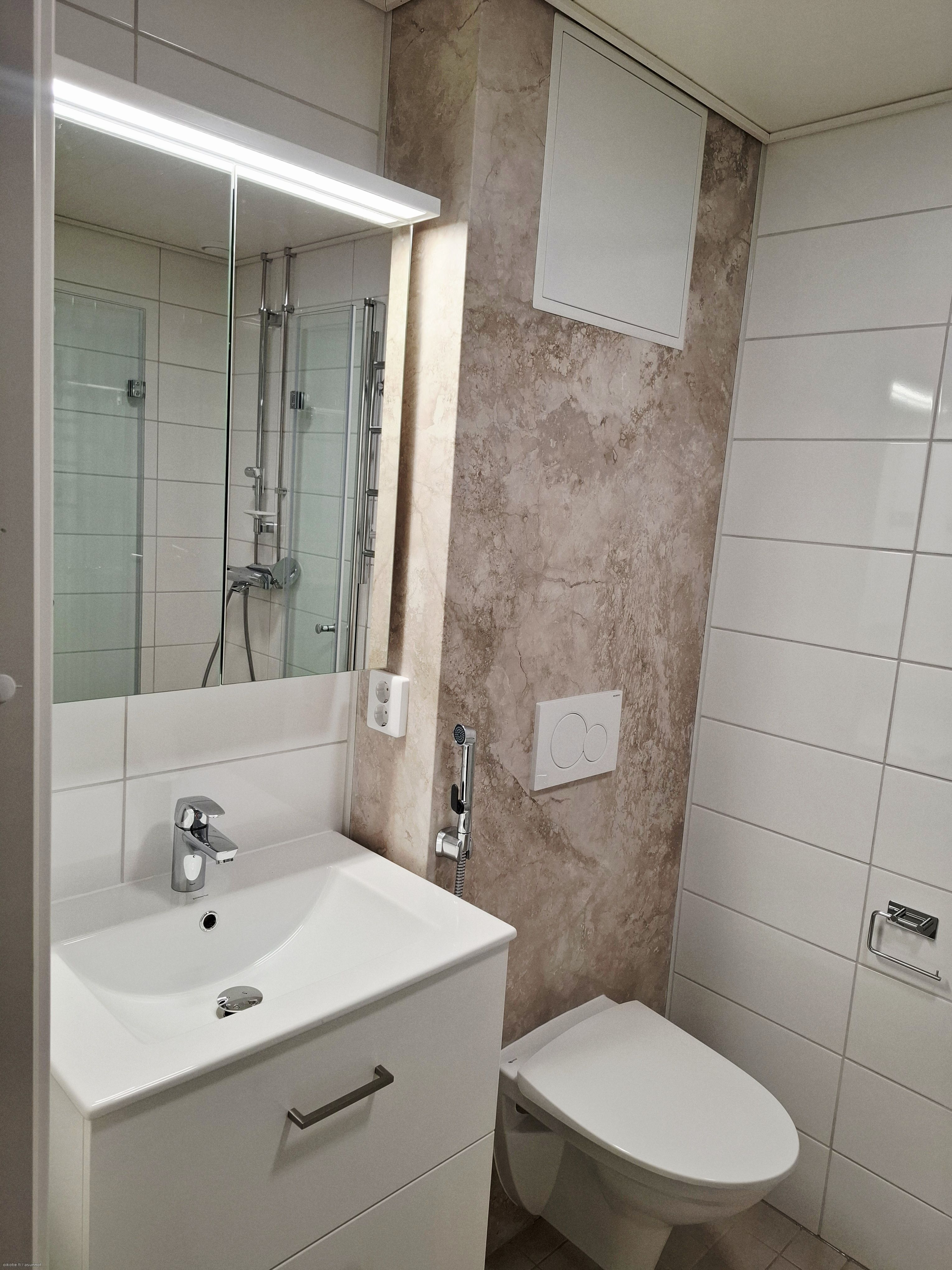 The apartment has just been renovated and features a stunning modern kitchen and bathroom. The kitchen is equipped with a fridge/freezer, oven and stove, and a dishwasher. The housing company is quiet and well-maintained.