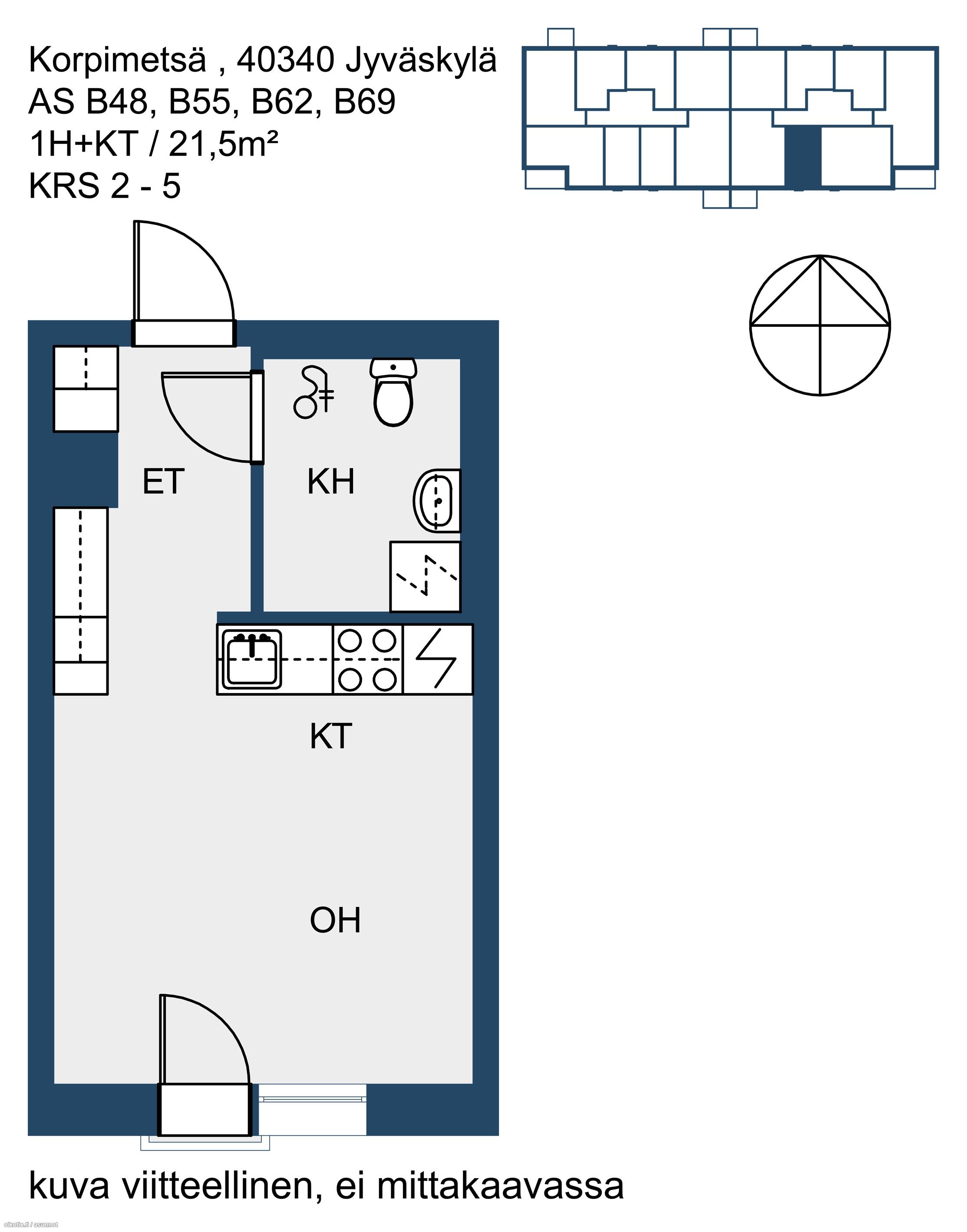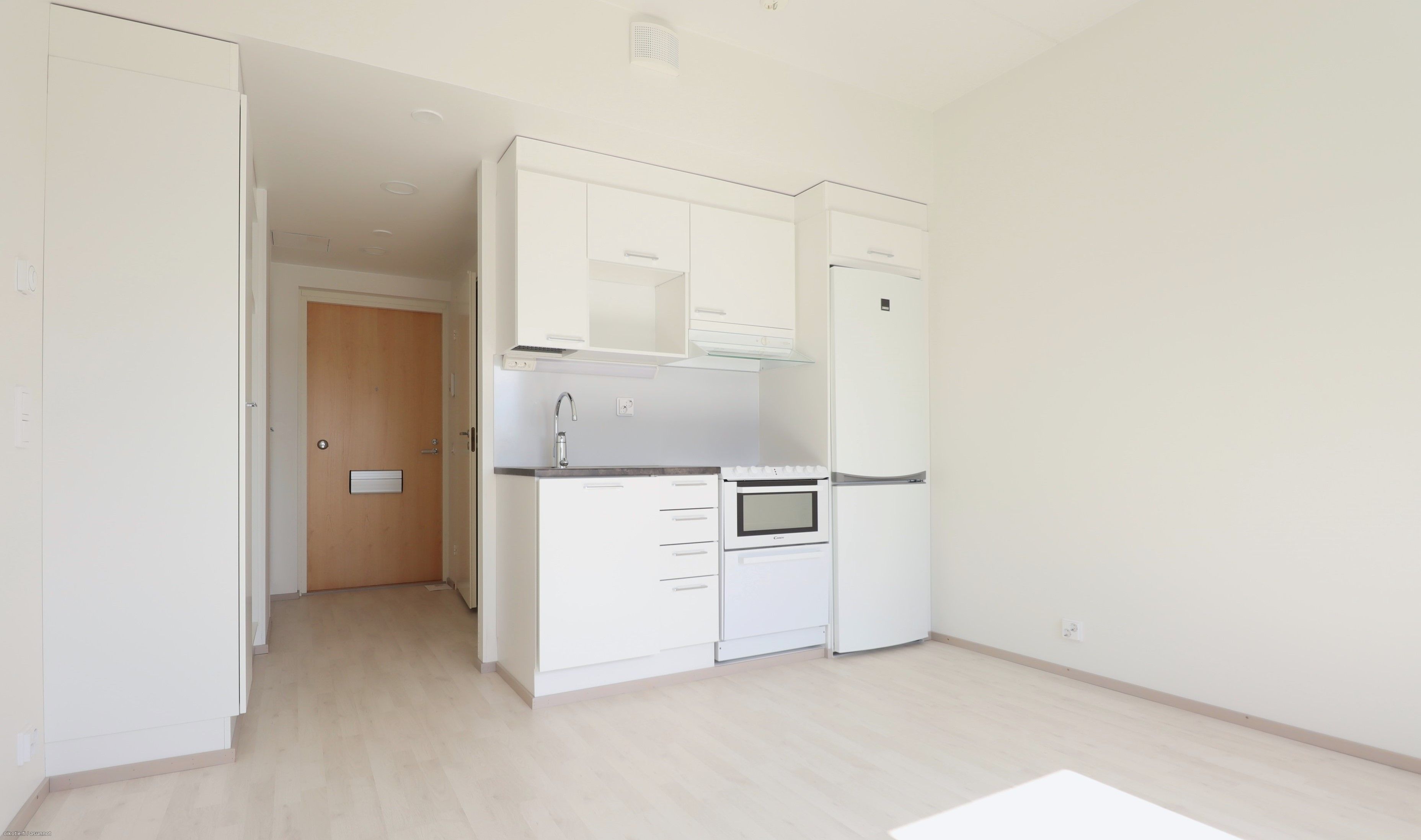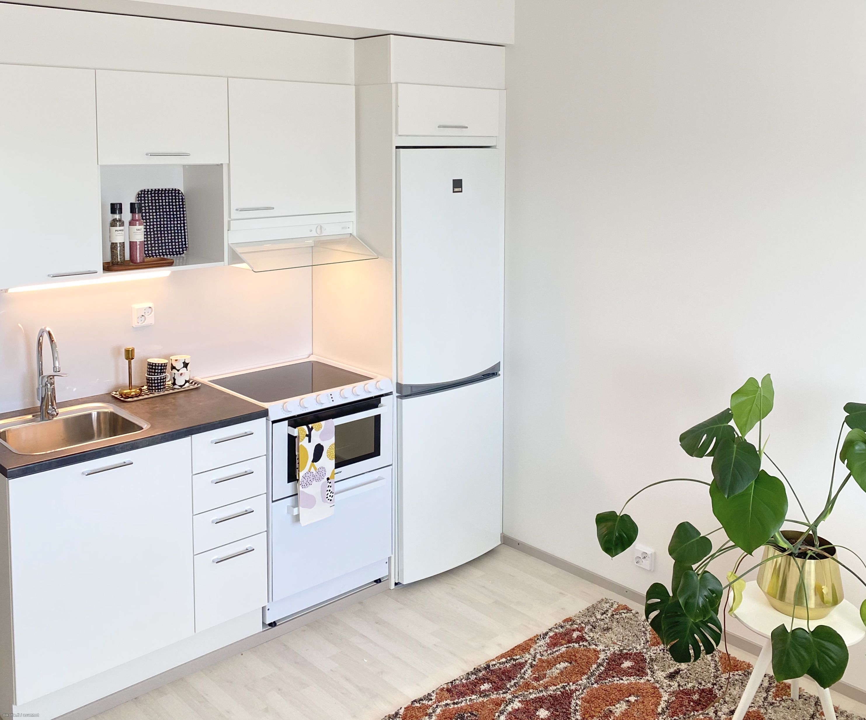 Asunnon lattiat ovat laminaattia, seinät vaalein maalipinnoin ja kylpyhuone laatoitettu. Keittiötilassa on yhdistetty jääkaappi ja pakastin, astianpesukone sekä liesi. Pesuhuoneeseen mahtuu hyvin pyykinpesukone. Ikkunoissa sälekaihtimet. Kuvat vastaavasta asunnosta.