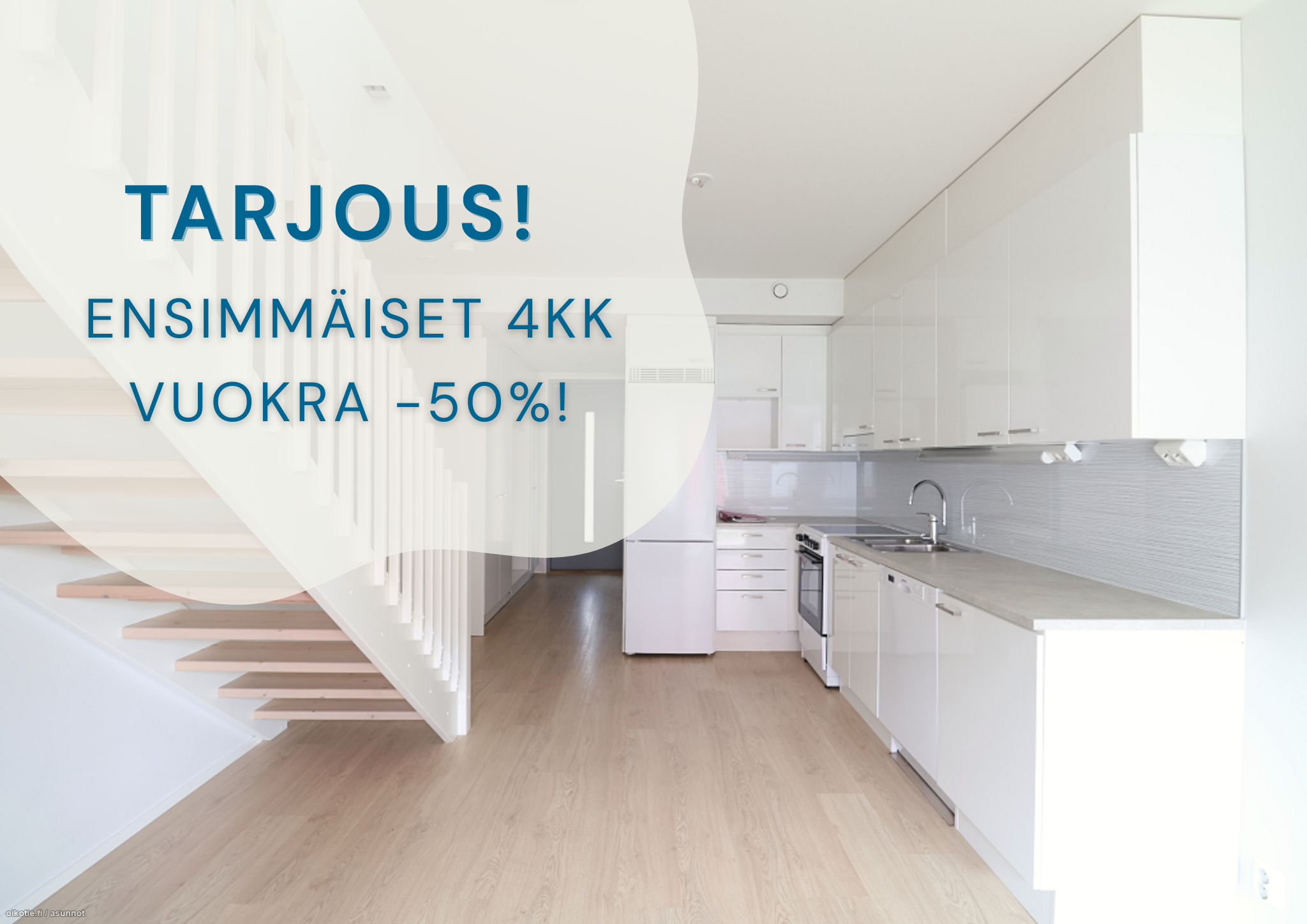 Uuden vuokralaisen Etu! Ensimmäiselle neljälle asumiskuukaudelle saat -50% alennuksen vuokrasta. Kampanja-ajan jälkeen tämän asunnon vuokra on 1553,90€/kk.