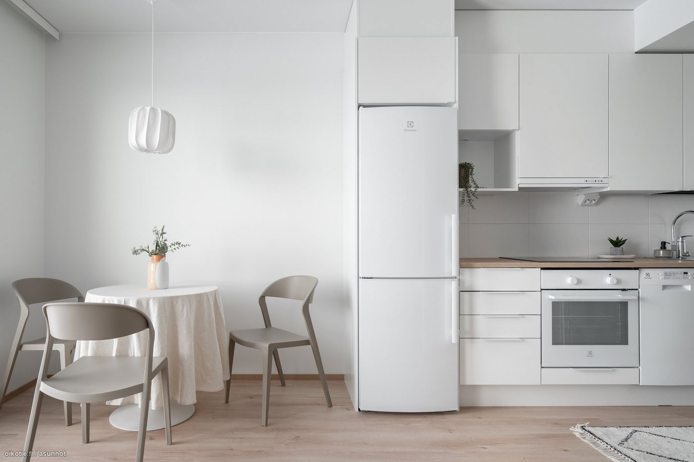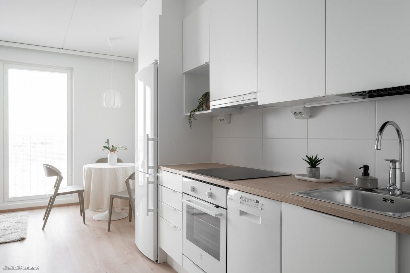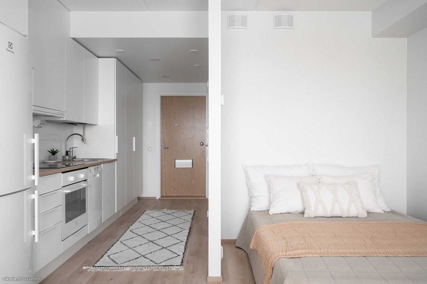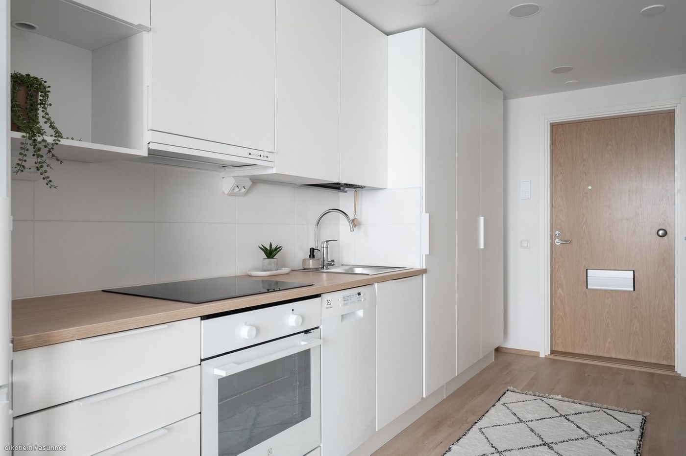 Tässä asunnossa on hyvä pohjaratkaisu ja alkovi tuo mukavasti tilantuntua. Kaakeloidussa harmaan ja valkoisen sävyisessä kylpyhuoneessa on paikka ja liitäntä omalle pyykinpesukoneelle ja kuivausrummulle. Keittiössä kauniit vaaleat kaapistot ja tehostevärinä tammitaso. Keittiön varusteluun kuuluu laadukkaat Electroluxin kodinkoneet: astianpesukone, jääkaappipakastin, liesi sekä erillisuuni. Seinät valkoisella maalipinnalla. Huoneistoon kuuluu oma ranskalainen parveke, jonka avulla saat asunnon näppärästi tuuletettua.