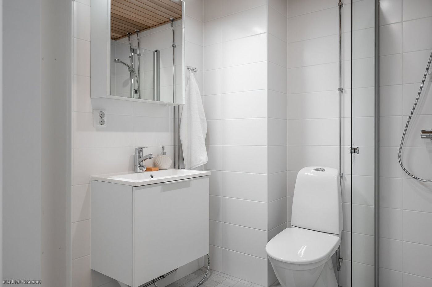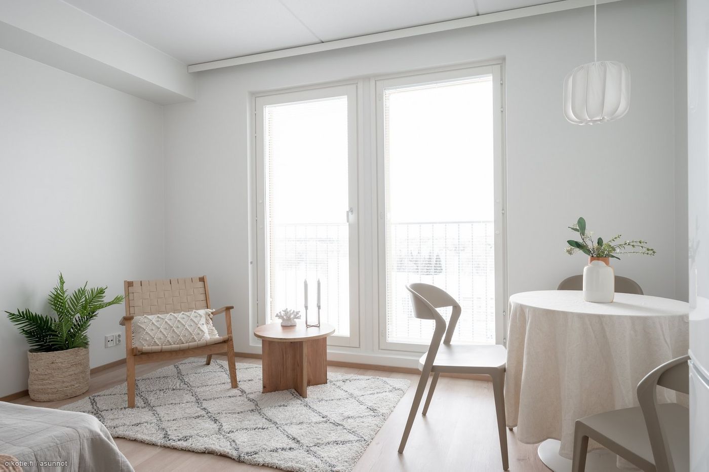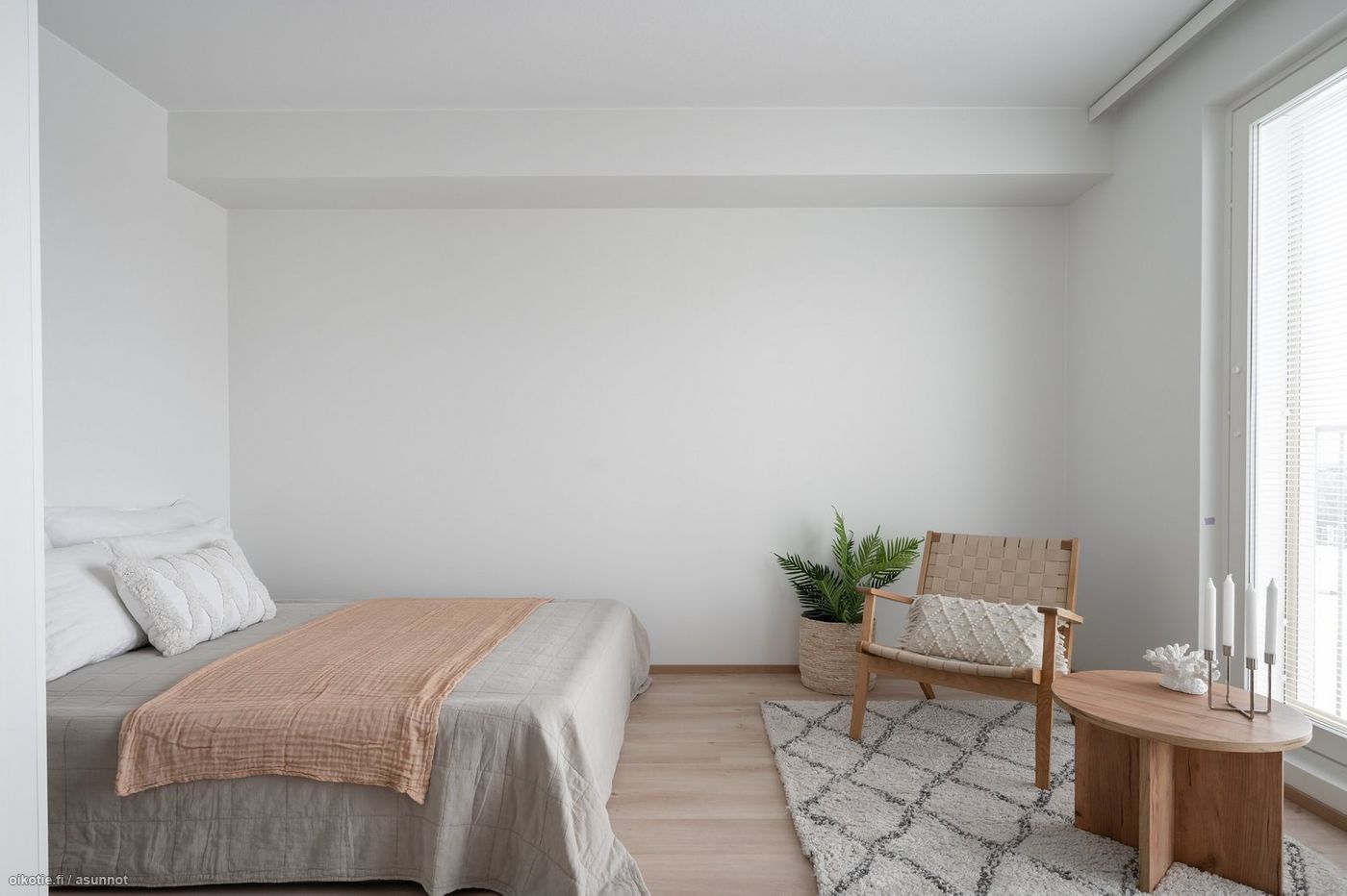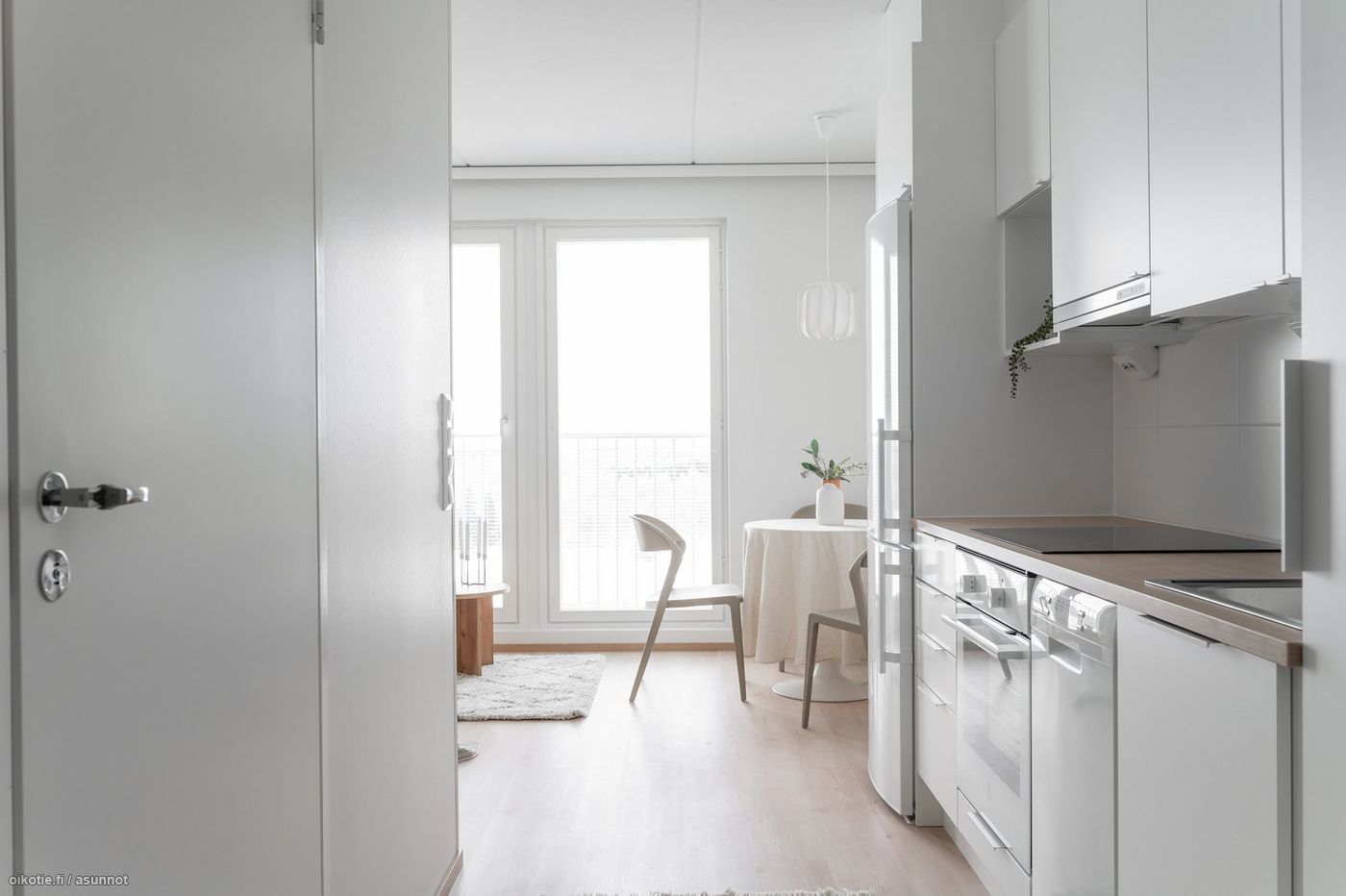 Tässä asunnossa on hyvä pohjaratkaisu ja alkovi tuo mukavasti tilantuntua. Kaakeloidussa harmaan ja valkoisen sävyisessä kylpyhuoneessa on paikka ja liitäntä omalle pyykinpesukoneelle ja kuivausrummulle. Keittiössä kauniit vaaleat kaapistot ja tehostevärinä tammitaso. Keittiön varusteluun kuuluu laadukkaat Electroluxin kodinkoneet: astianpesukone, jääkaappipakastin, liesi sekä erillisuuni. Seinät valkoisella maalipinnalla. Huoneistoon kuuluu oma ranskalainen parveke, jonka avulla saat asunnon näppärästi tuuletettua.