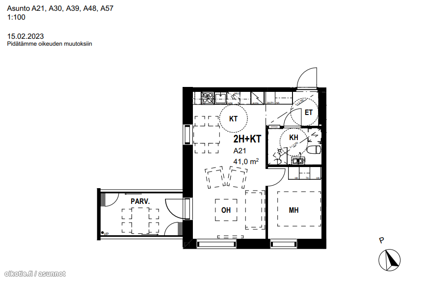| Huoneiston kokoonpano | 2h+kt+las.parveke |