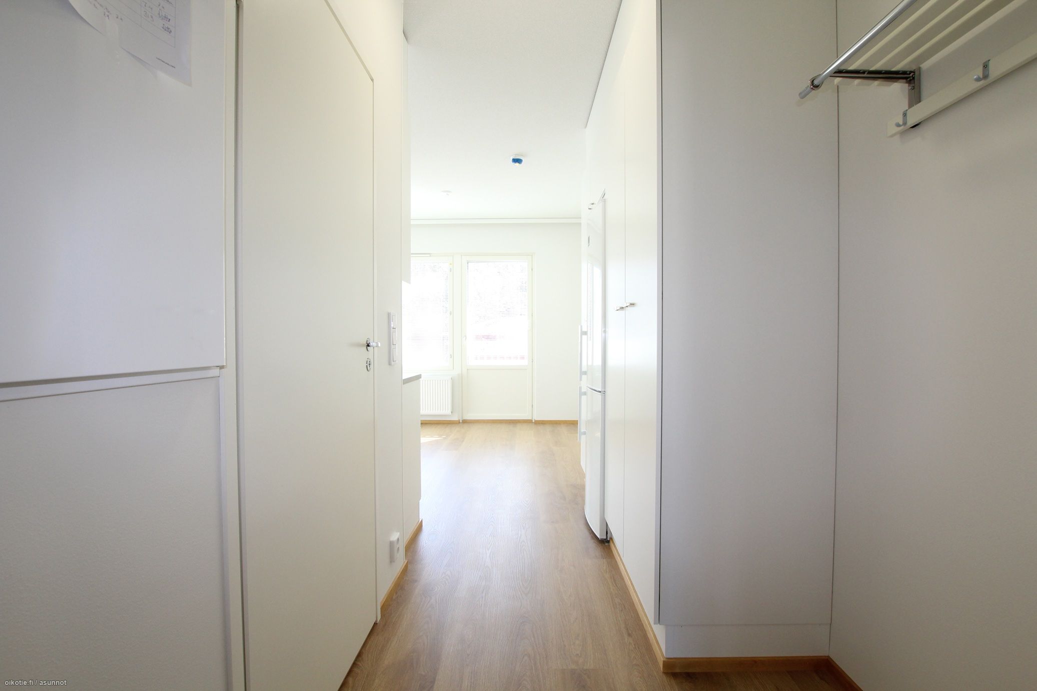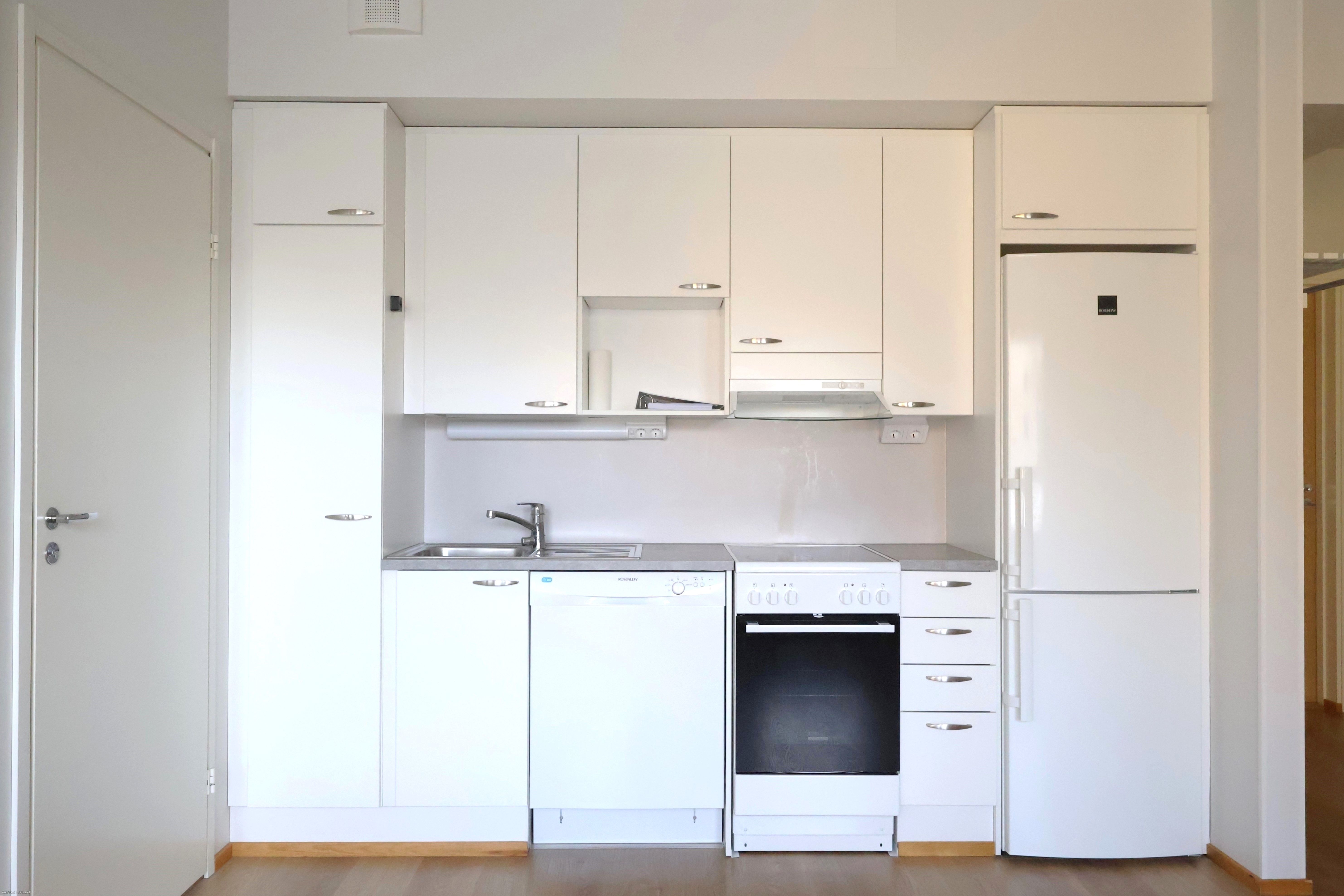 Asunnon lattiat ovat laminaattia, seinät maalipinnoin ja kylpyhuone laatoitettu. Keittiötilassa on yhdistetty jääkaappi ja pakastin, astianpesukone sekä liesi. Pesuhuoneeseen mahtuu hyvin pyykinpesukone. Kuvat havainnekuvia eri asunnosta samasta talosta.