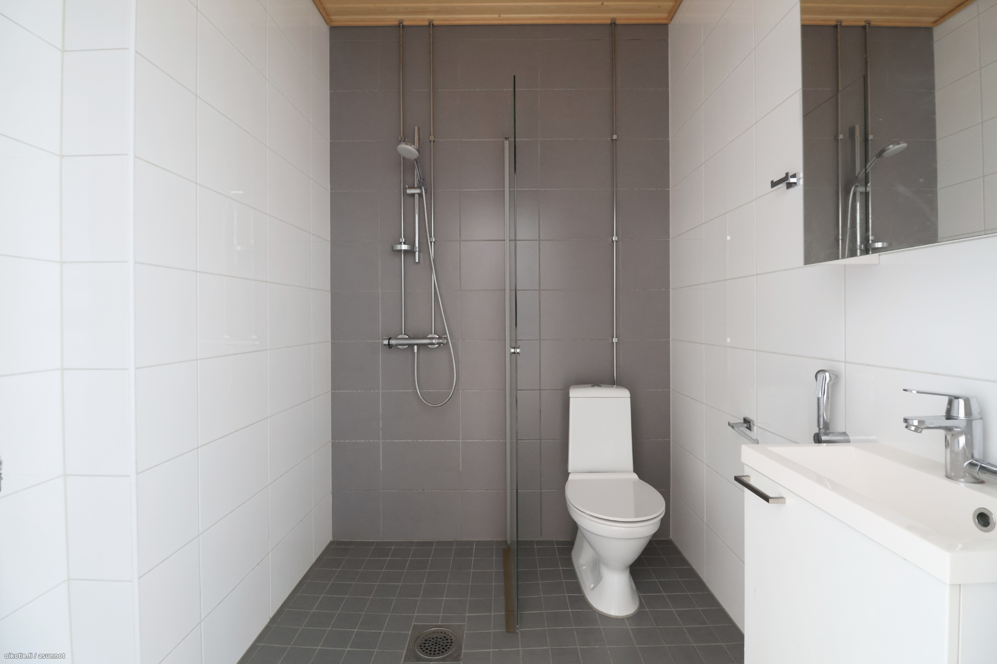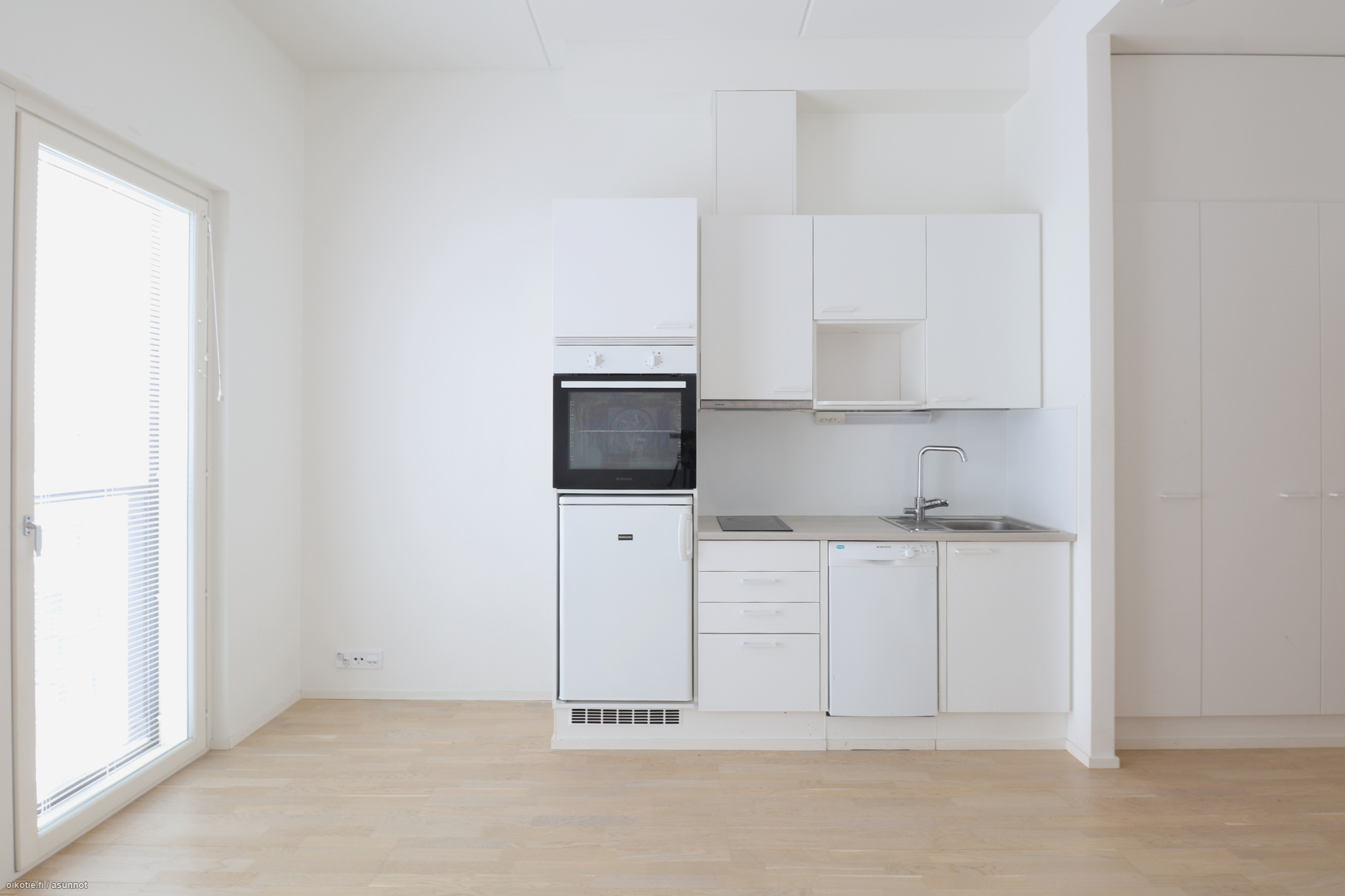 Asunnon lattia laminaattia ja seinät valkoisella maalipinnalla. Kylpyhuoneessa on liitäntä pyykinpesukoneelle.