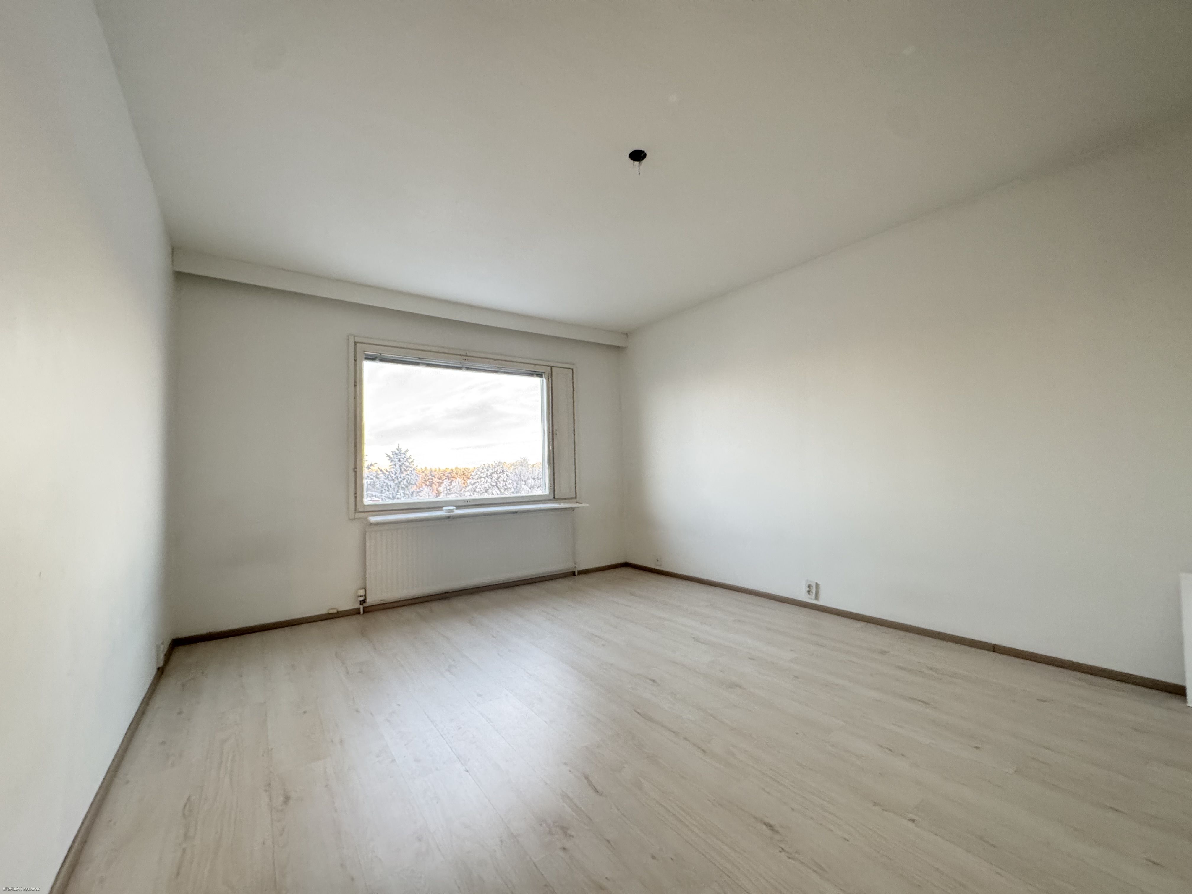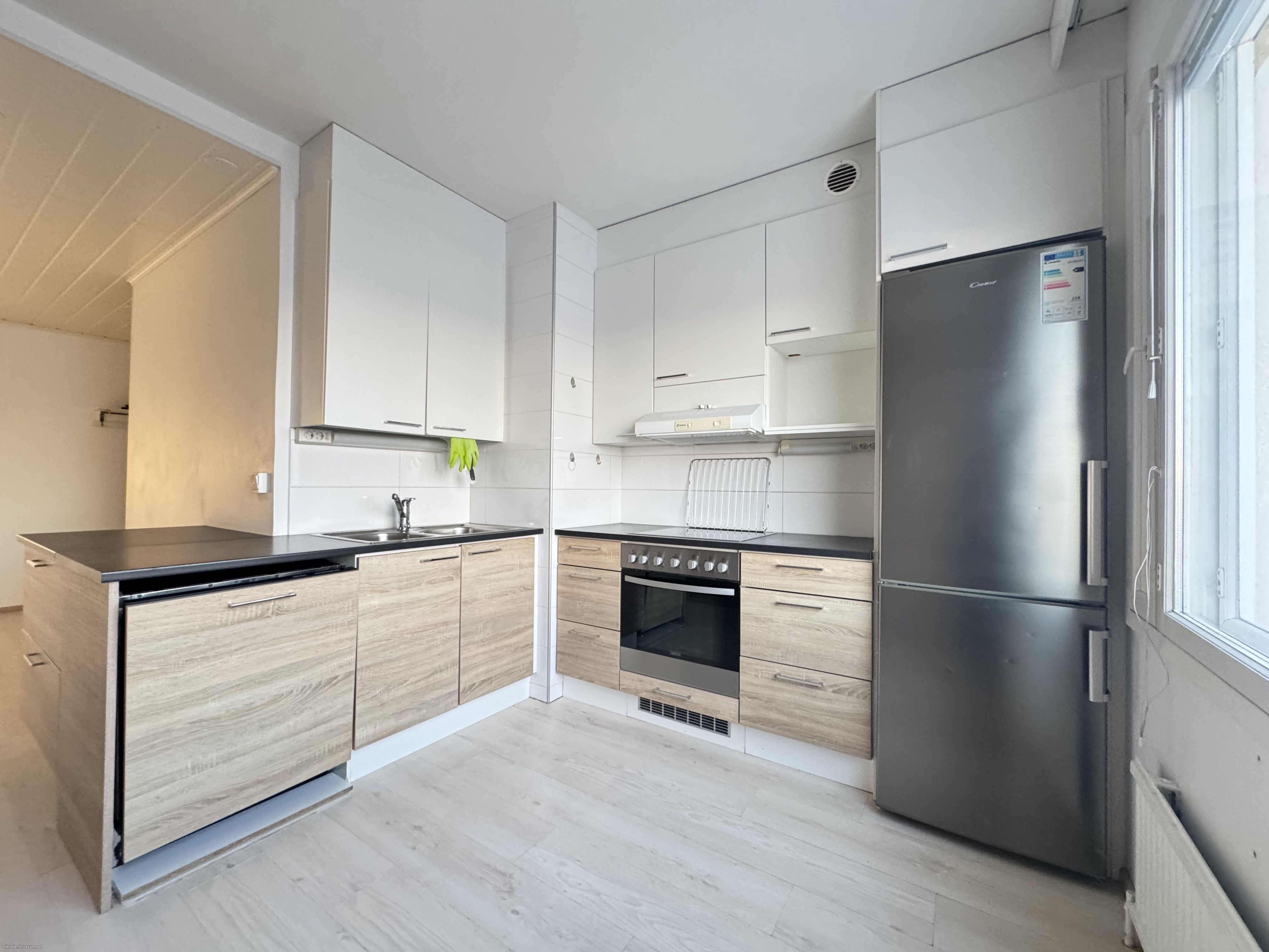 Huoneiston lattia laminaattia ja seinät siistein maalipinnoin. Modernin keittiön varusteluun kuuluu integroitu astianpesukone, uuni/liesi sekä jääkaappi/pakastin. Keittiössä myös tilavaraus mikroaaltouunille. Huoneistoon kuuluu oma parveke, joka tuo yhden huoneen lisää aina keväästä alkaen. Remontoidussa kylpyhuoneessa valmiiksi pyykinpesukone. Taloyhtiössä on juuri valmistunut julkisivu- ja parvekeremontti, joten lähes kaikki isoimmat remontit on jo takana päin!