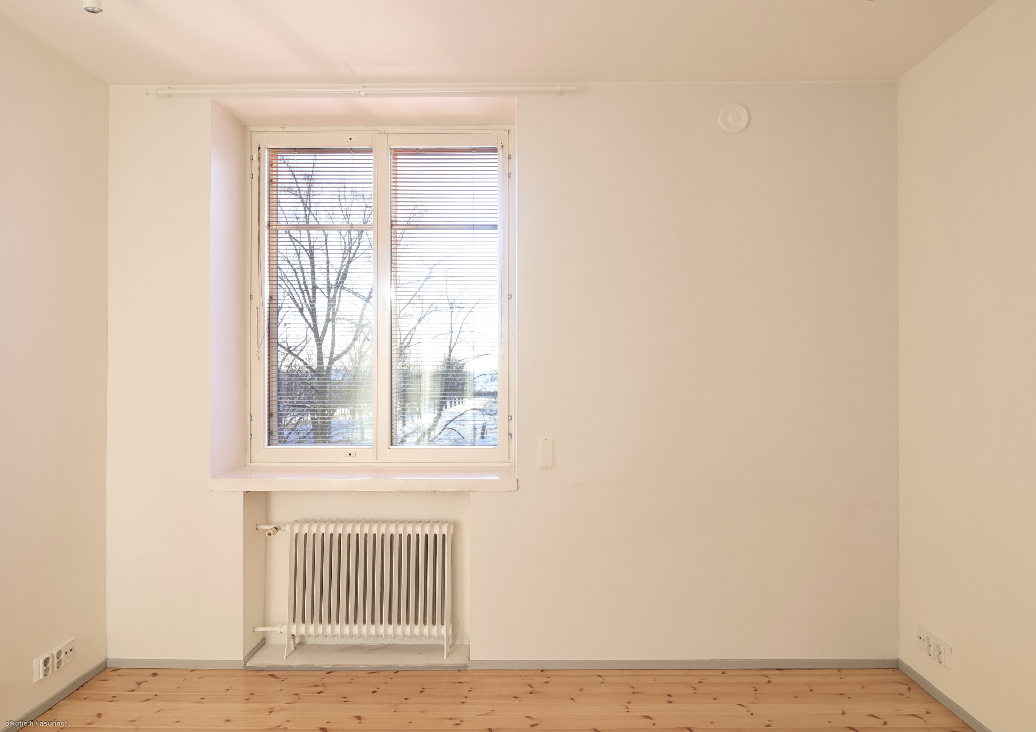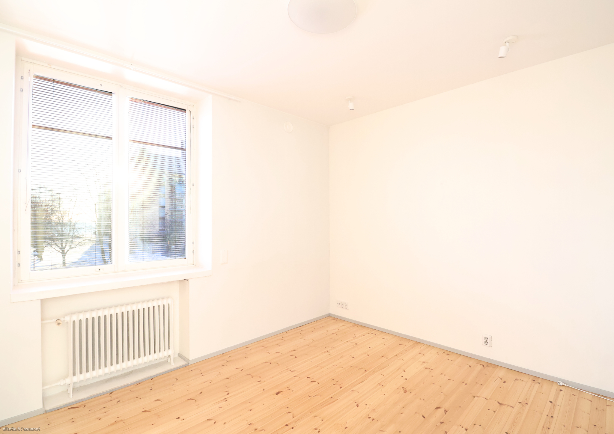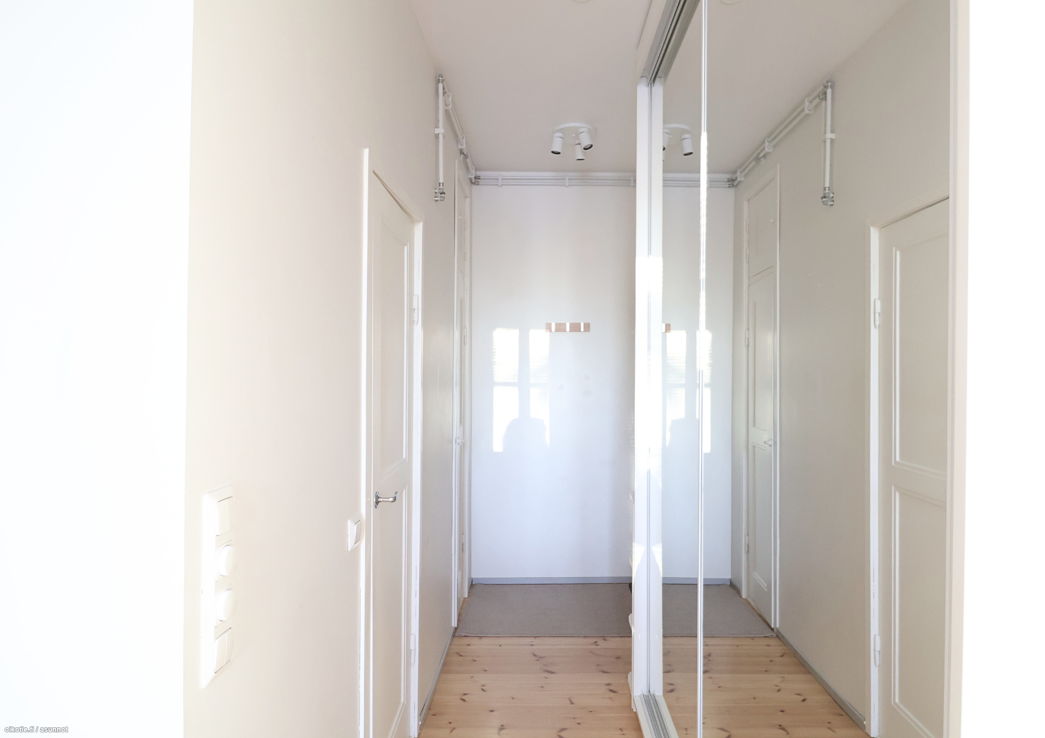 The apartment has recently been renovated and is in good condition. The building company’s major renovations have been completed. The apartment has a lovely plank floor, a large mirror cabinet in the hall, and the apartment has a washing machine in the cleaning closet. The kitchen equipment includes a fridge-freezer and an oven and stove. The large window offers a beautiful view of the park and partly of the sea. The high room height increases the sense of space in the apartment.