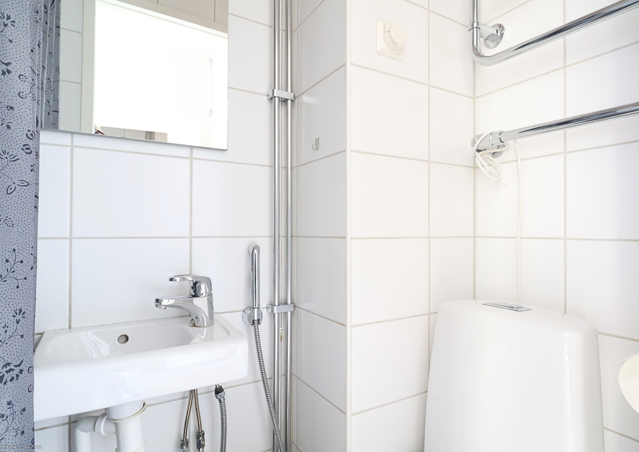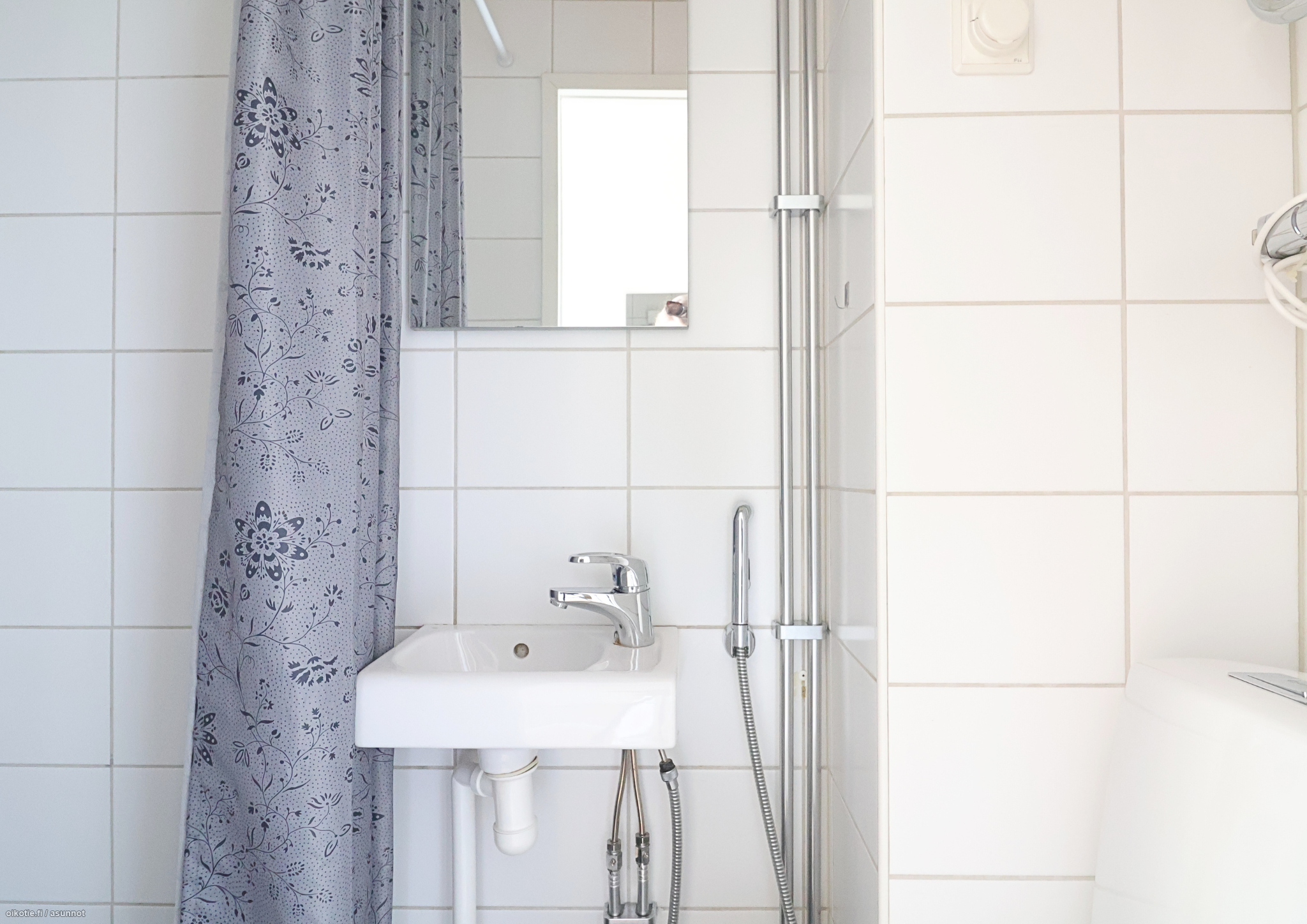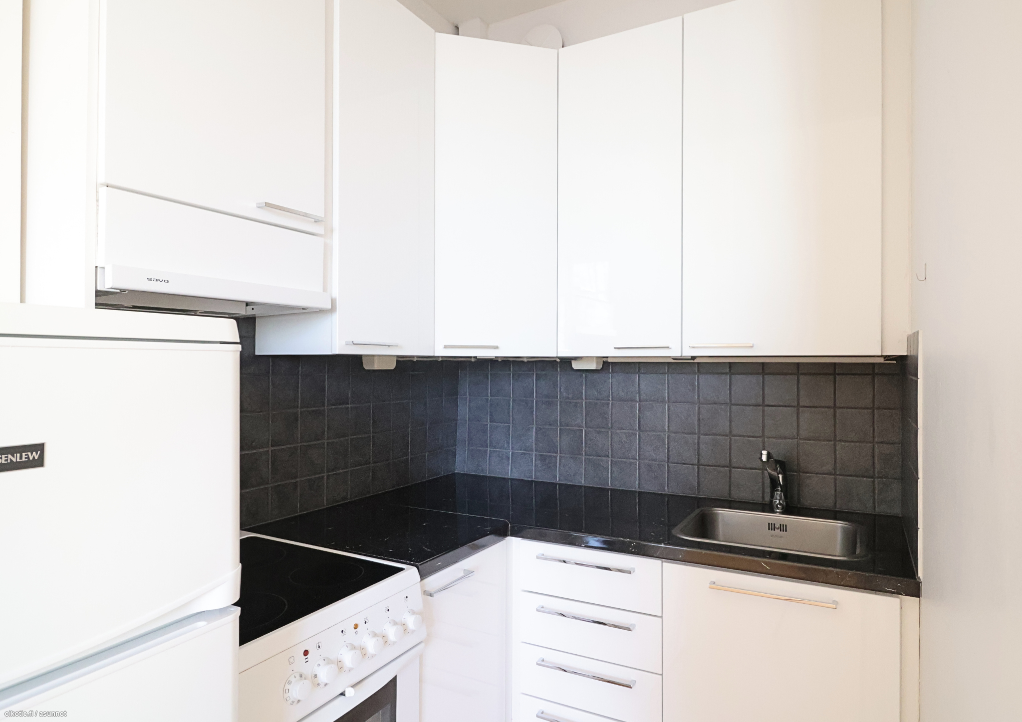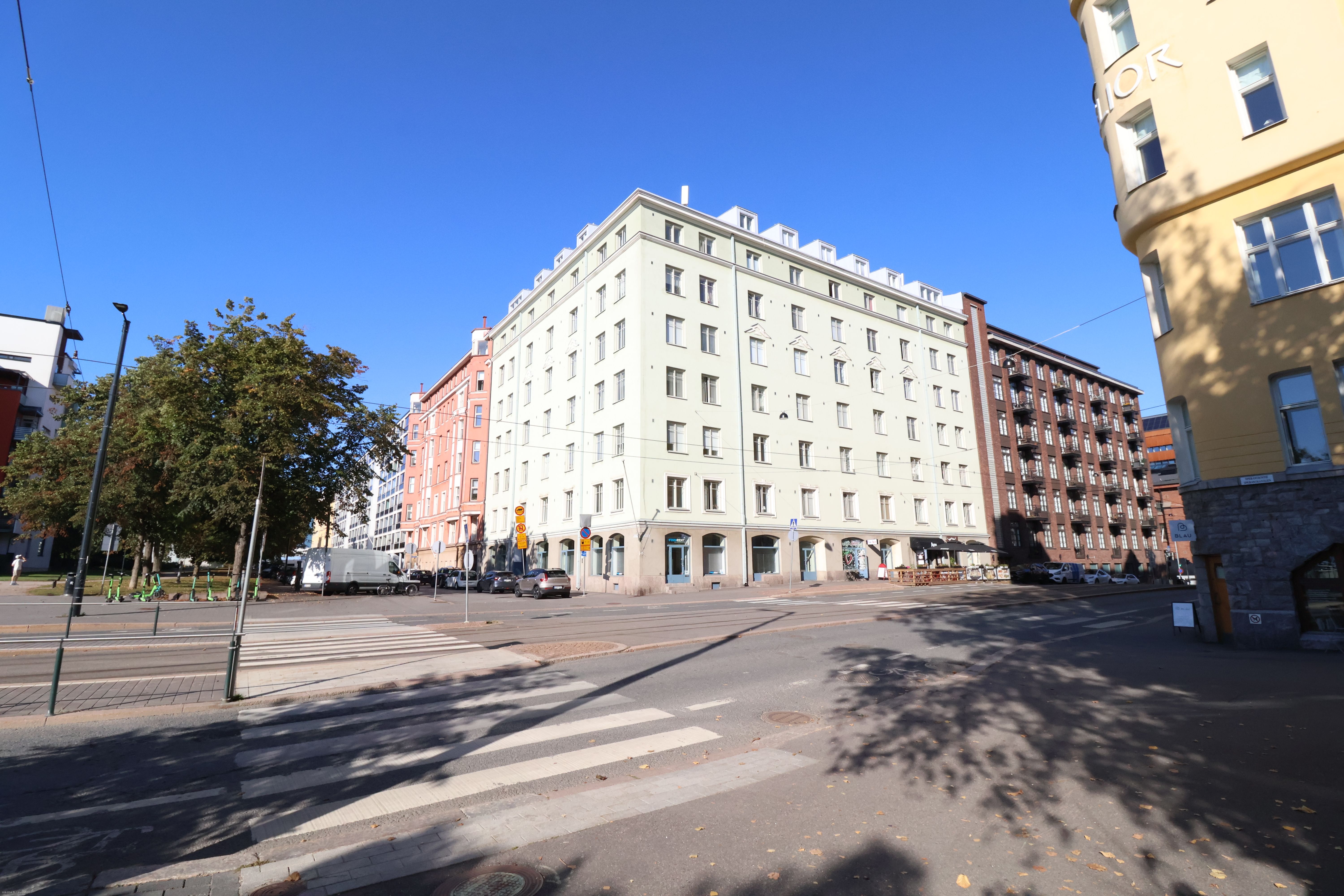 The apartment has recently been renovated and is in good condition. The building company’s major renovations have been completed. The apartment has a lovely plank floor, a large mirror cabinet in the hall, and the apartment has a washing machine in the cleaning closet. The kitchen equipment includes a fridge-freezer and an oven and stove. The large window offers a beautiful view of the park and partly of the sea. The high room height increases the sense of space in the apartment.