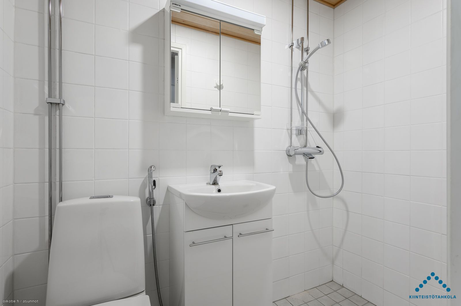 pesuhuoneen kalustuksia. Pyykinpesukoneelle on tehty paikka keittiön kalusteisiin. Lattiamateriaalina on vinyylilankku ja