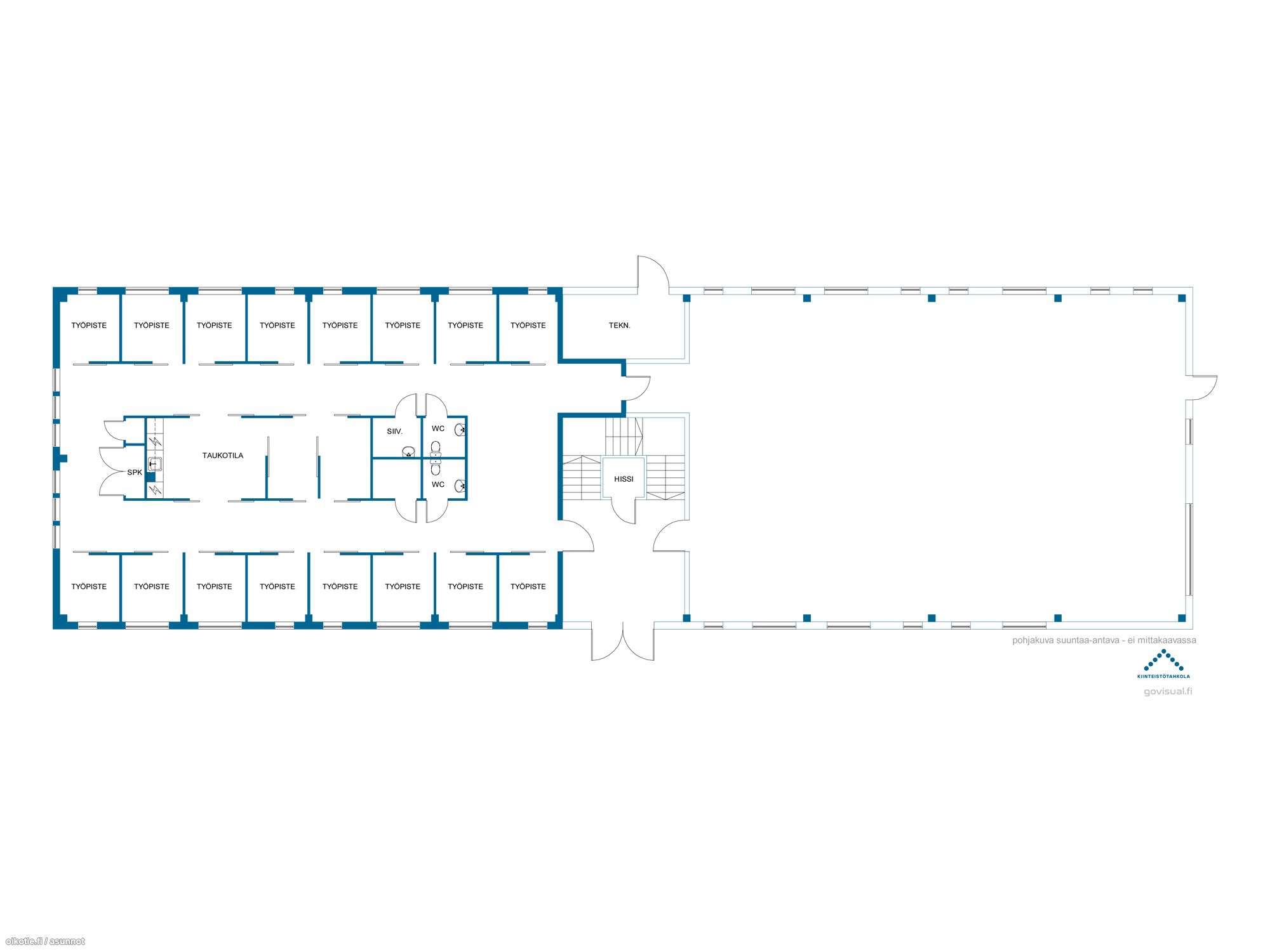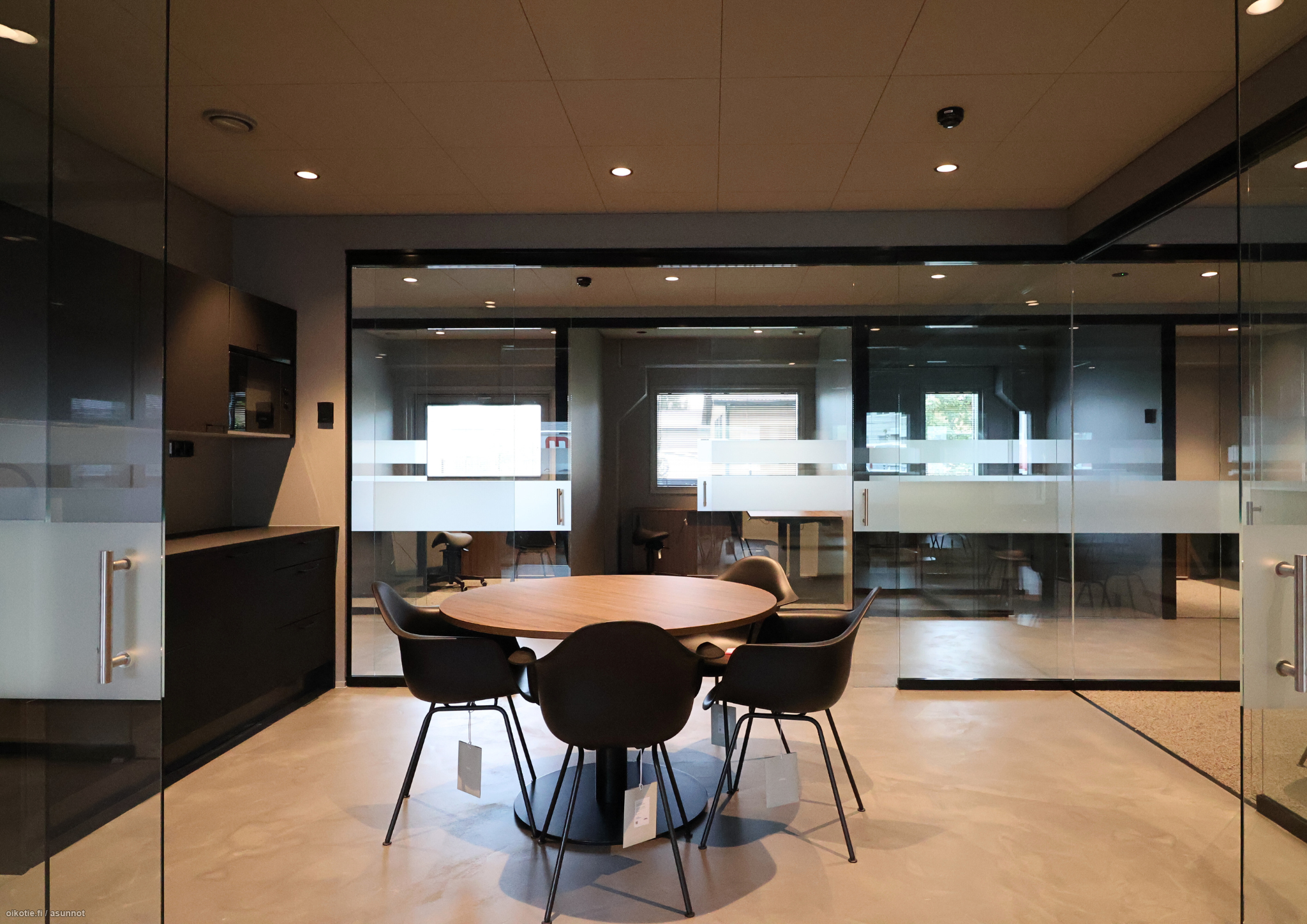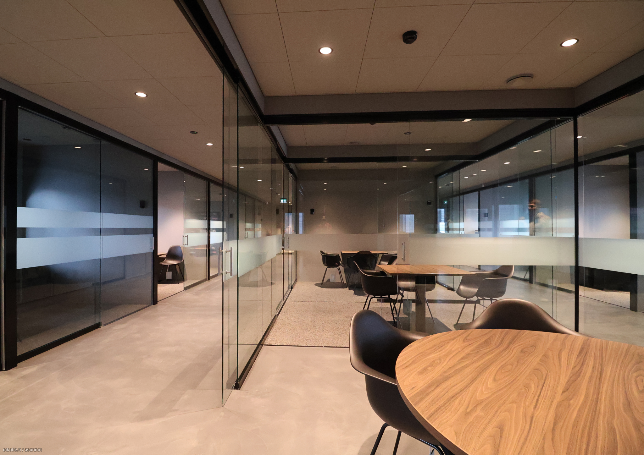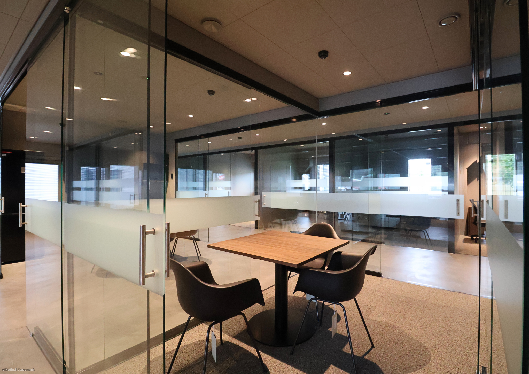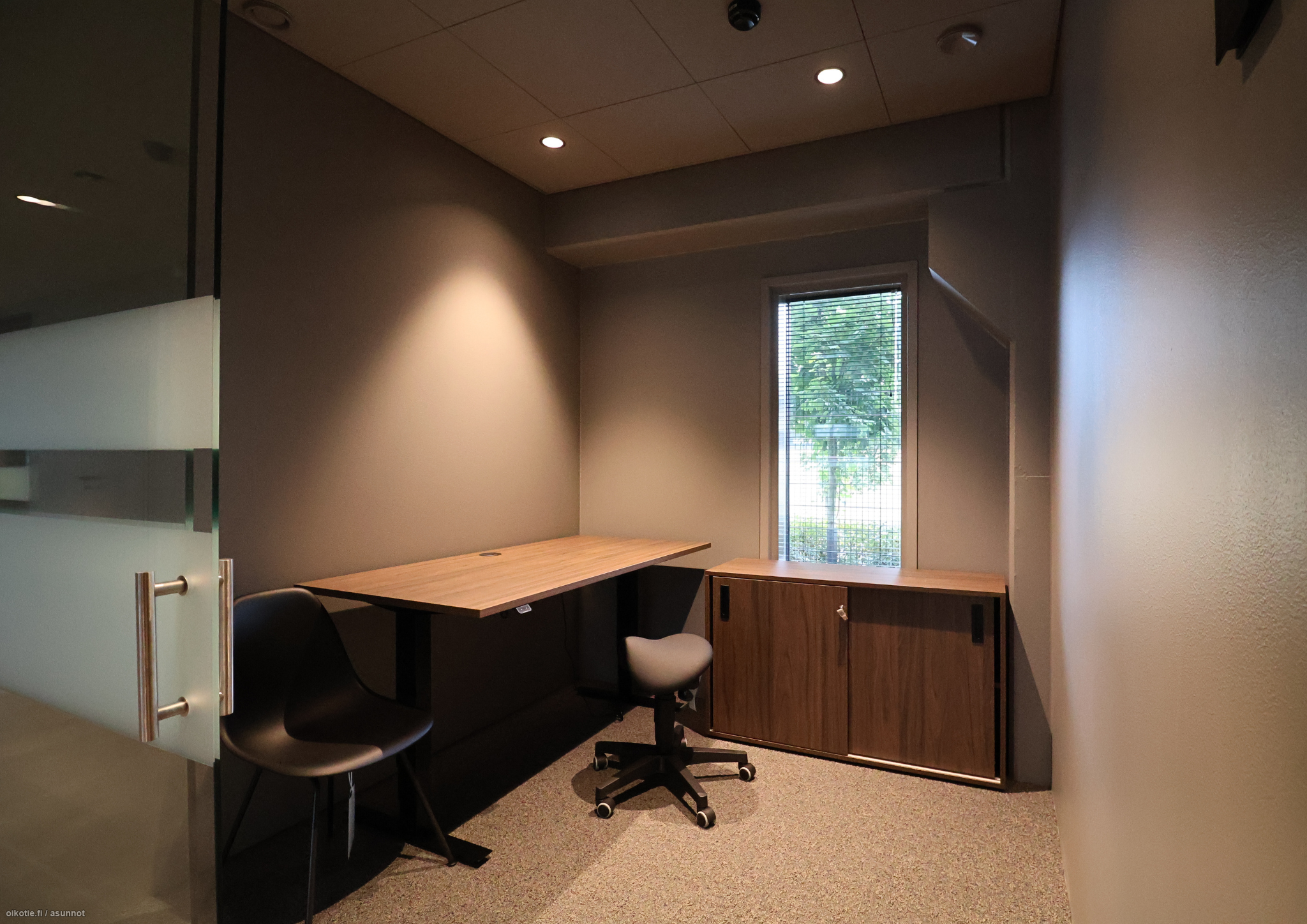 Tilat tarjoavat 16 erillistä lasiseinillä rajattua työpistettä, jotka luovat rauhallisen mutta avoimen työympäristön. Lisäksi käytössäsi on kaksi modernia neuvottelutilaa, jotka ovat tarvittaessa yhdistettävissä yhdeksi suureksi kokonaisuudeksi. Toimistossa on myös yhteinen keittiö ja viihtyisä taukotila sekä kaksi wc:tä.