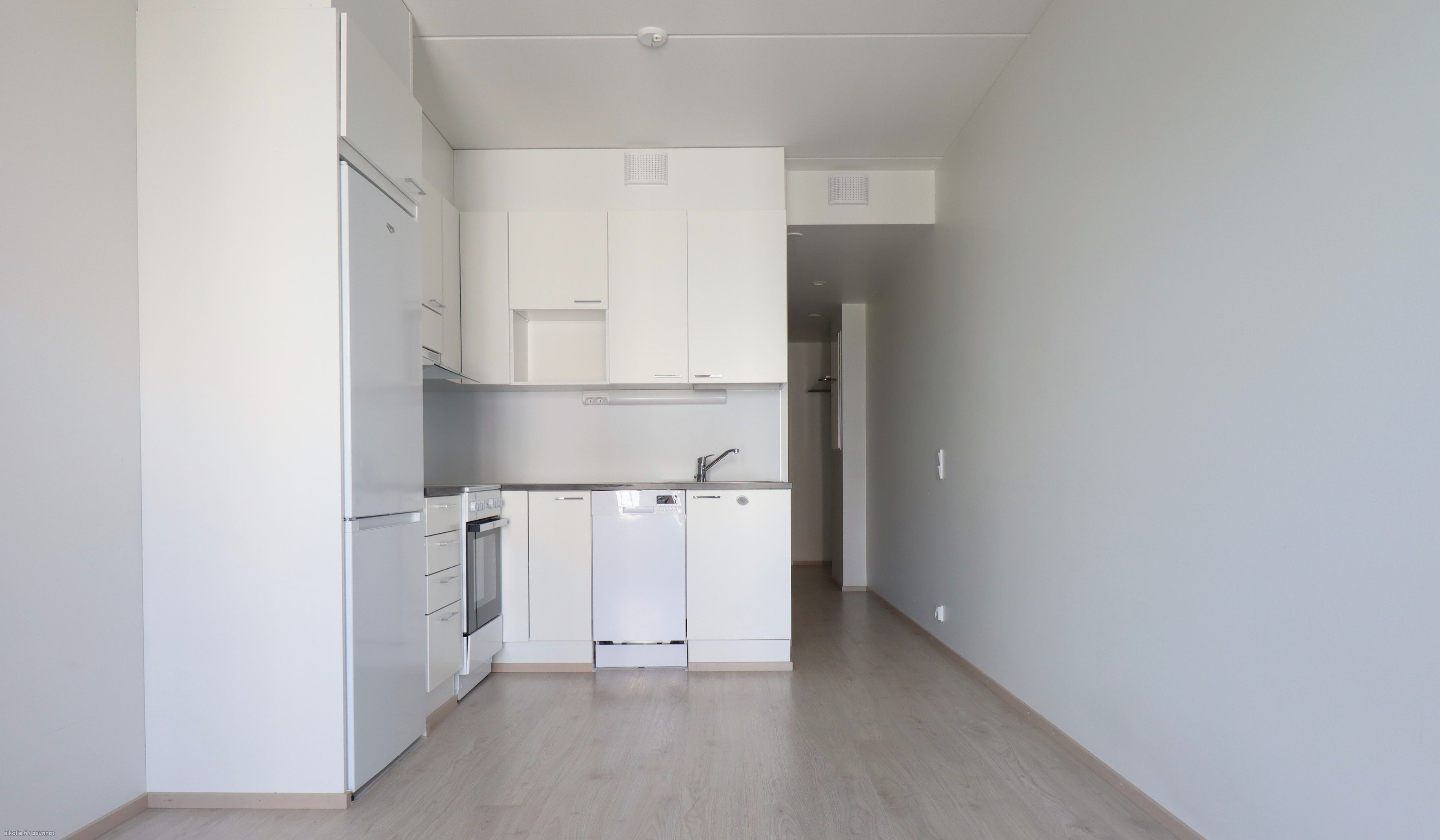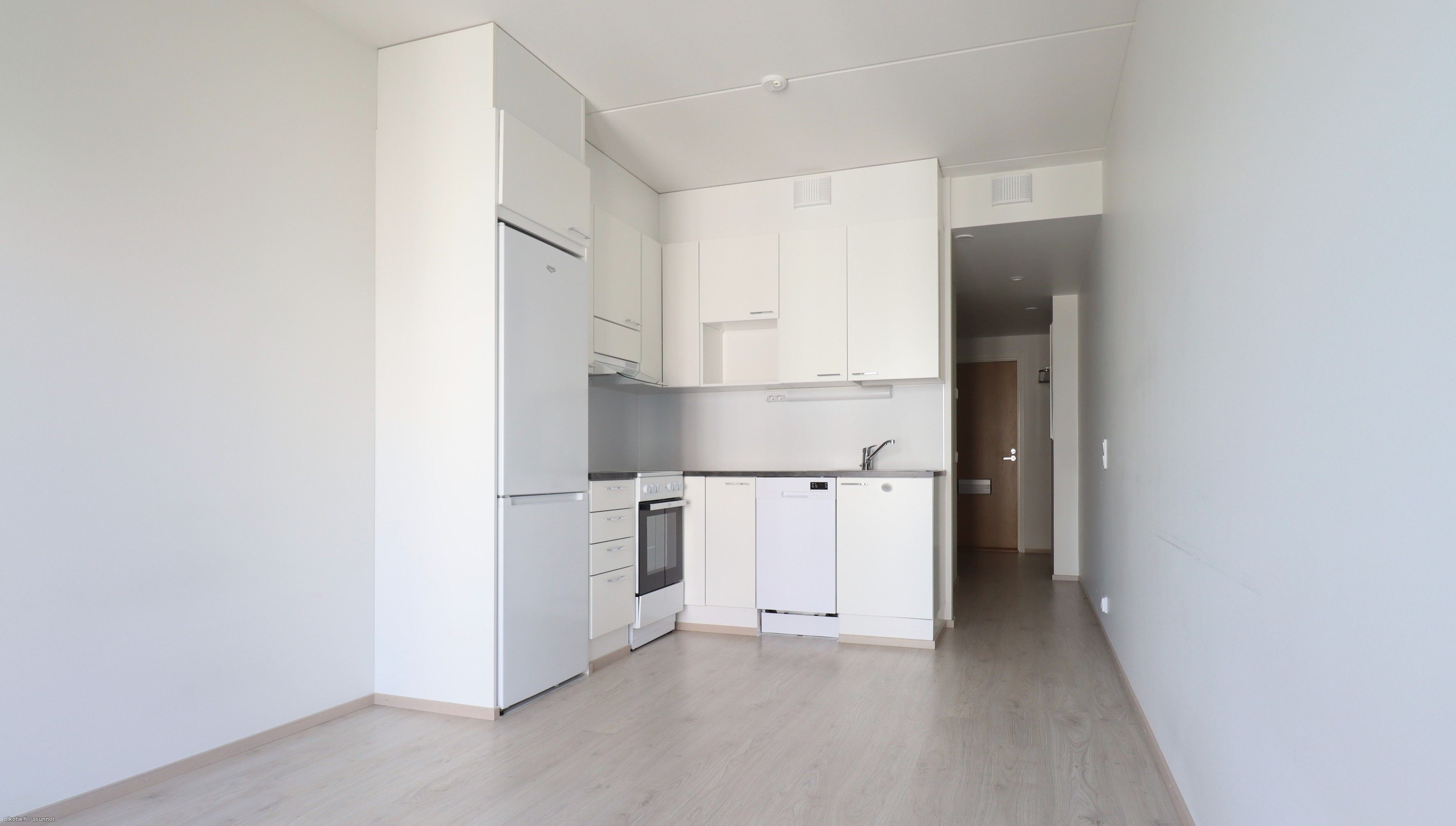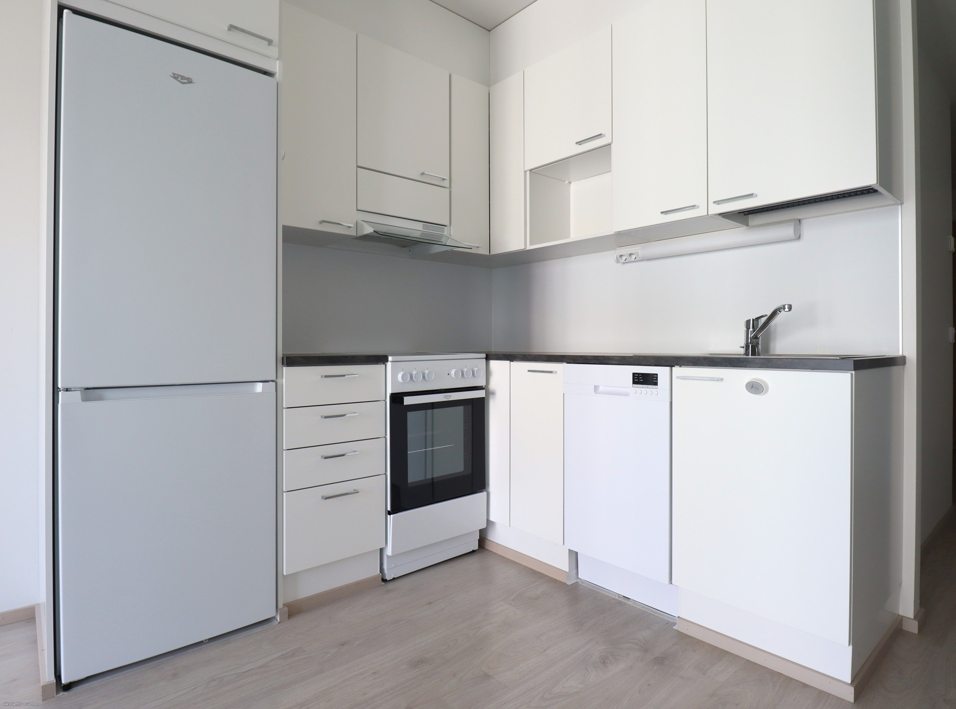 Asunnossa laminaattilattia ja seinät vaalealla maalipinnalla. Ikkunoissa ja parvekeovissa on sälekaihtimet. Keittiöstä löytyy jääkaappipakastin, uuni/liesi ja astianpesukone. Kylpyhuoneessa tilaa ja liitäntä pyykinpesukoneelle. Talo lämpenee kaukolämmöllä, lämmitys sisältyy vuokraan (pois lukien kylpyhuoneen sähköinen lattialämmitys).