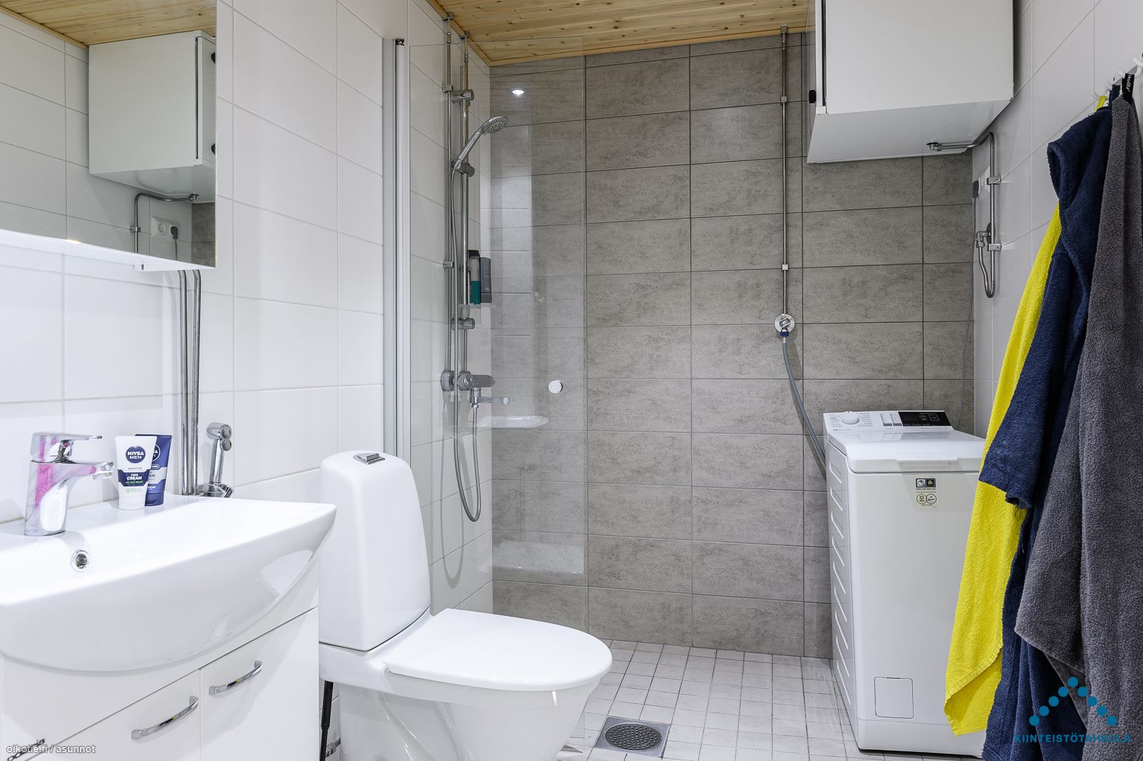 Keittiössä valmiina liesi, liesituuletin astianpesukone sekä jääkaappipakastin. Kaakeloidussa kylpyhuoneessa paikka ja liitännät omalle pyykinpesukoneelle.