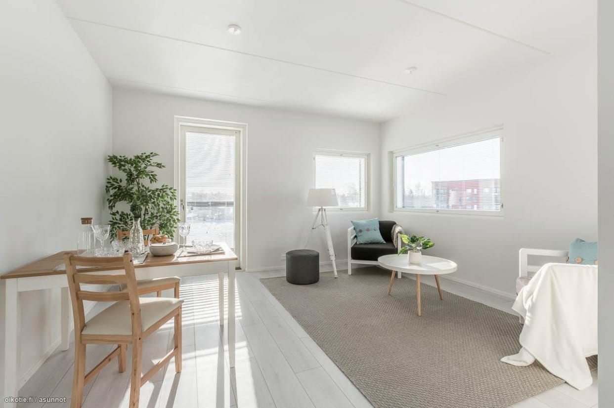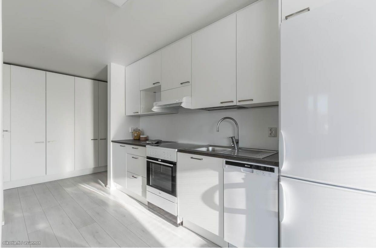 Asunnon lattia laminaattia ja seinät vaalealla maalipinnalla. Keittiö varustettu nykyaikaisilla kodinkoneilla, mm. keraaminen liesi ja astianpesukone kuuluu vakiovarusteisiin. Kylpyhuoneessa liitäntä pyykinpesukoneelle. Taloyhtiössä kaksi saunaa, joista voi varata erikseen vuoron taloyhtiön hinnaston mukaan. Vuokraan sisältyy lämmitys ja taloyhtiölaajakaista.