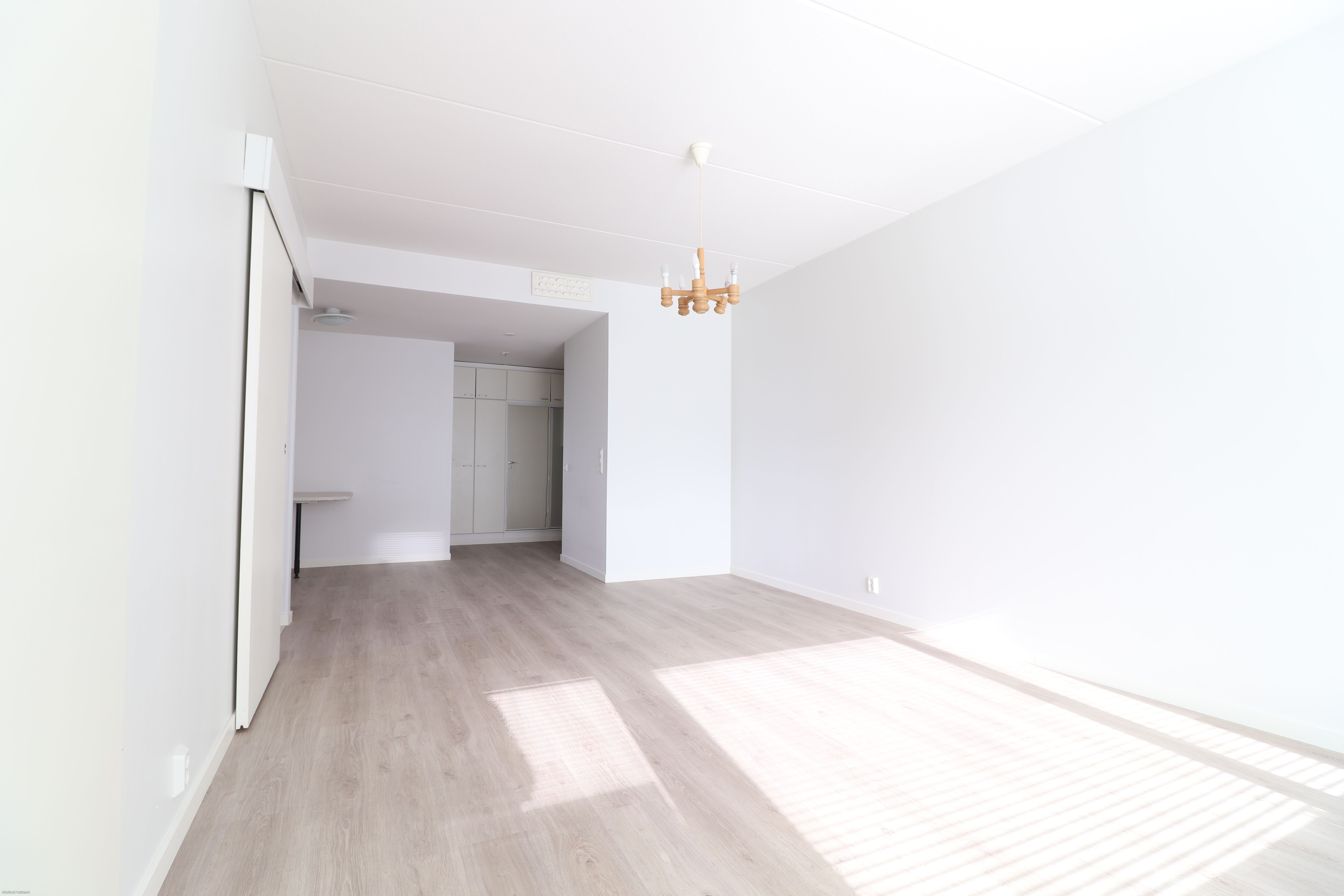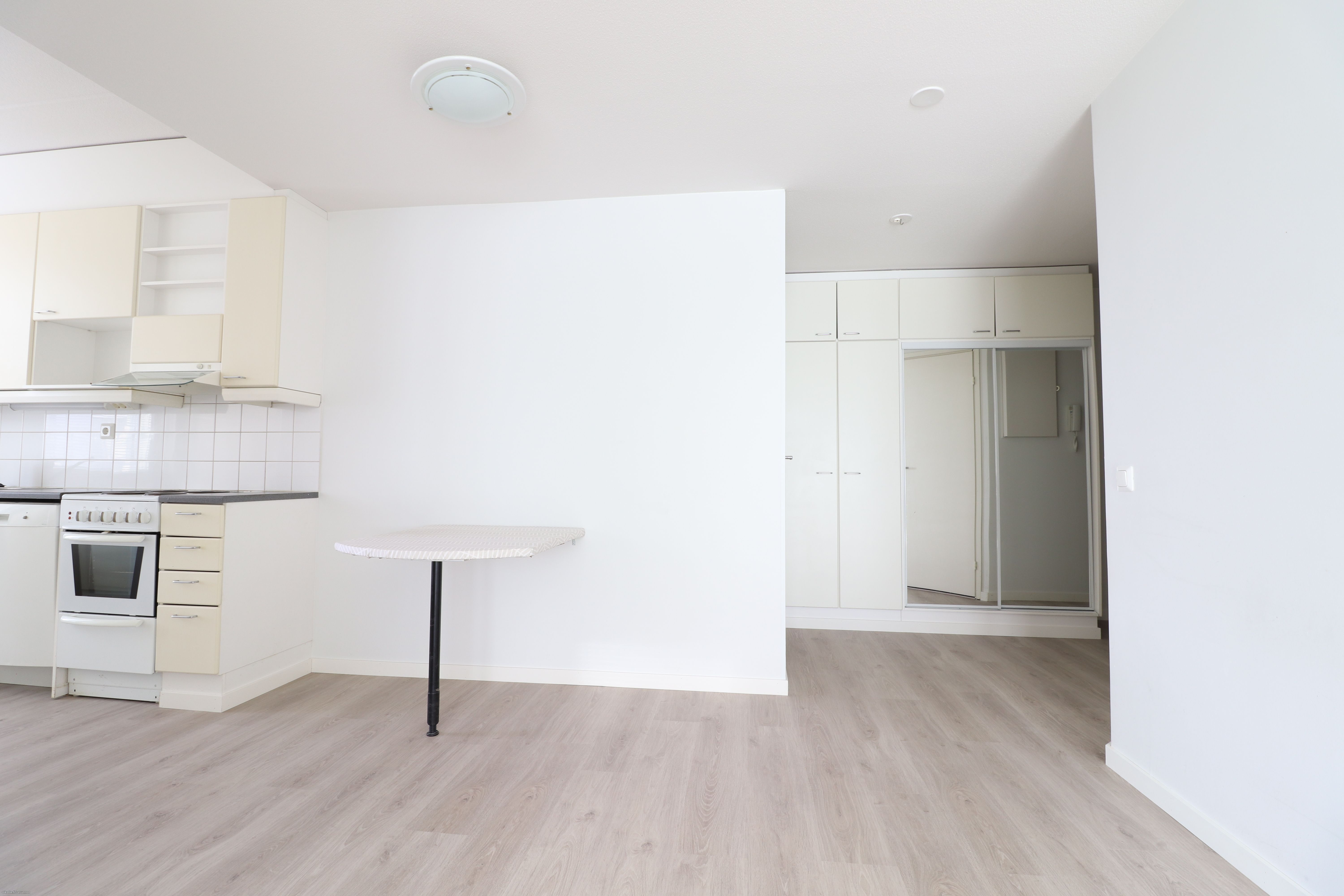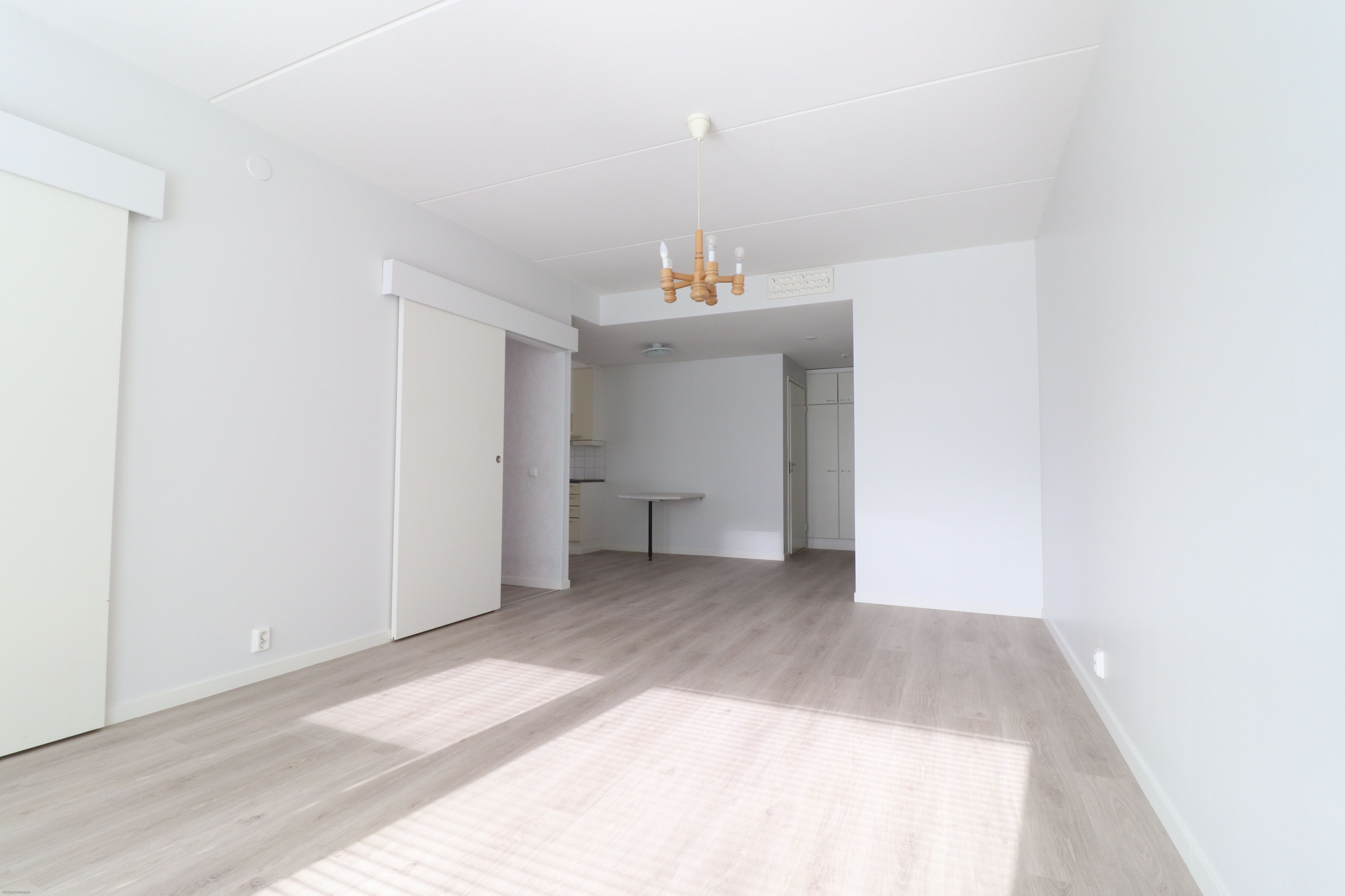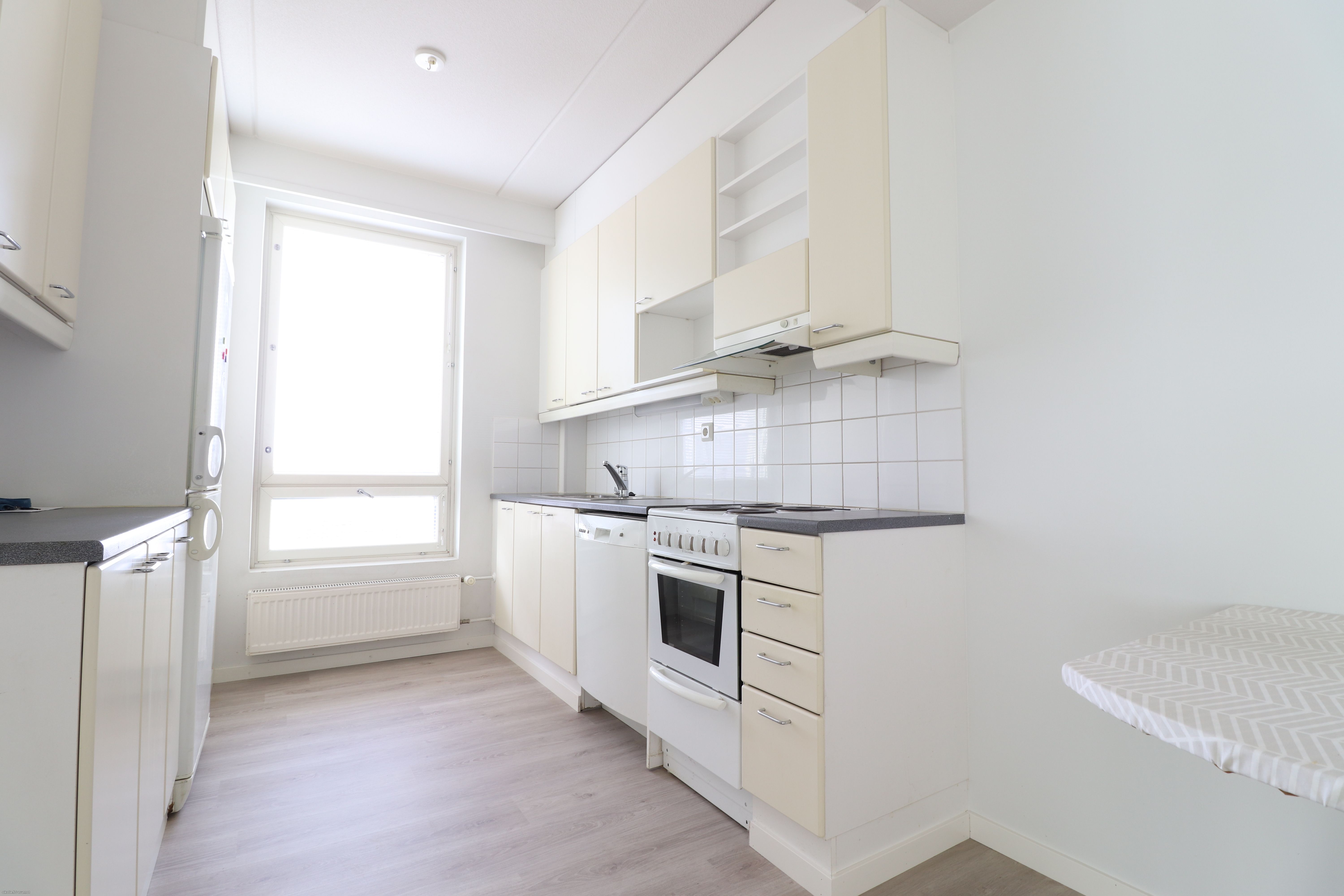 Lattiat uusittua muutama vuosi sitten, vaaleaa laminaattia, myös seinät ovet siistit maalipinnoin, osin tapettia. Kylpyhuone laattaa, jossa lattialämmitys sekä paikka pyykinpesukoneelle. Keittiöstä löytyy hyvin säilytystilaa, asunnossa oleva astianpesukone jää vuokralaisen käyttöön.