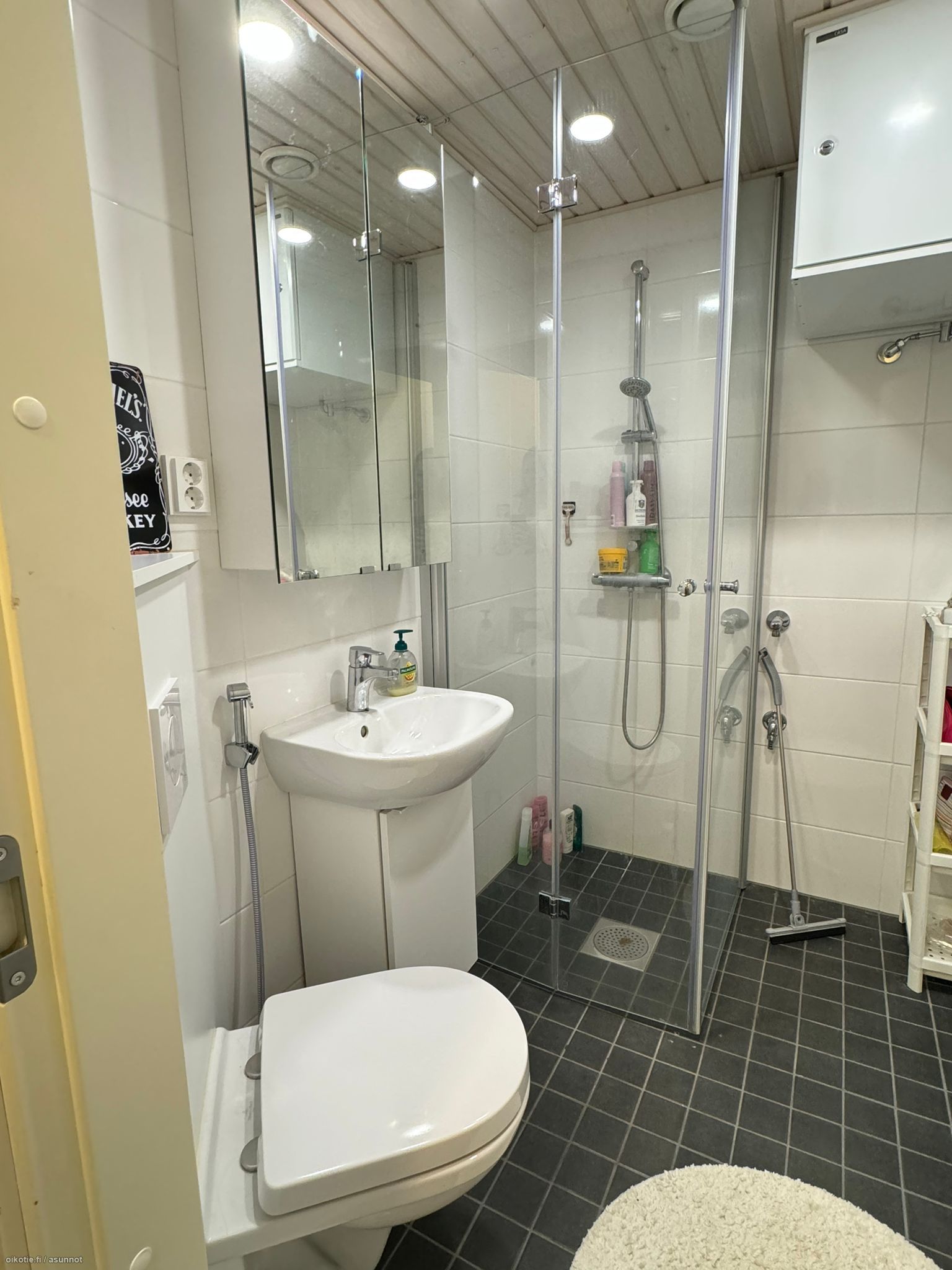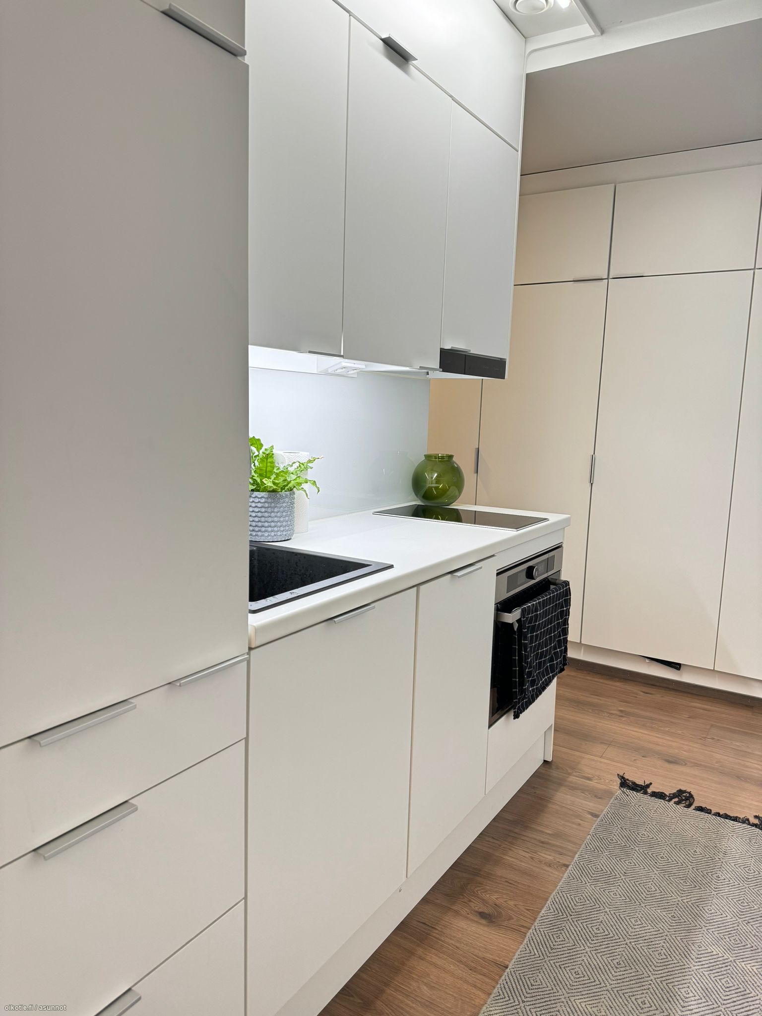 Tämän kolmannen (3/5) kerroksen asunnon pohjaratkaisu on erinomainen. Asunnon lattiat on laminaattia ja seinäpinnat valkoiseksi maalatut. Keittiössä on yhdistelmäuuni, jossa mikroaalto ja kiertoilma toiminto, 2-levyinen induktioliesitaso, integroitu jääkaappi pakastelokerolla ja astianpesukone. Laatoitetussa kylpyhuoneessa on paikka ja liitännät pyykinpesukoneelle. Kodissa myös ranskalainen parveke. Mahdollista vuokrata asunnon mukana pistokkeellinen autohallipaikka hintaan 80€/kk.