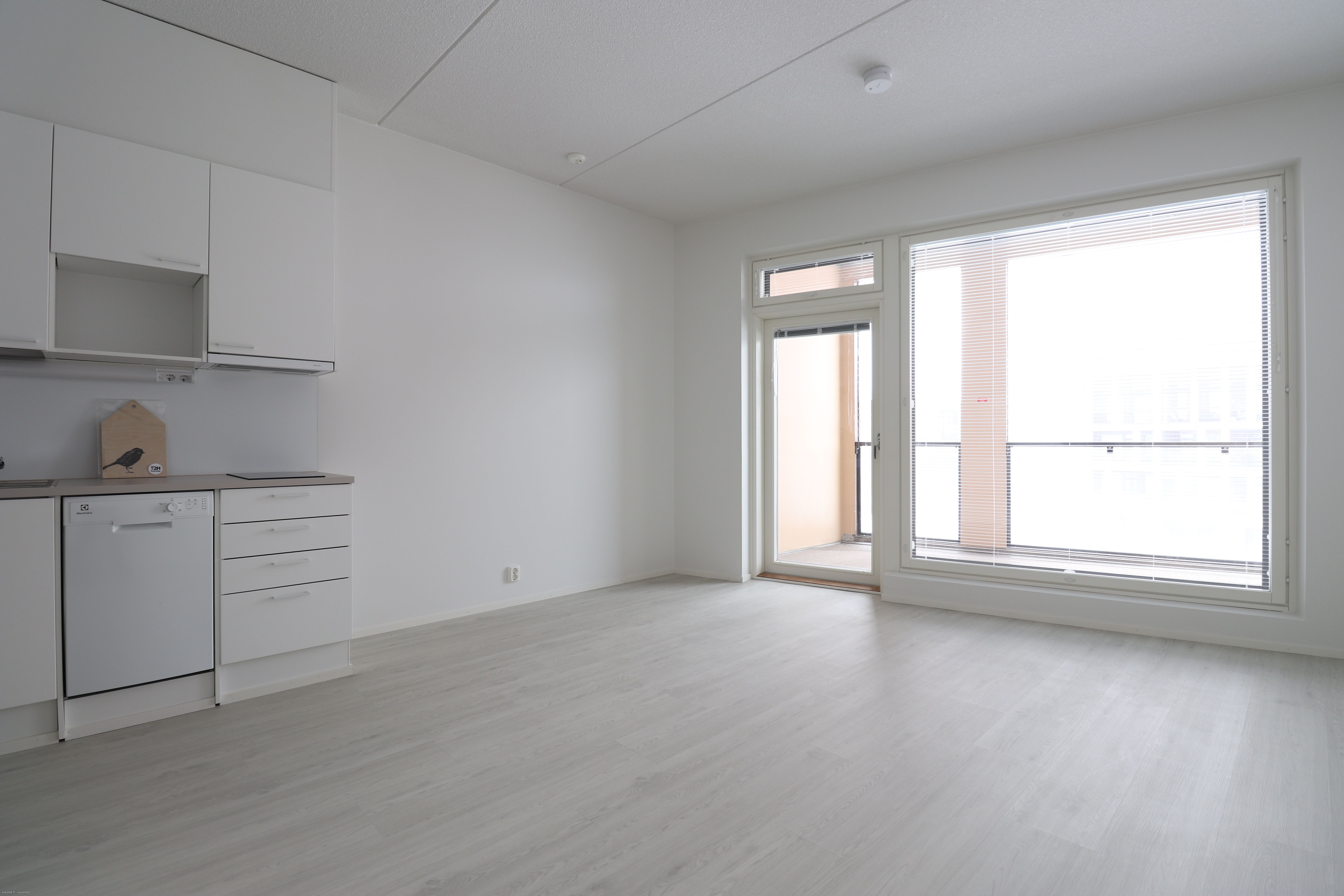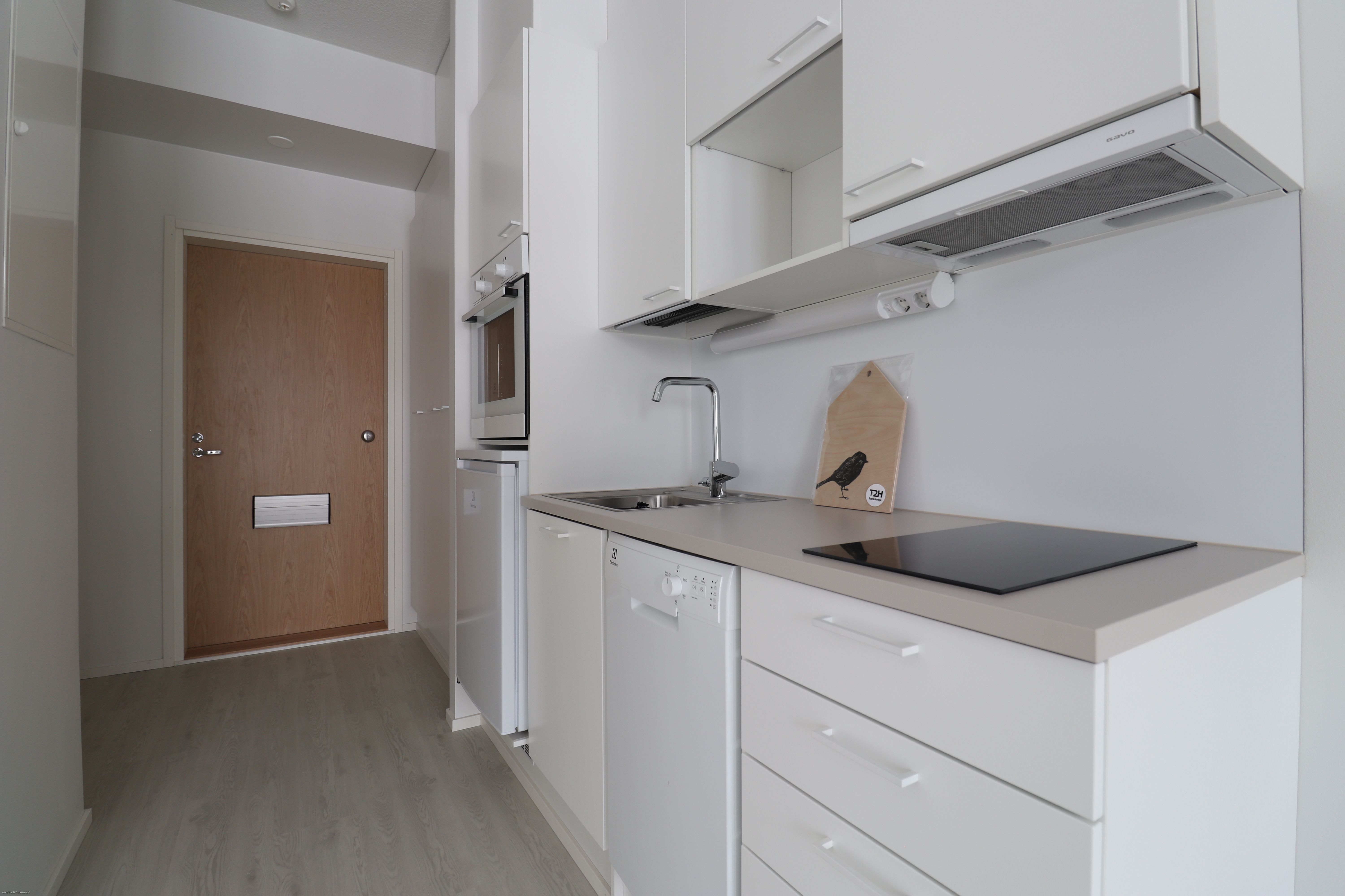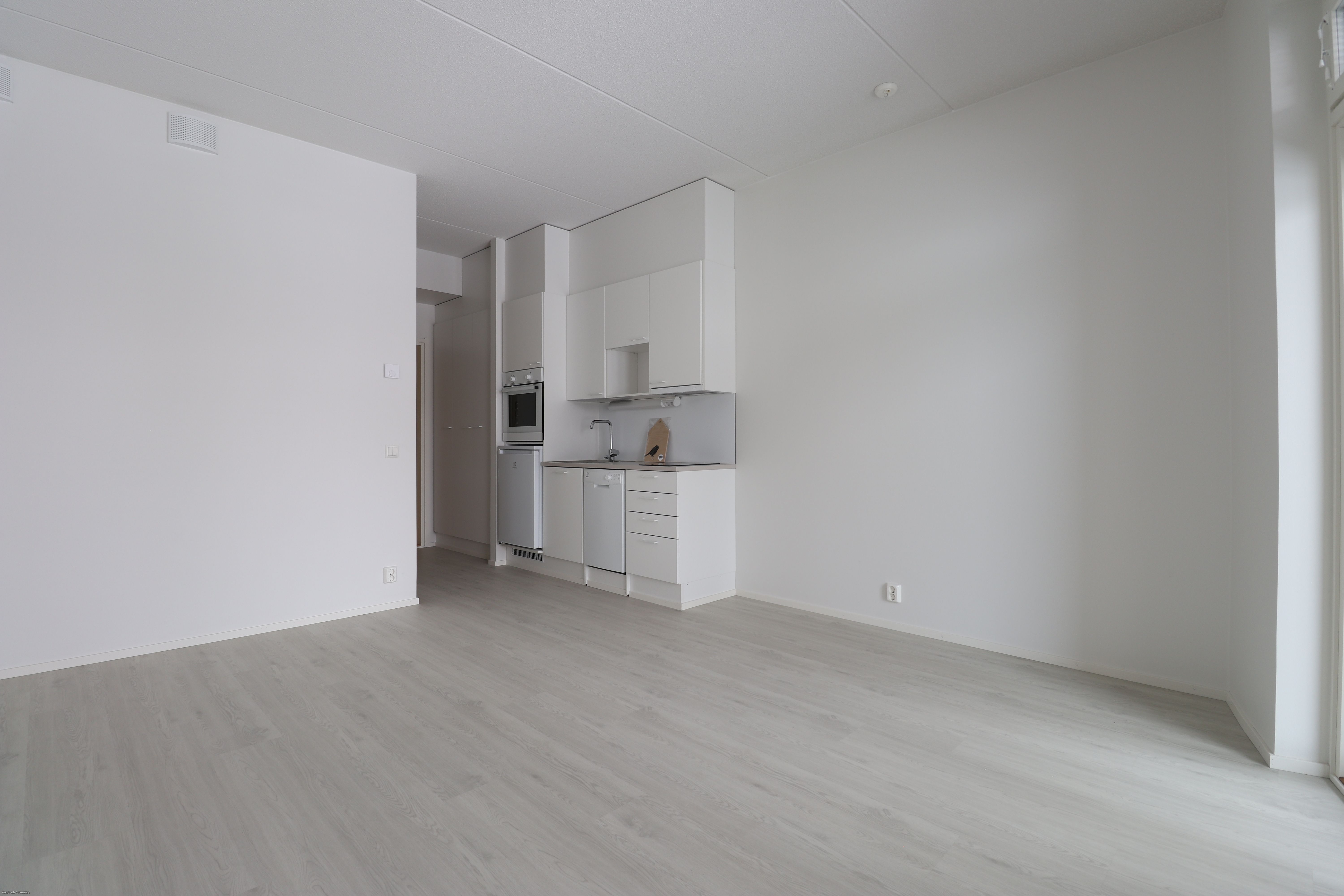 Asunnon lattia on tammilautaparkettia ja seinät raikkain maalipinnoin. Keittiöstä löytyy seuraavat kodinkoneet: astianpesukone, kalusteuuni, kahden levyn keraaminen liesitaso sekä jääkaappi pakastelokerolla. Tilavassa kylpyhuoneessa on liitäntä pyykinpesukoneelle. Todella tilava parveke on kuin yksi huone lisää.