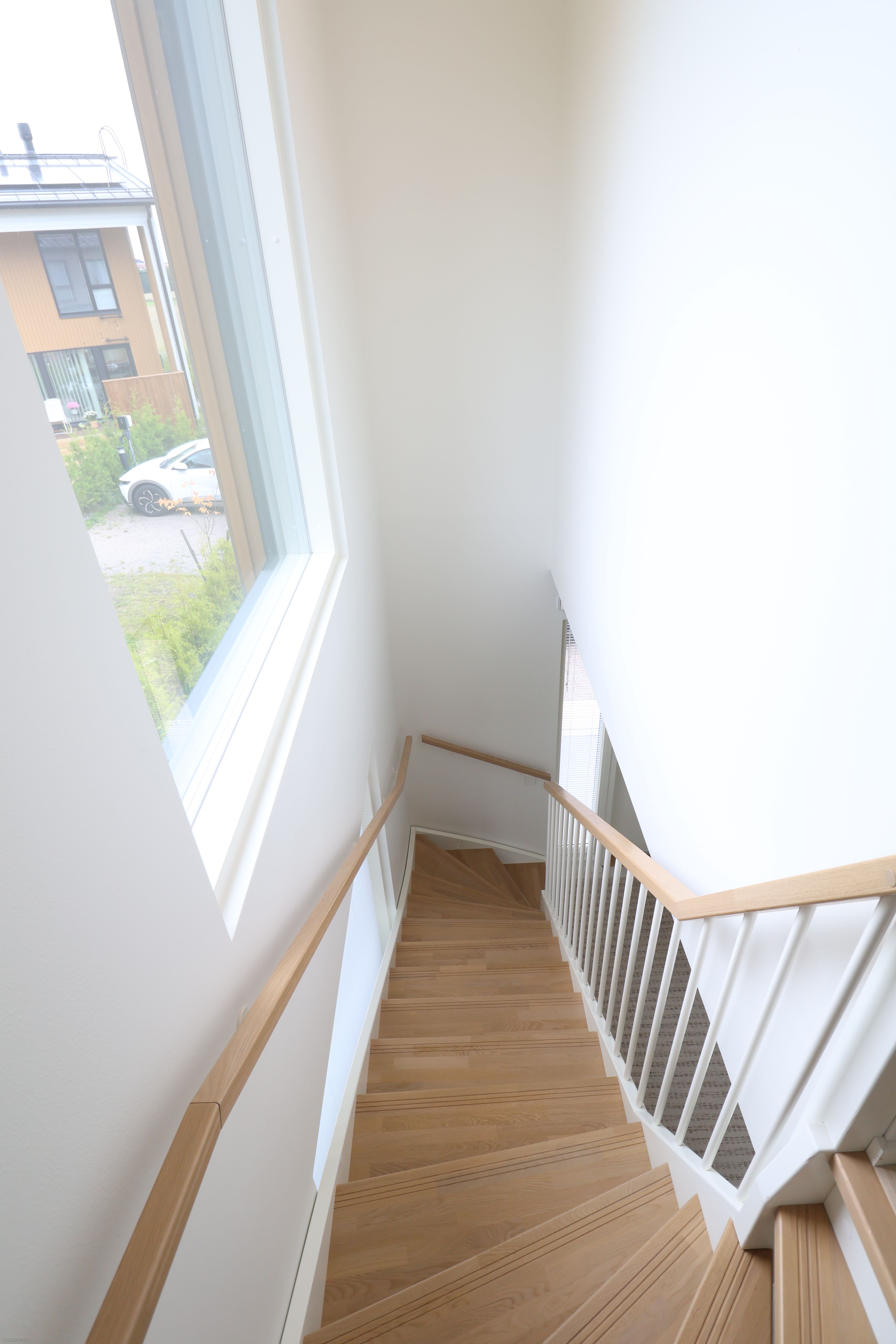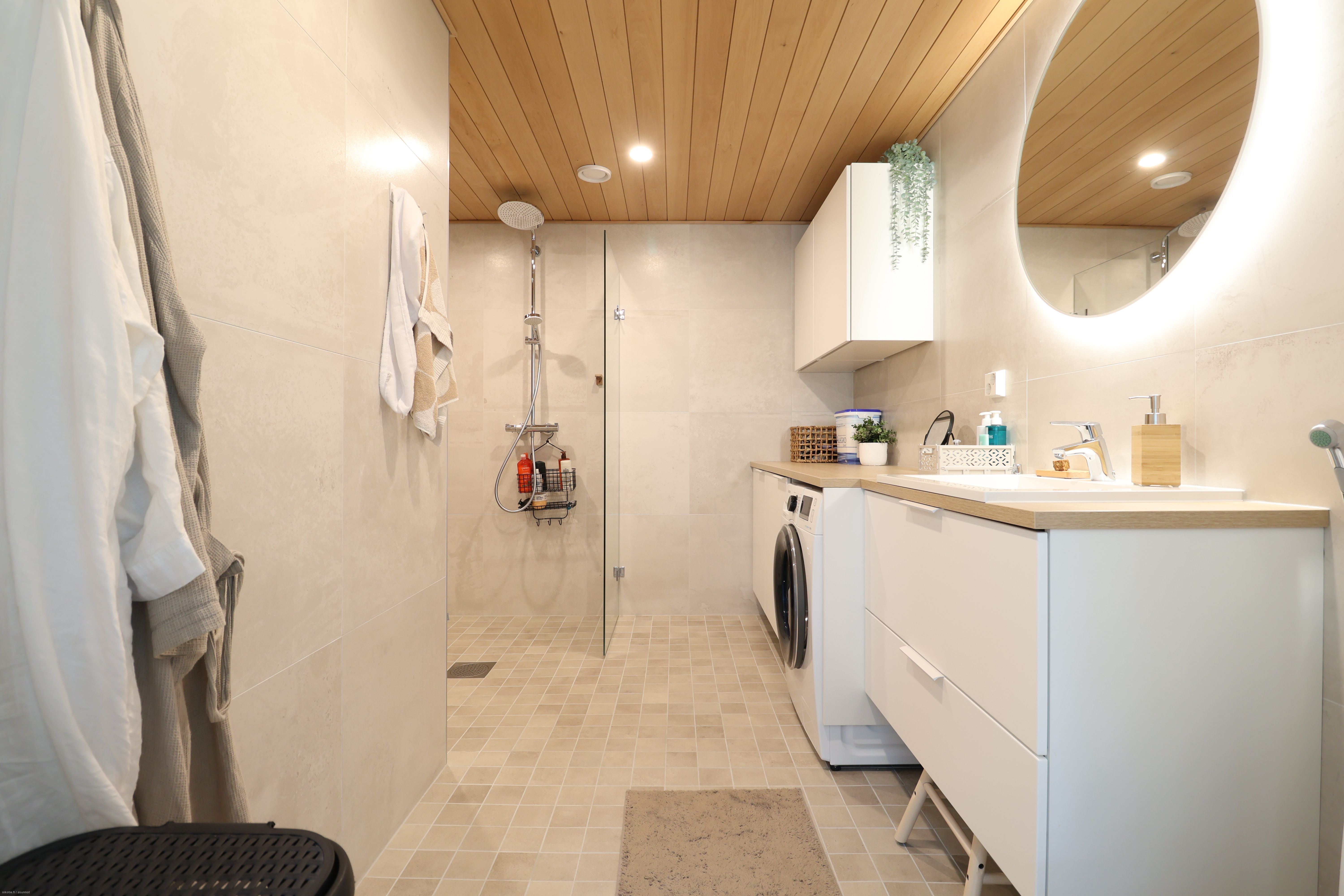 Yksityisyyttä tarjoavat yläkertaan sijoittuvat makuuhuoneet sekä erillinen wc. Säilytystilaa on runsaasti kiinteiden kaapistojen lisäksi myös lämpimässä ulkovarastossa. Kylpyhuoneessa on suunniteltu tarkkaan niin peseytymisen, pyykkihuollon kuin arjen hemmottelun tarpeet – kokonaisuuden viimeistelee oma sauna. Lisäksi oma terassi kutsuu nauttimaan kesäpäivistä ulkona.