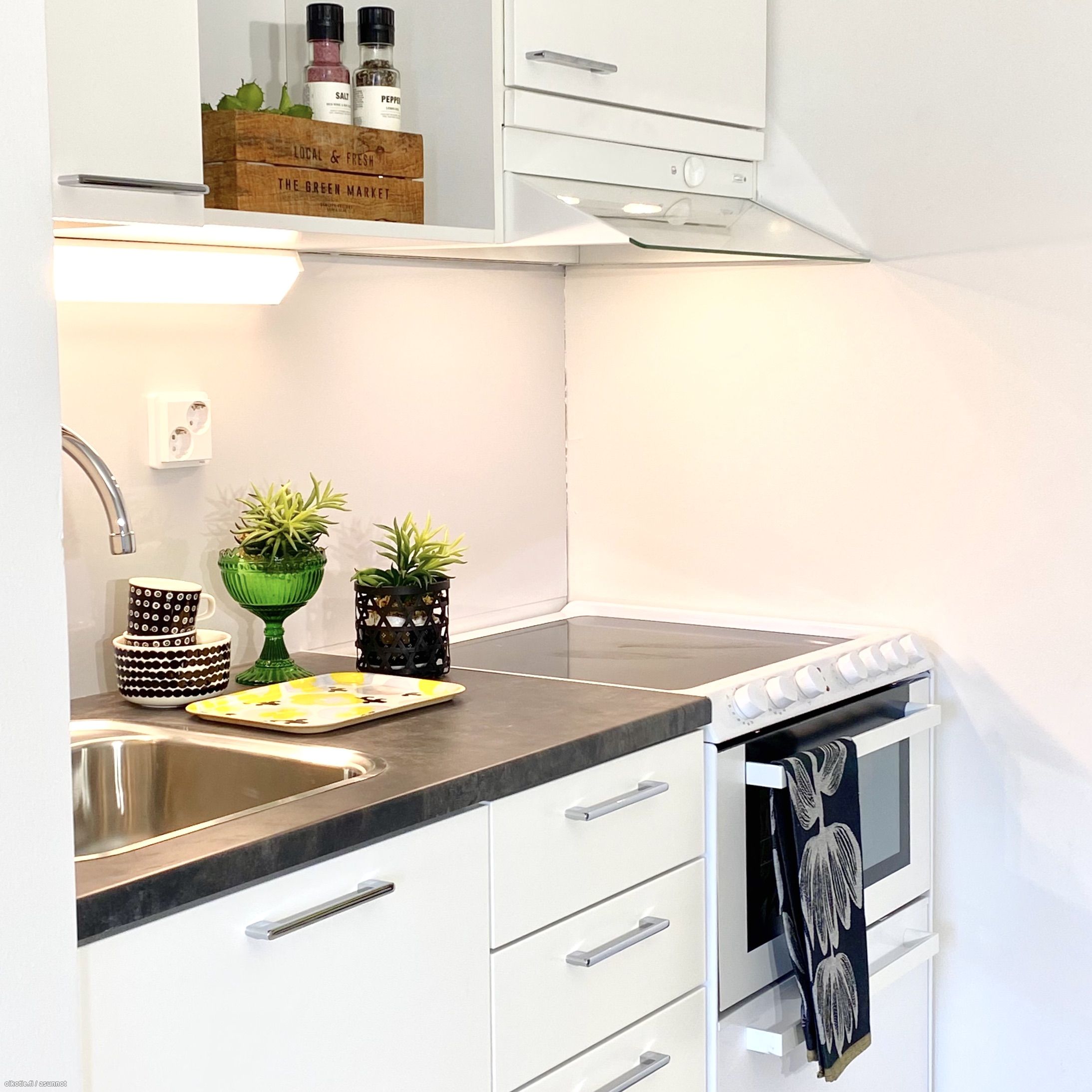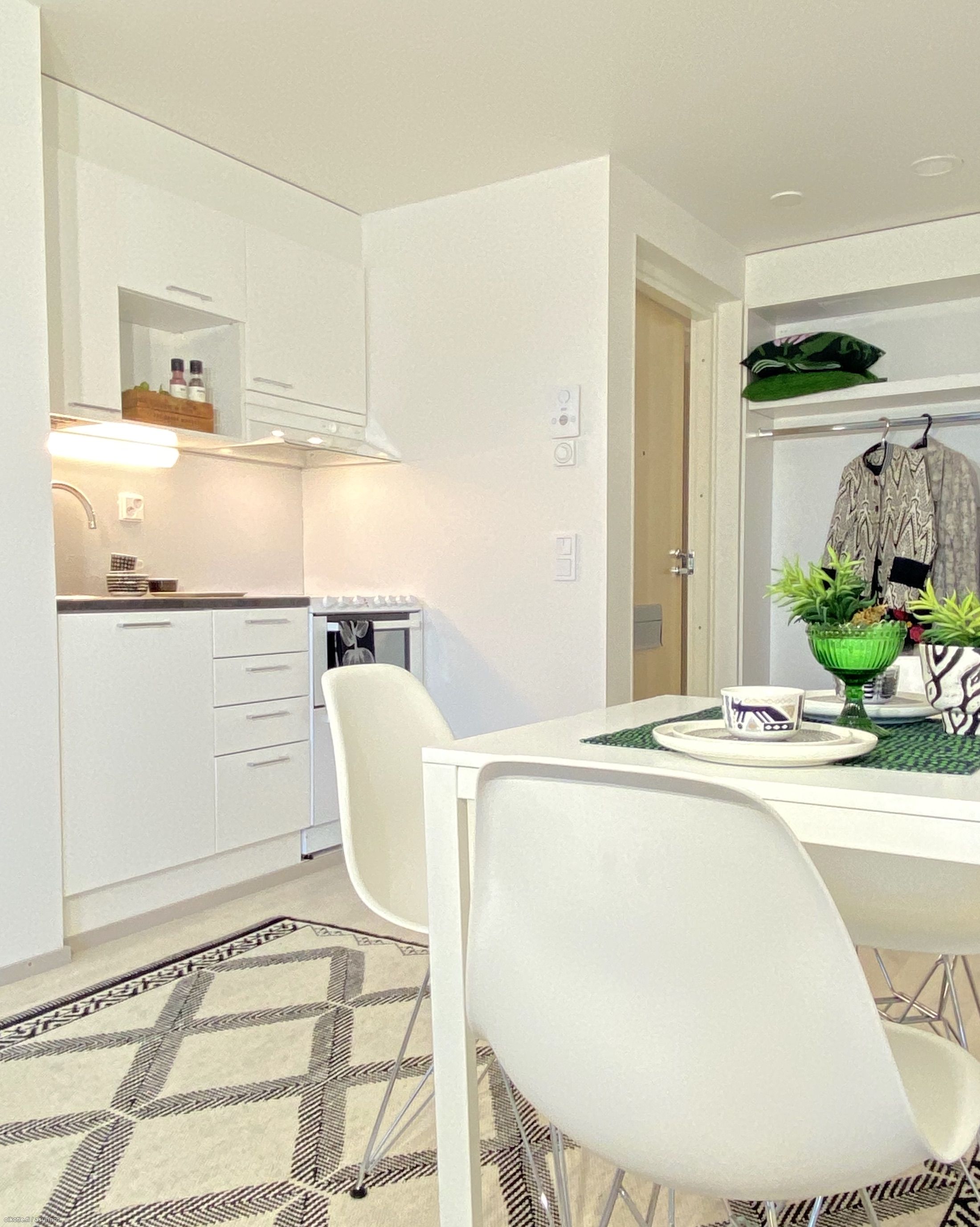 Asunnon lattiat ovat laminaattia, seinät vaalein maalipinnoin ja kylpyhuone on laatoitettu. Keittiötilassa on yhdistetty jääkaappi ja pakastin, astianpesukone sekä liesi. Pesuhuoneeseen mahtuu hyvin pyykinpesukone. Ikkunoissa sälekaihtimet. Asunnossa on vesikiertoinen lattialämmitys, joka sisältyy vuokraan.