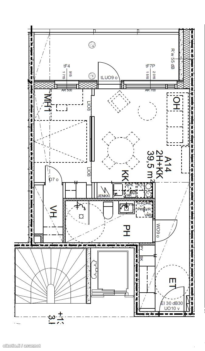 | Huoneiston kokoonpano | 2h,kt,kh,vh,l.parv |