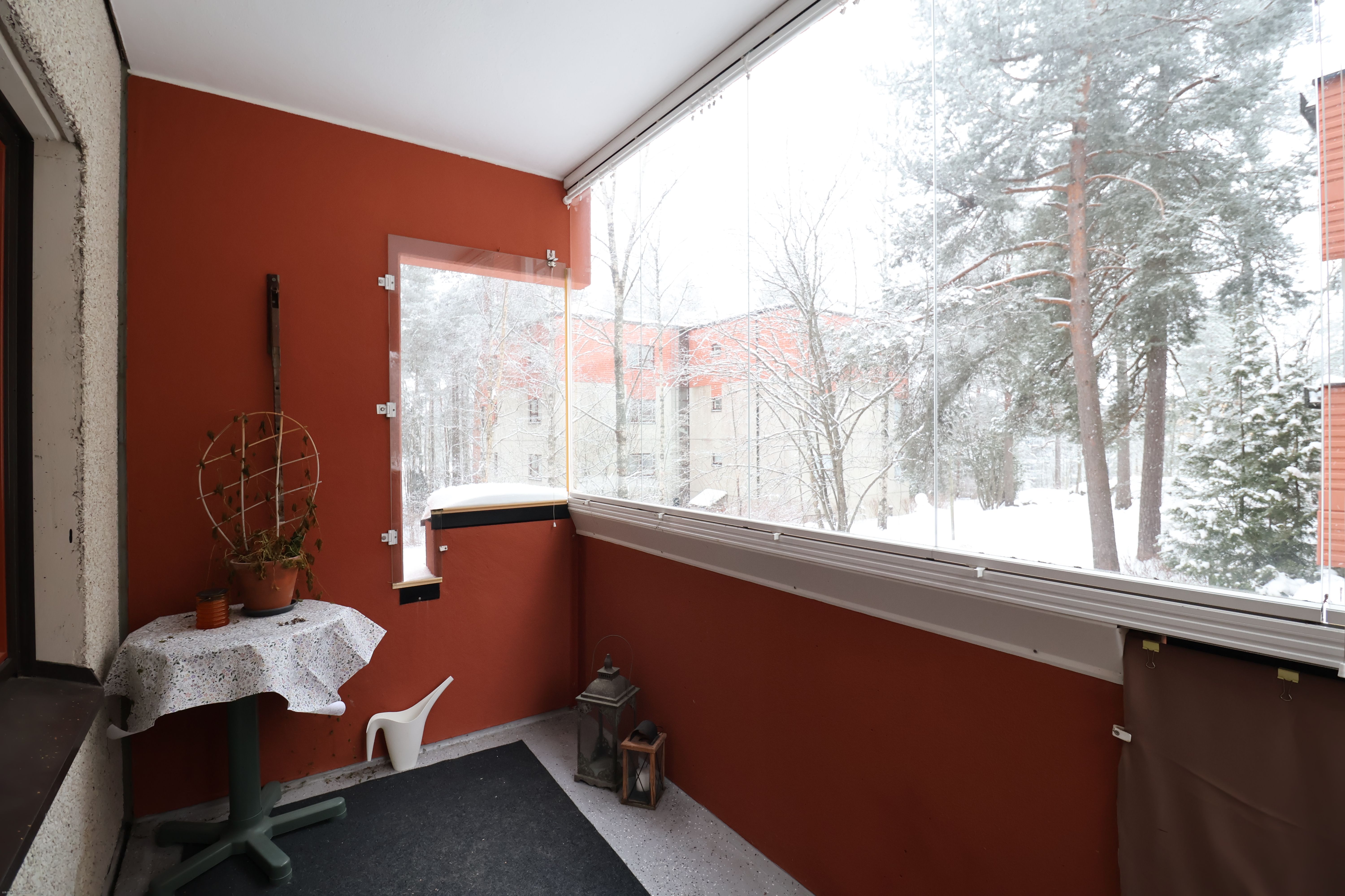 Viihtyisä kolmio lasitetulla parvekkeella Laajasalosta.