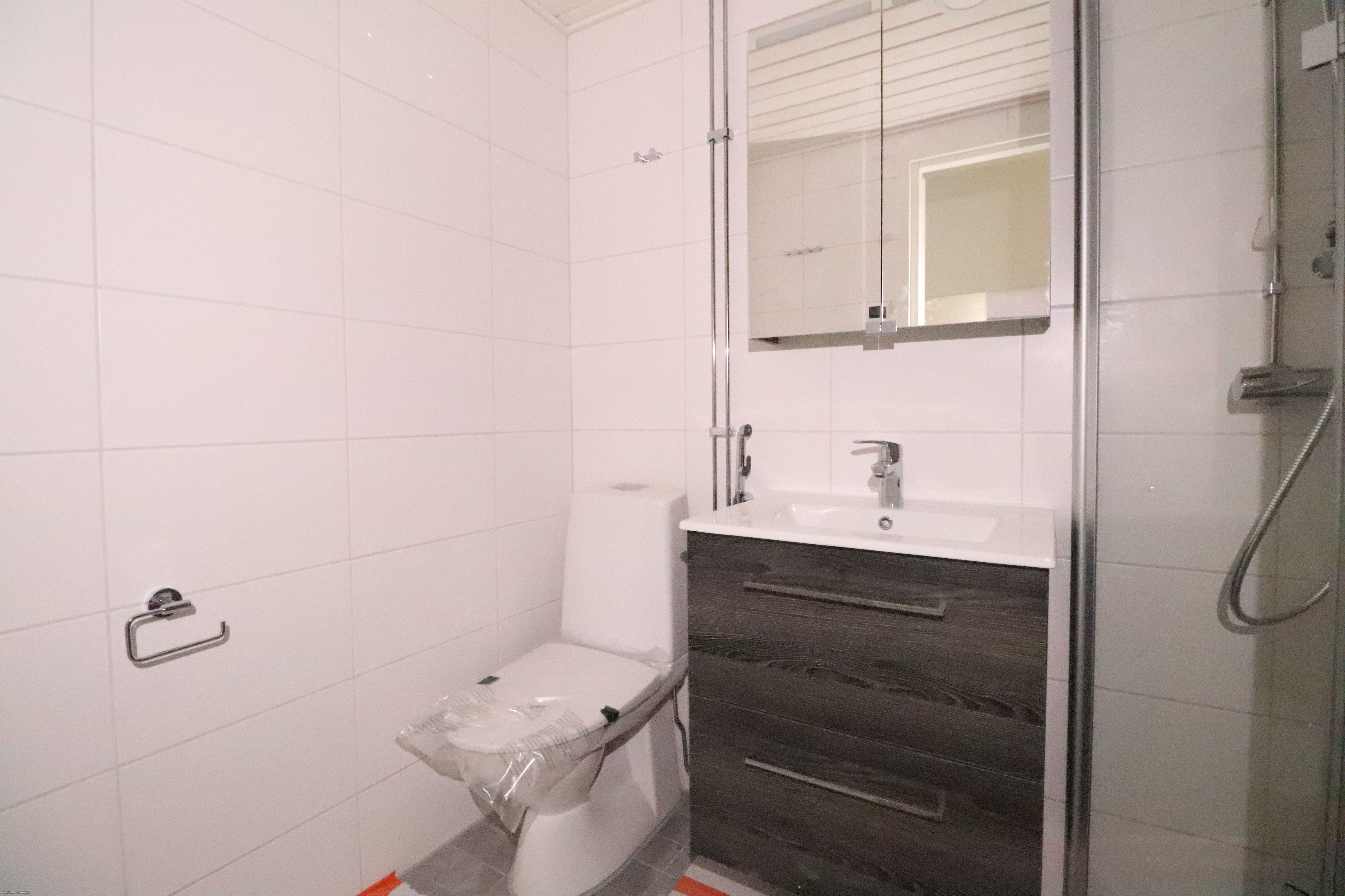 Keittiön varusteluun kuuluu jääkaappipakastin, uuni/liesi sekä astianpesukone. Siistissä kylpyhuoneessa on valmiina paikka ja liitännät omalle pyykinpesukoneelle. Makuuhuone on todella tilava ja siellä on myös mukavasti kaappitilaa.