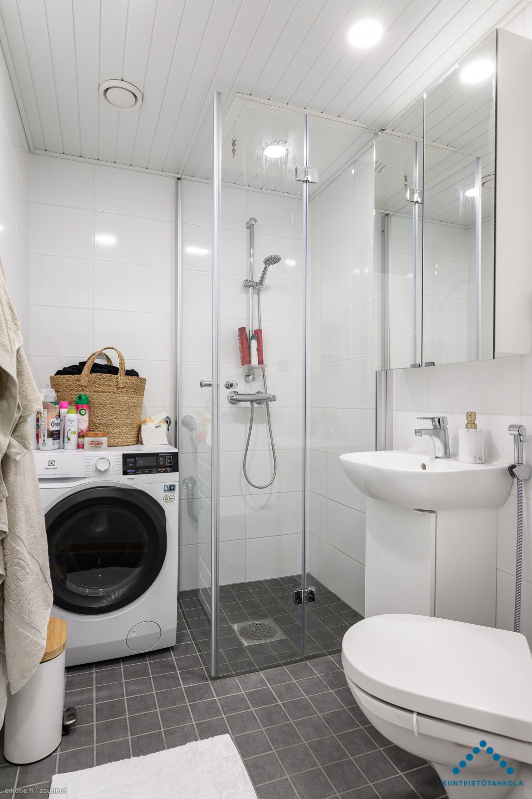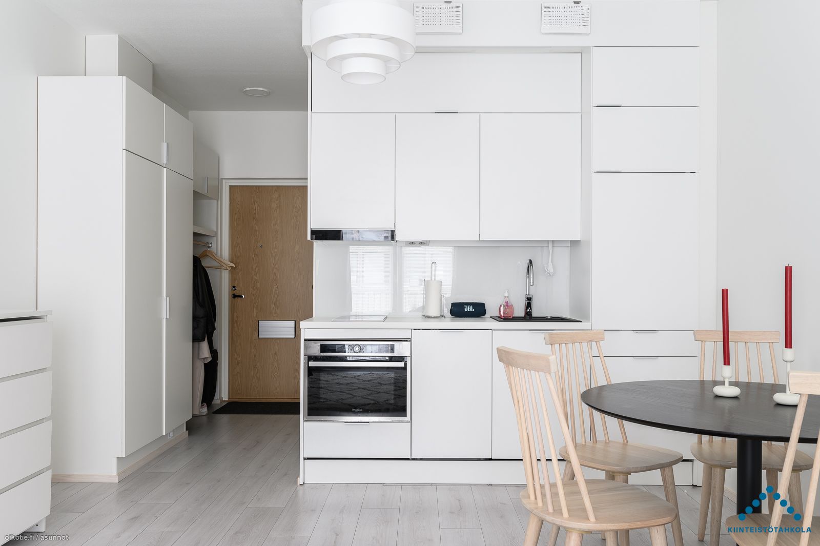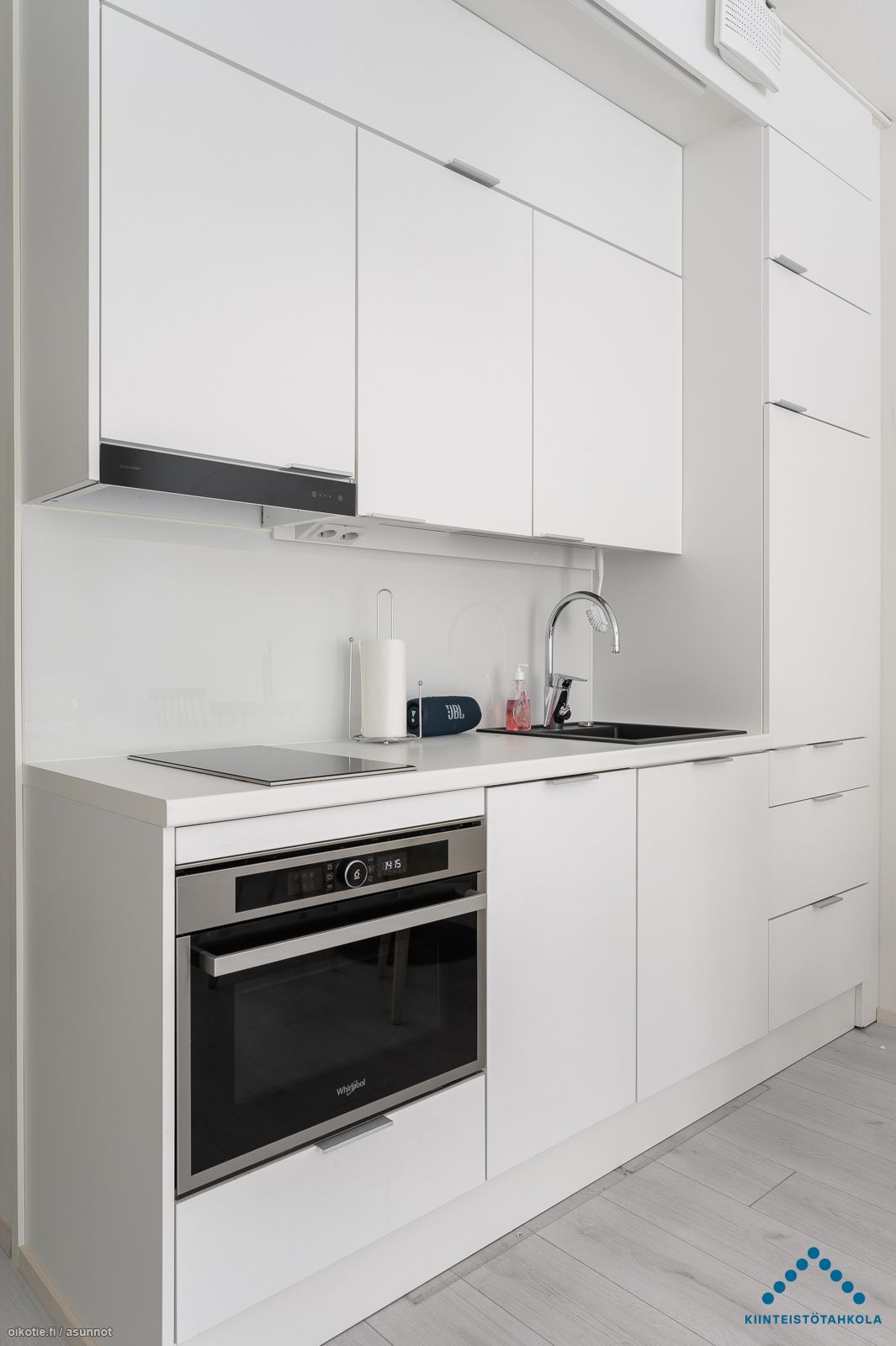 Tässä kivassa 5. kerroksen yksiössä on oma tilava sisäpihan parveke. Asunnossa on vaaleat seinäpinnat ja laminaattilattia. Keittiössä on yhdistelmäuuni jossa mikroaalto- ja kiertoilmatoiminto, 2-levyinen induktioliesitaso, liesikupu ja integroitu 45 cm leveä astianpesukone ja integroitu jääkaappi pakastelokerolla. Tilavassa laatoitetussa kylpyhuoneessa on pyykkikoneelle paikka ja liitännät. Asunnossa on miellyttävä vesikiertoinen lattialämmitys.
