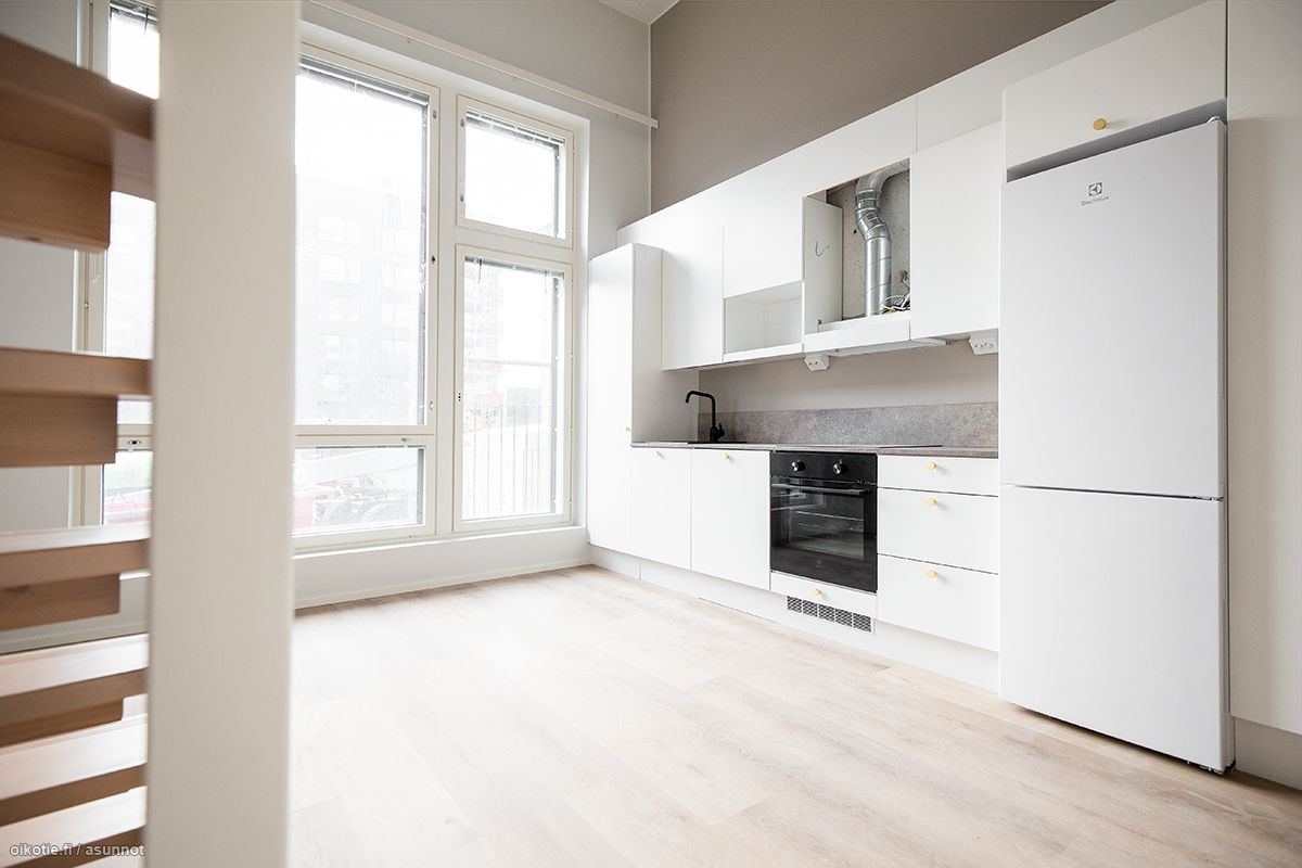Vapautumassa parvellinen yksiö hulppealla huonekorkeudella.
