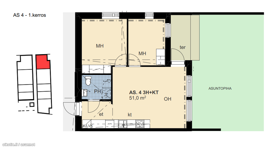 | Huoneiston kokoonpano | 3h+kt+terassi+as.piha |