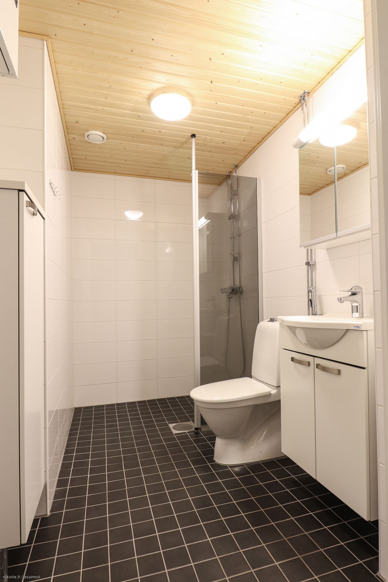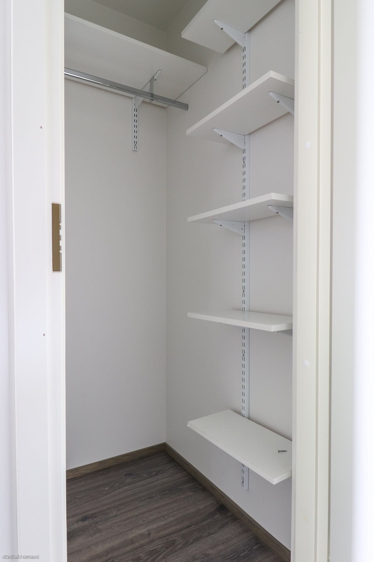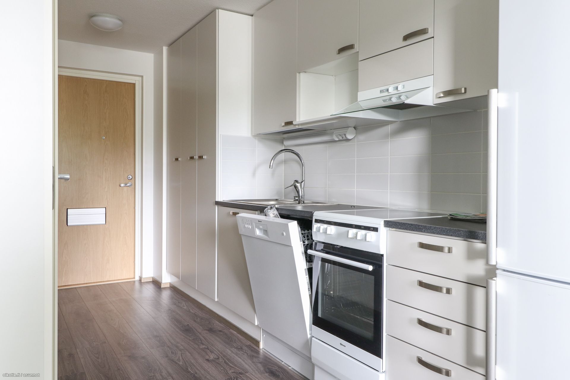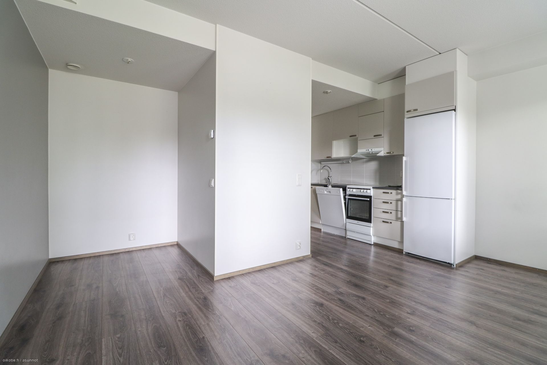 Lattioissa kaunis laminaatti, seinät valkoisin maalipinnoin. Keittiössä varusteluna astianpesukone, jääkaappipakastin ja liesi/uuni. Kylpyhuoneesta löytyy tila ja liitännät pyykinpesukoneelle. Vaatehuone lisäämässä säilytystilaa. Asunnon mukana vuokrataan pistokkeellinen autopaikka 25€/kk.