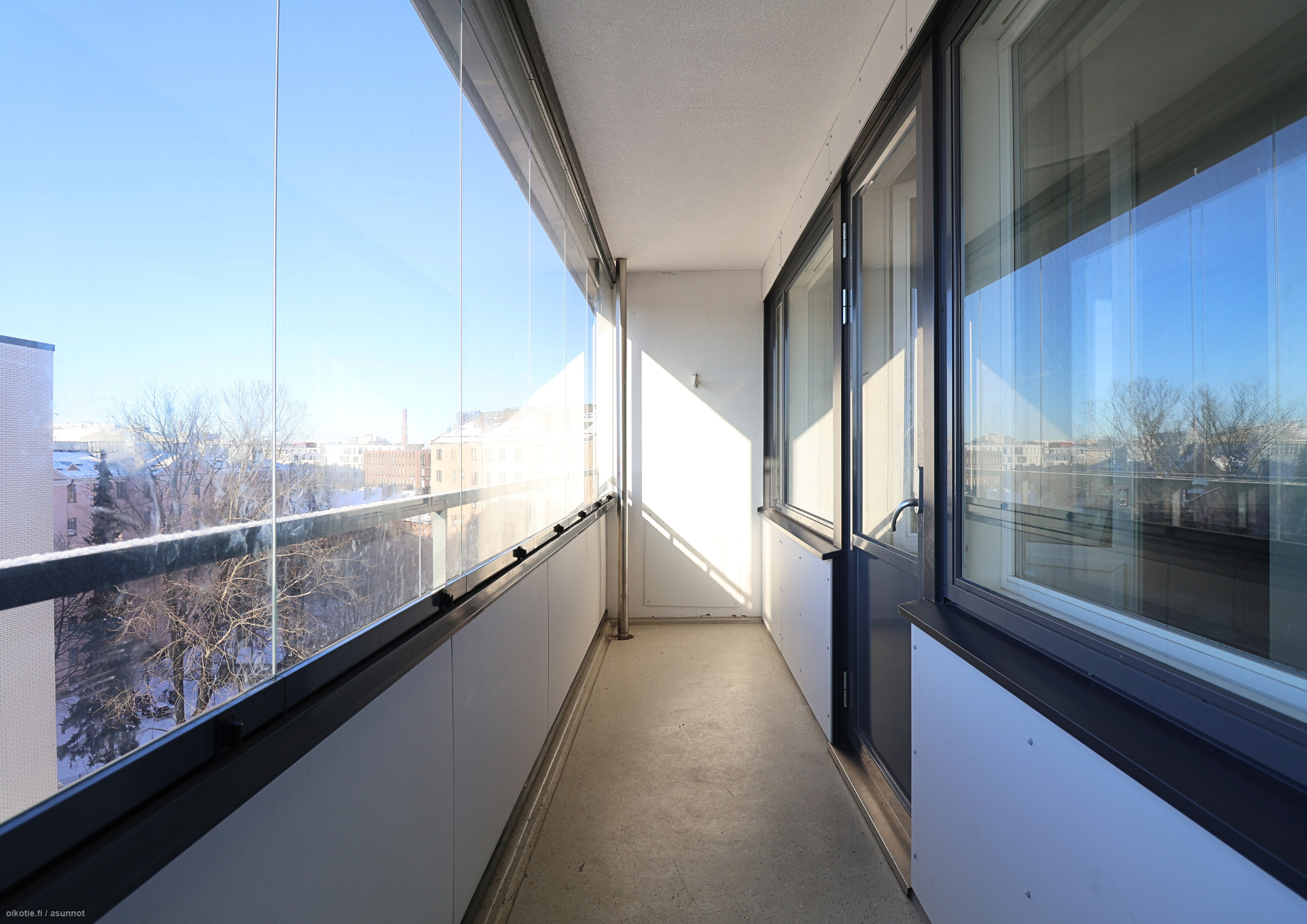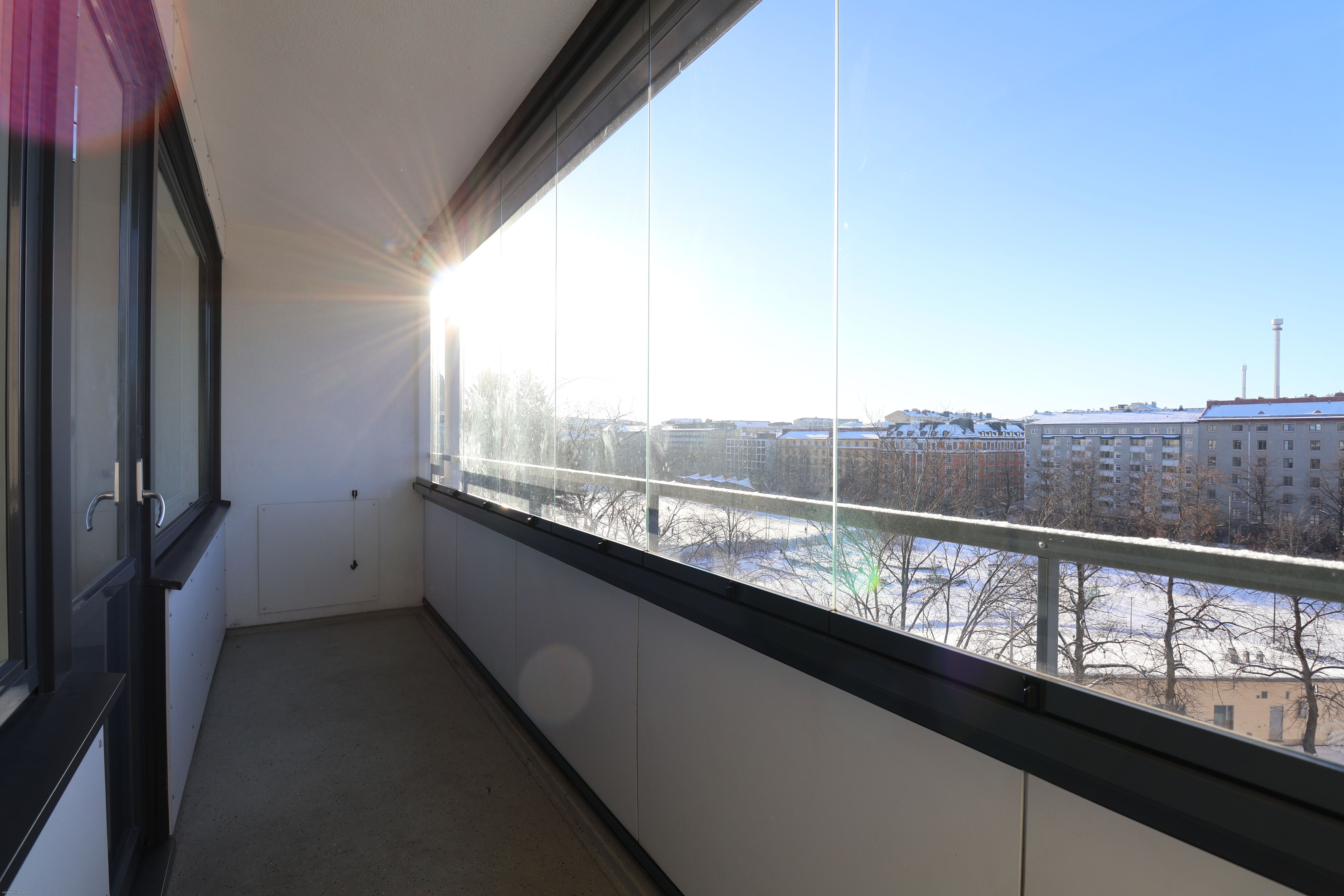Valoisa kolmio huikeilla näkymillä Alppilassa lasitetulla parvekkeella, vesimaksu sisältyy vuokraan!