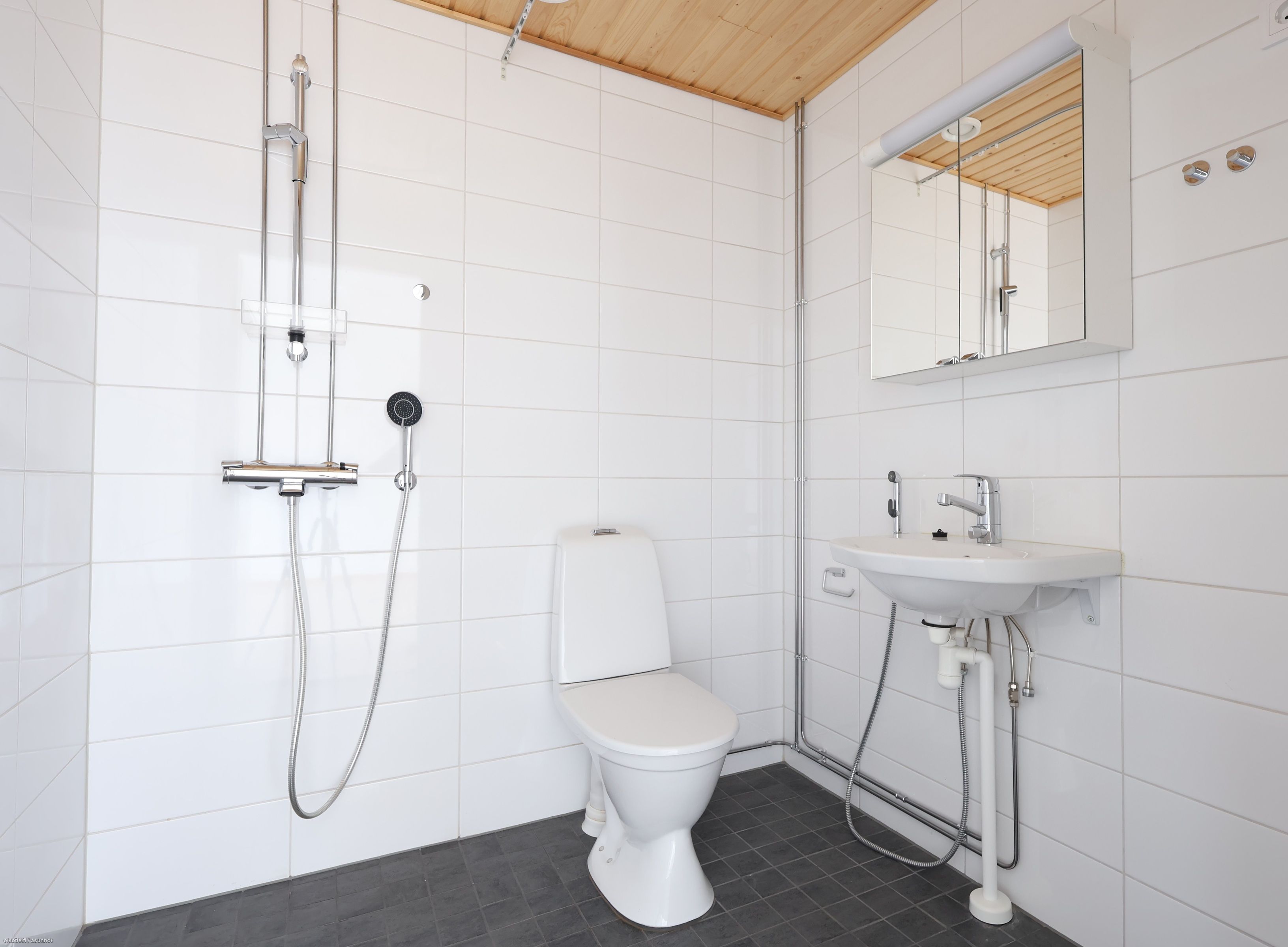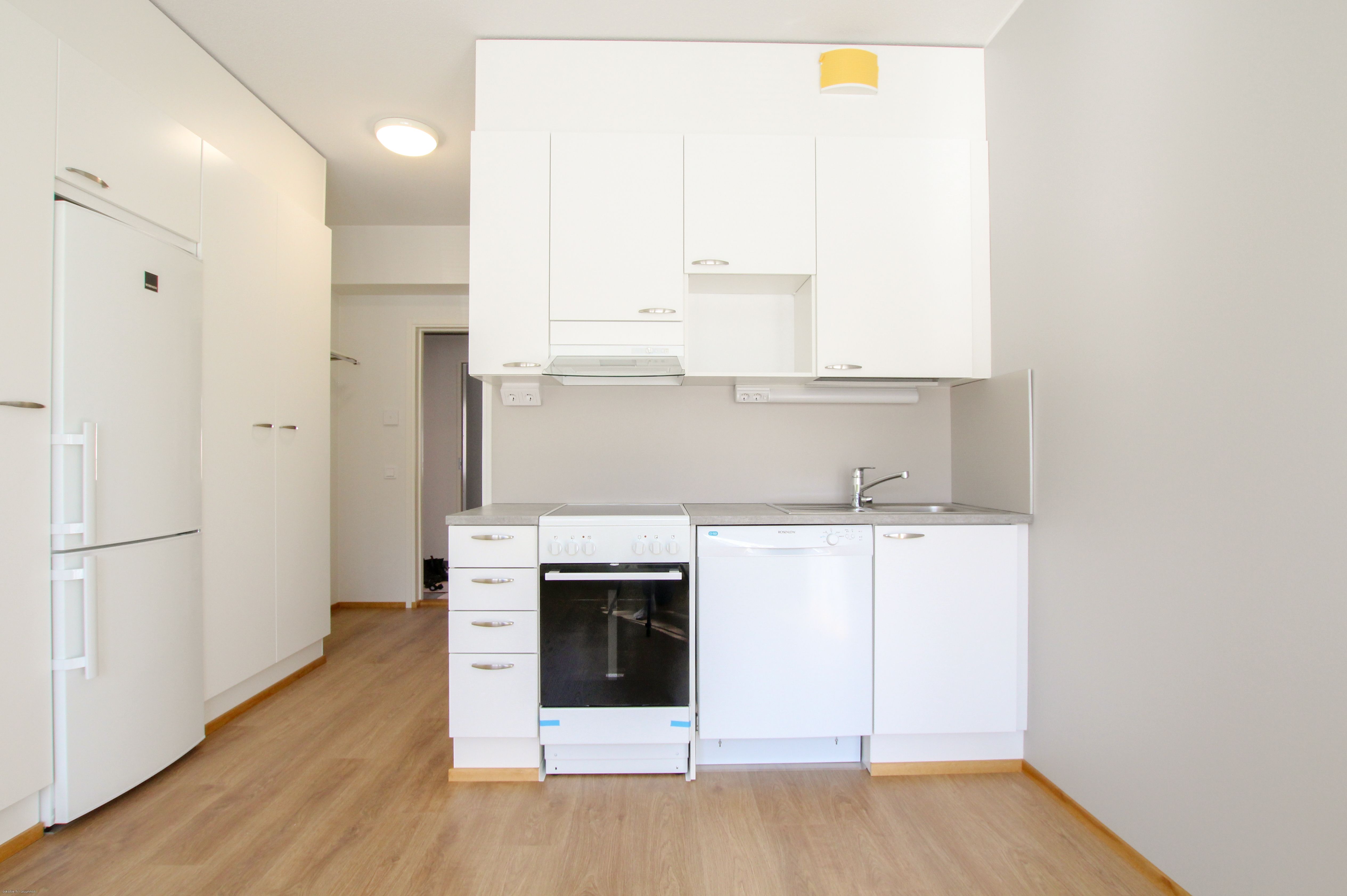 Asunnon lattiat ovat laminaattia, seinät maalipinnoin ja kylpyhuone laatoitettu. Keittiötilassa on yhdistetty jääkaappi ja pakastin, astianpesukone sekä liesi. Pesuhuoneeseen mahtuu hyvin pyykinpesukone.