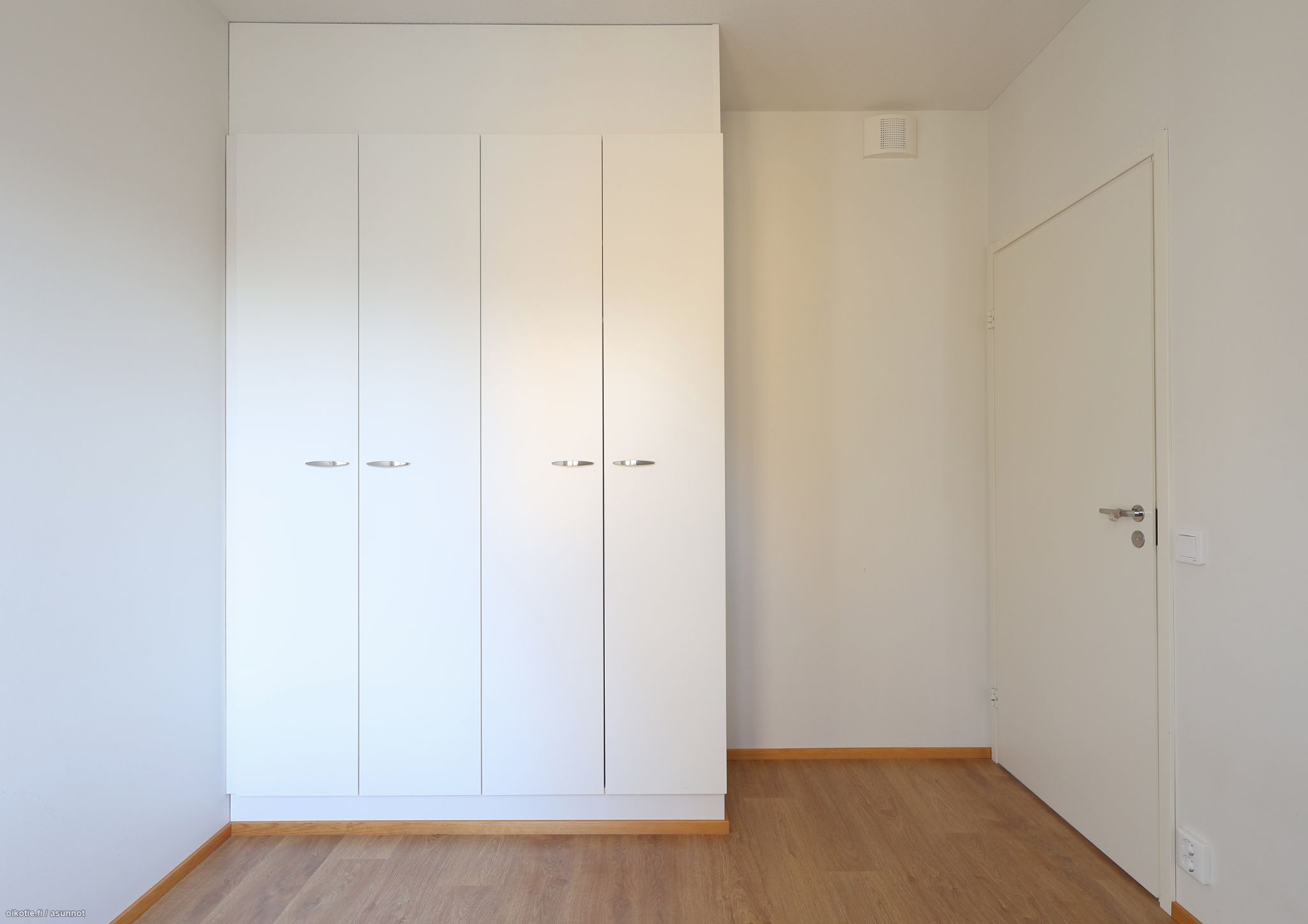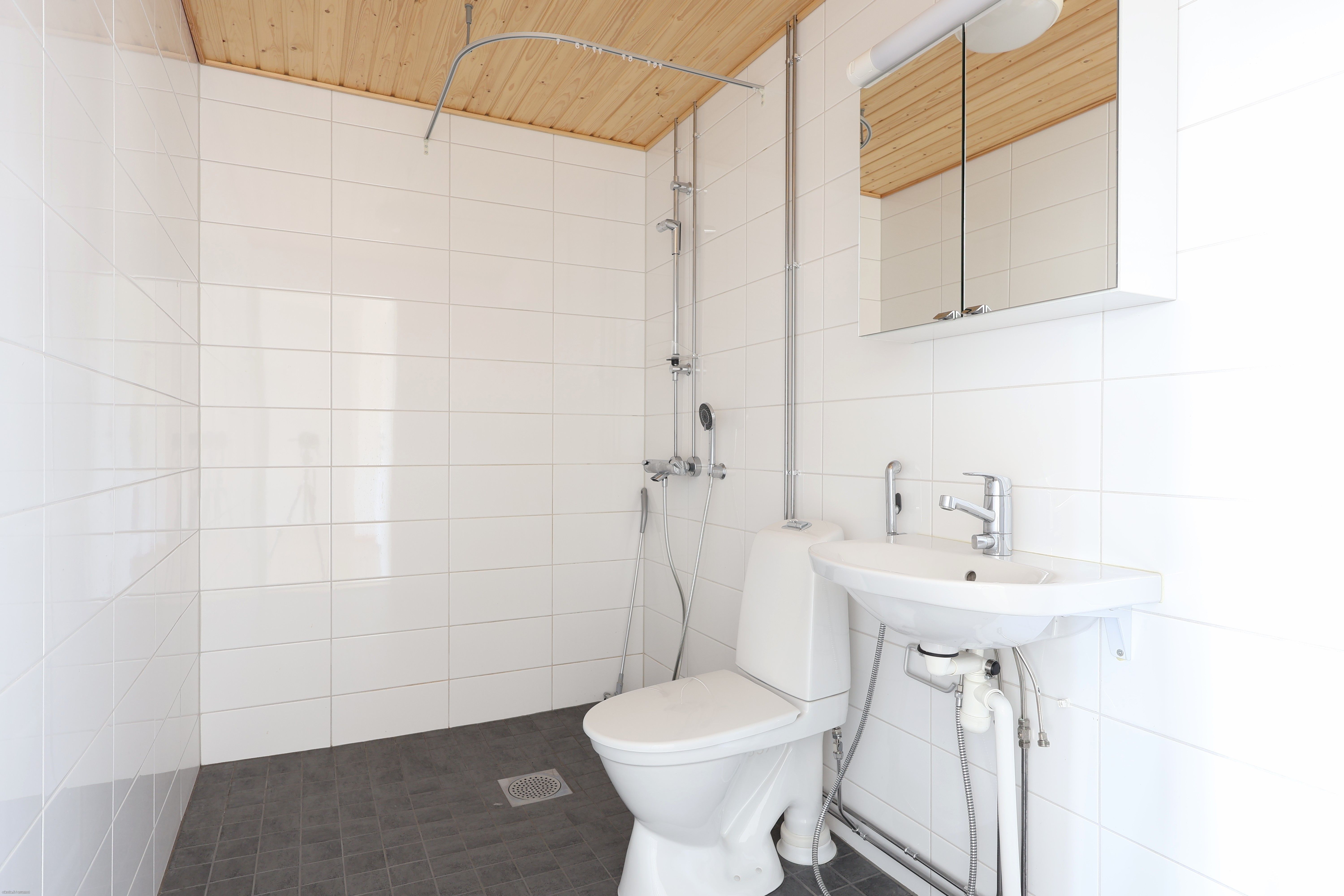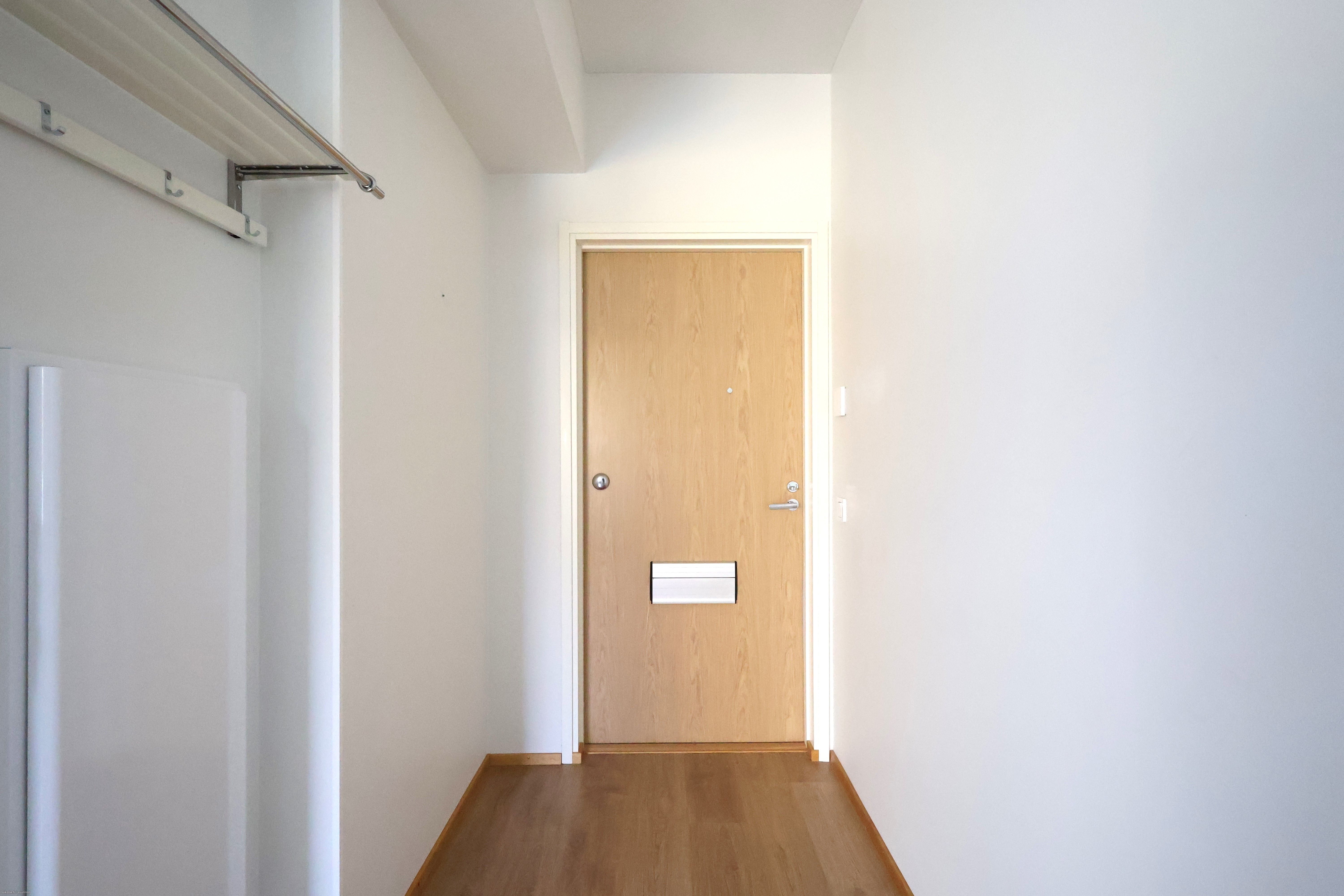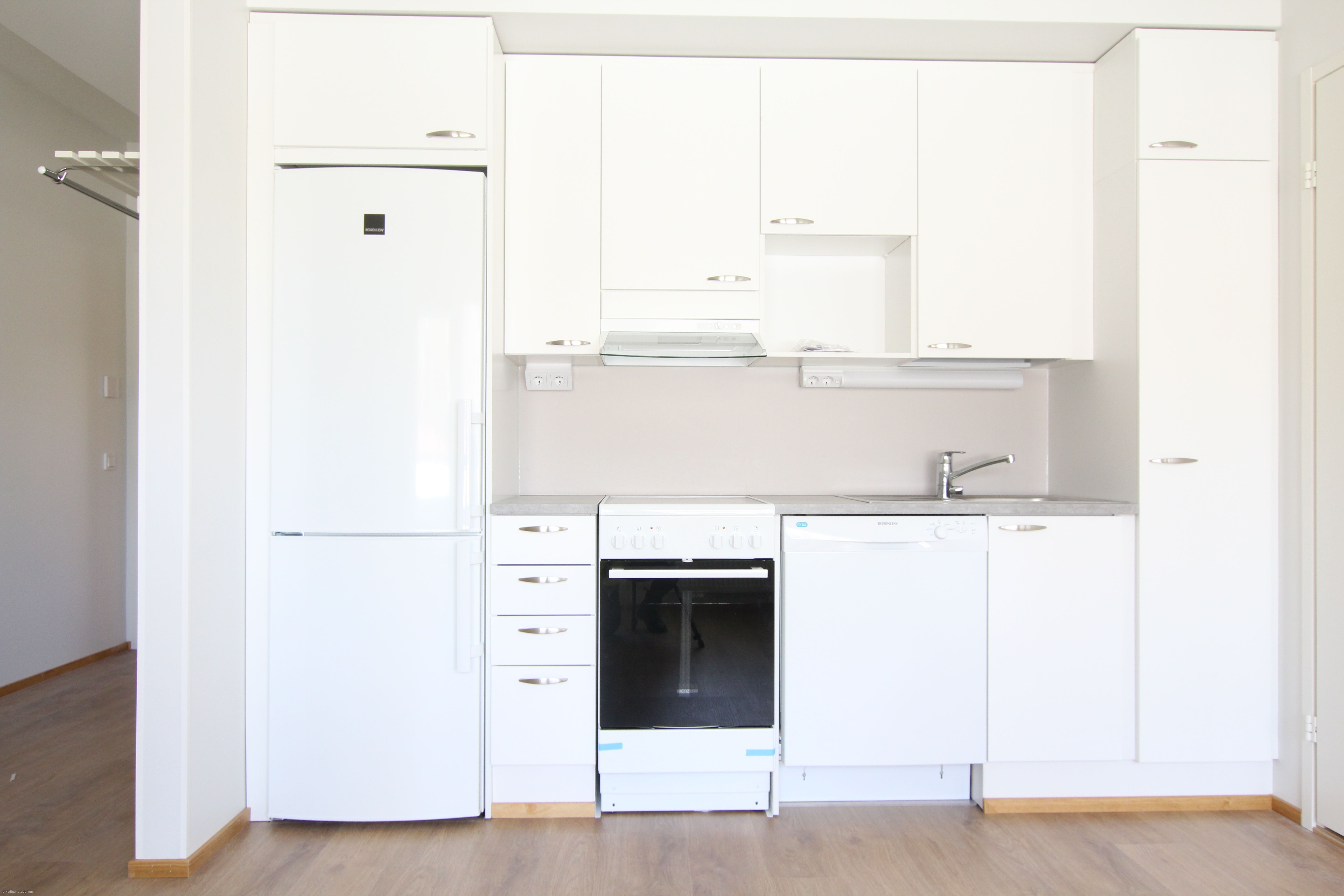 Asunnon lattiat ovat laminaattia, Keittiötilassa on yhdistetty jääkaappi ja pakastin, astianpesukone sekä liesi. Kylpyhuoneessa on paikka ja liitännät pyykinpesukoneelle.