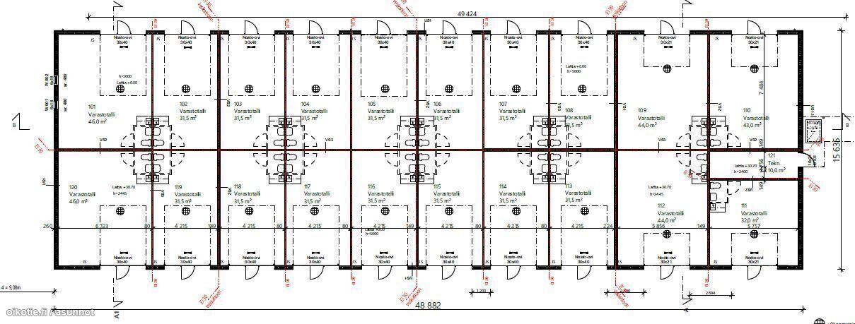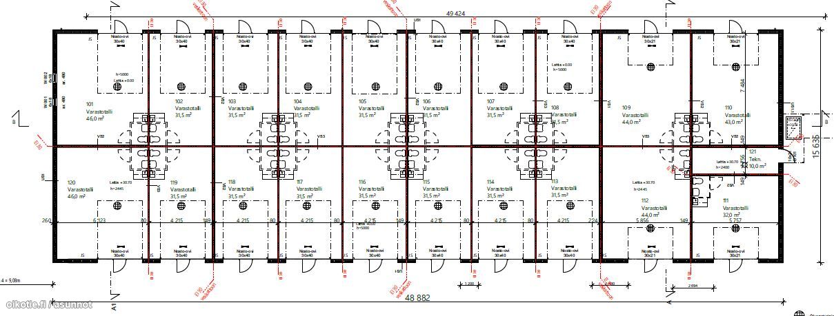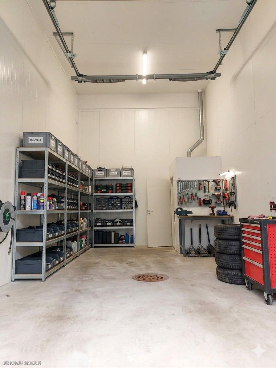 Tallin lattia pinta-ala 31,5m2. Sisäkorkeus 5 metriä ja nosto-ovi 3m x 4m.