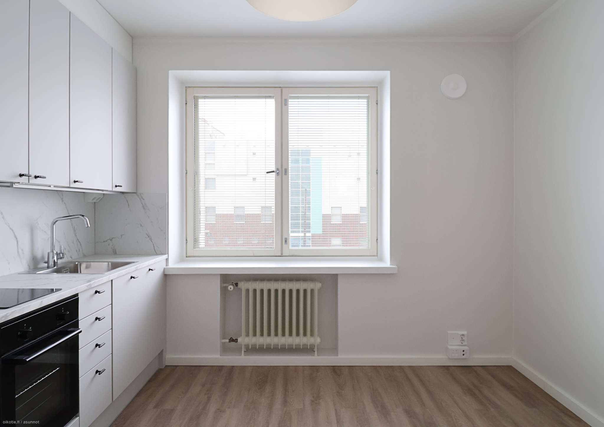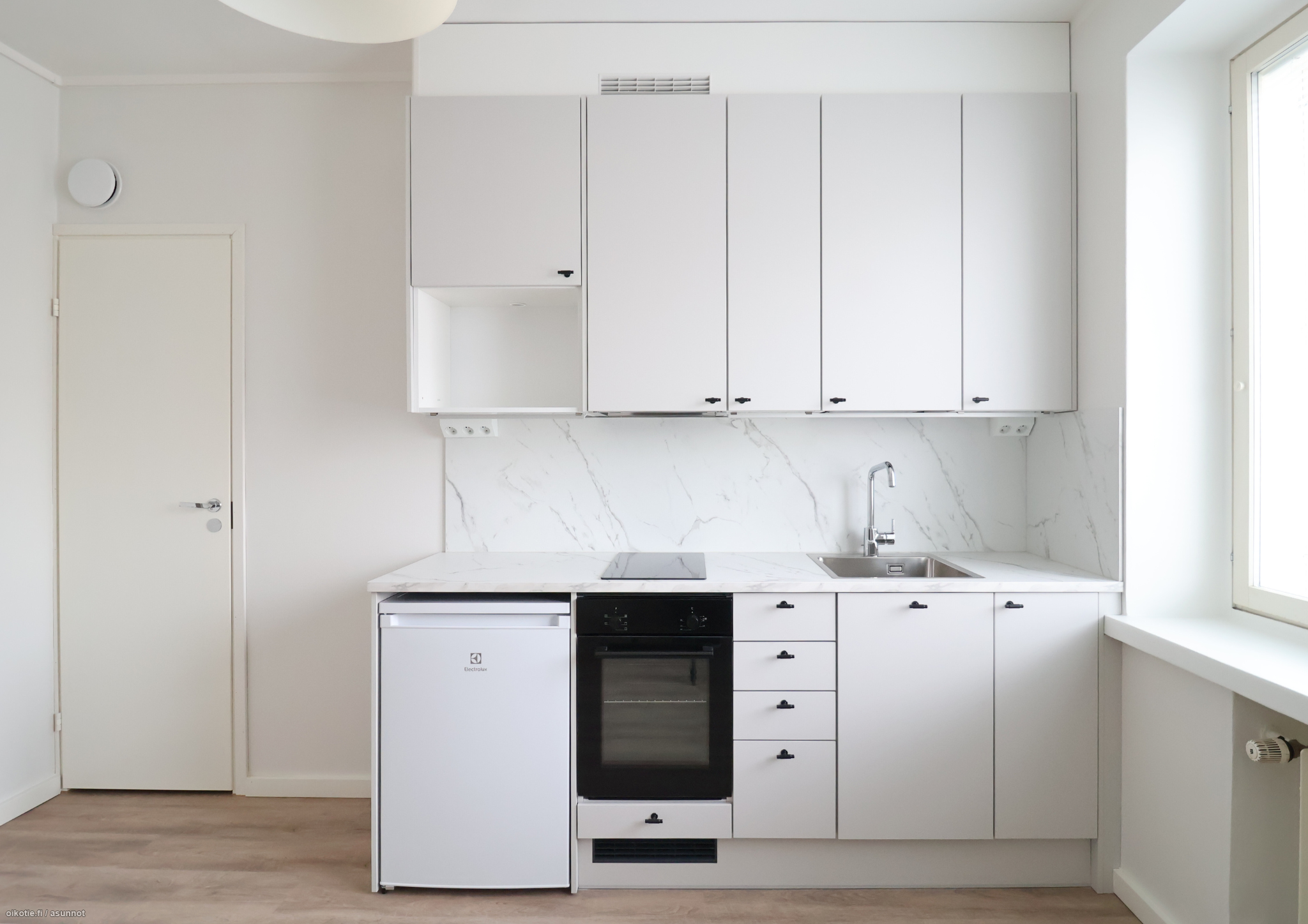 Asunto on juuri valmistunut remontista. Helposti sisutettava pohjaratkaisu tuo asunnon kaikki neliöt hyvin käytettäväksi. Keittiössä on jääkaappi, josta löytyy pieni pakastinlokero. Keittiön vierestä löytyy pieni vaatehuone.