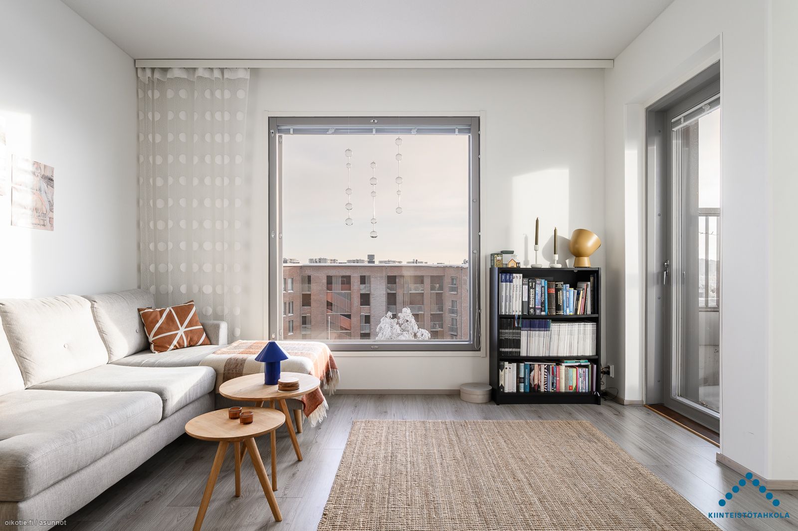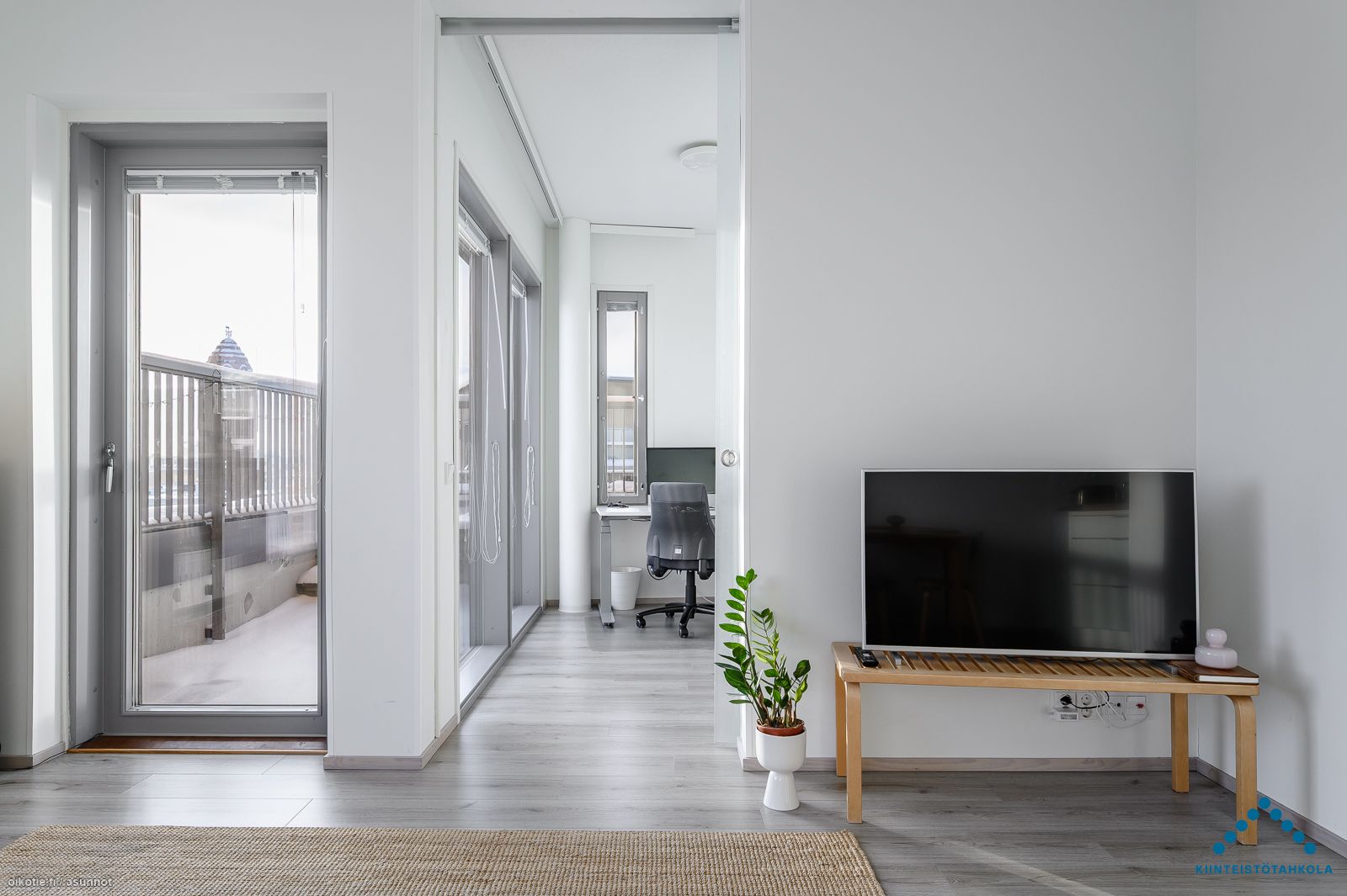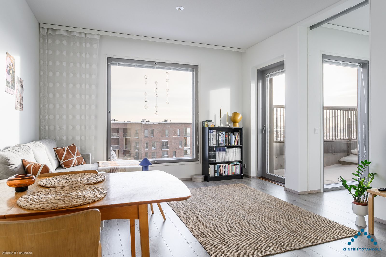 Myynnissä Myllytullissa saunallinen kolmio ylimmässä 8/8 kerroksessa. Talo valmistunut vuonna 2018.