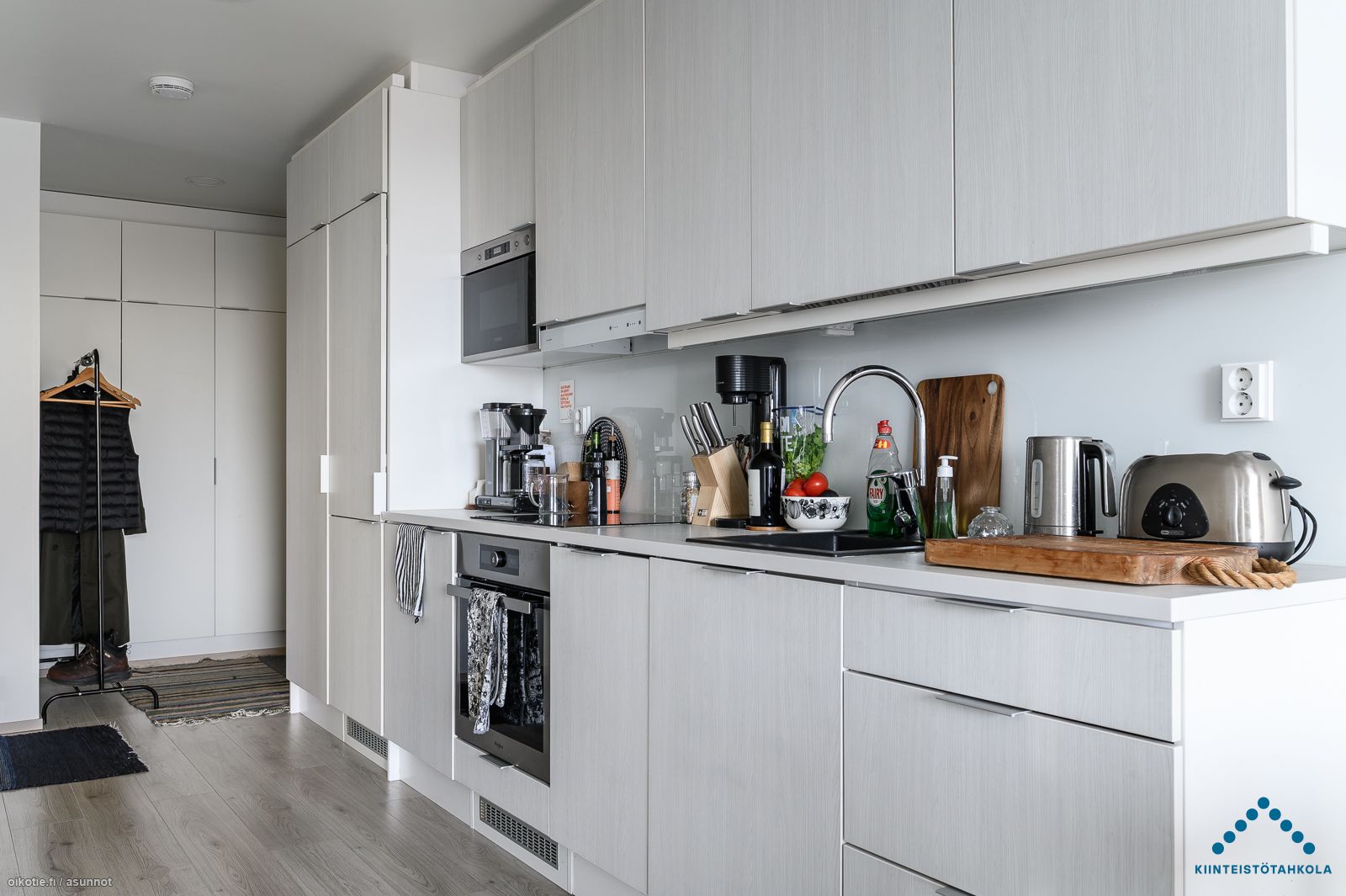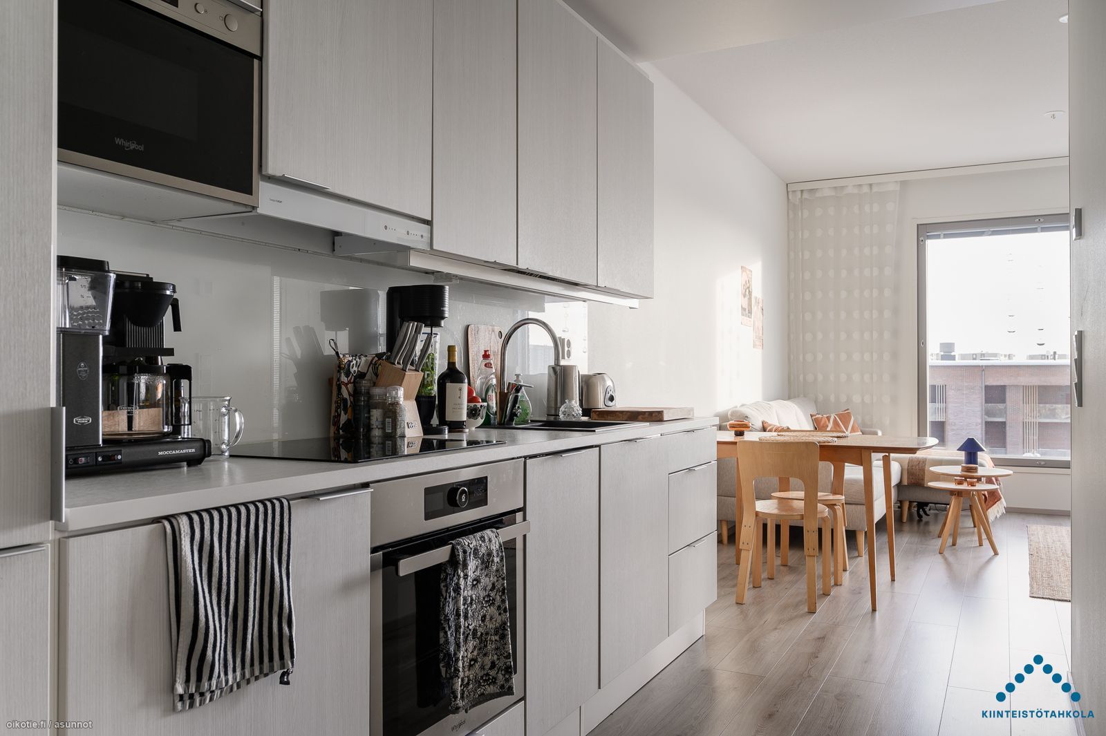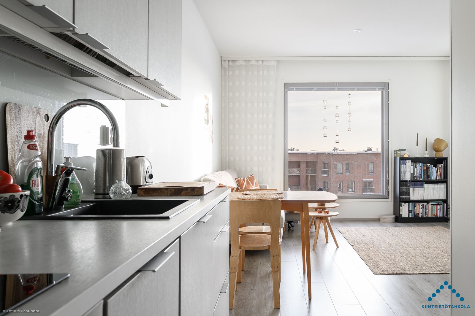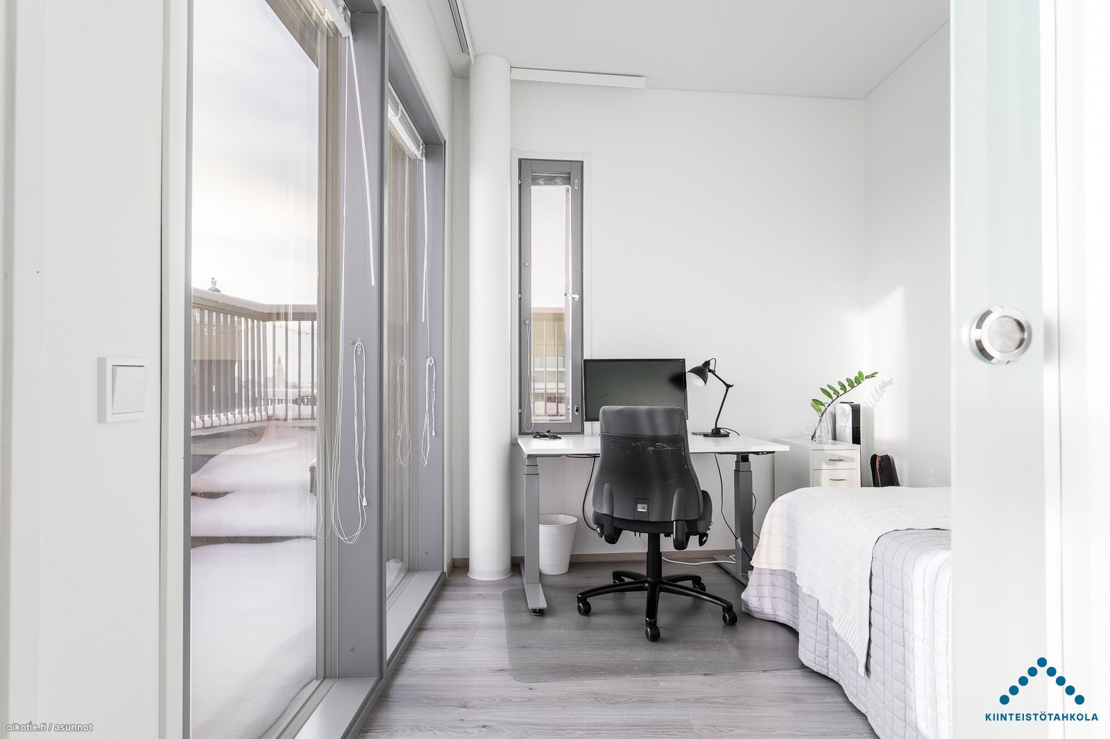Myynnissä Myllytullissa saunallinen kolmio ylimmässä 8/8 kerroksessa. Talo valmistunut vuonna 2018.