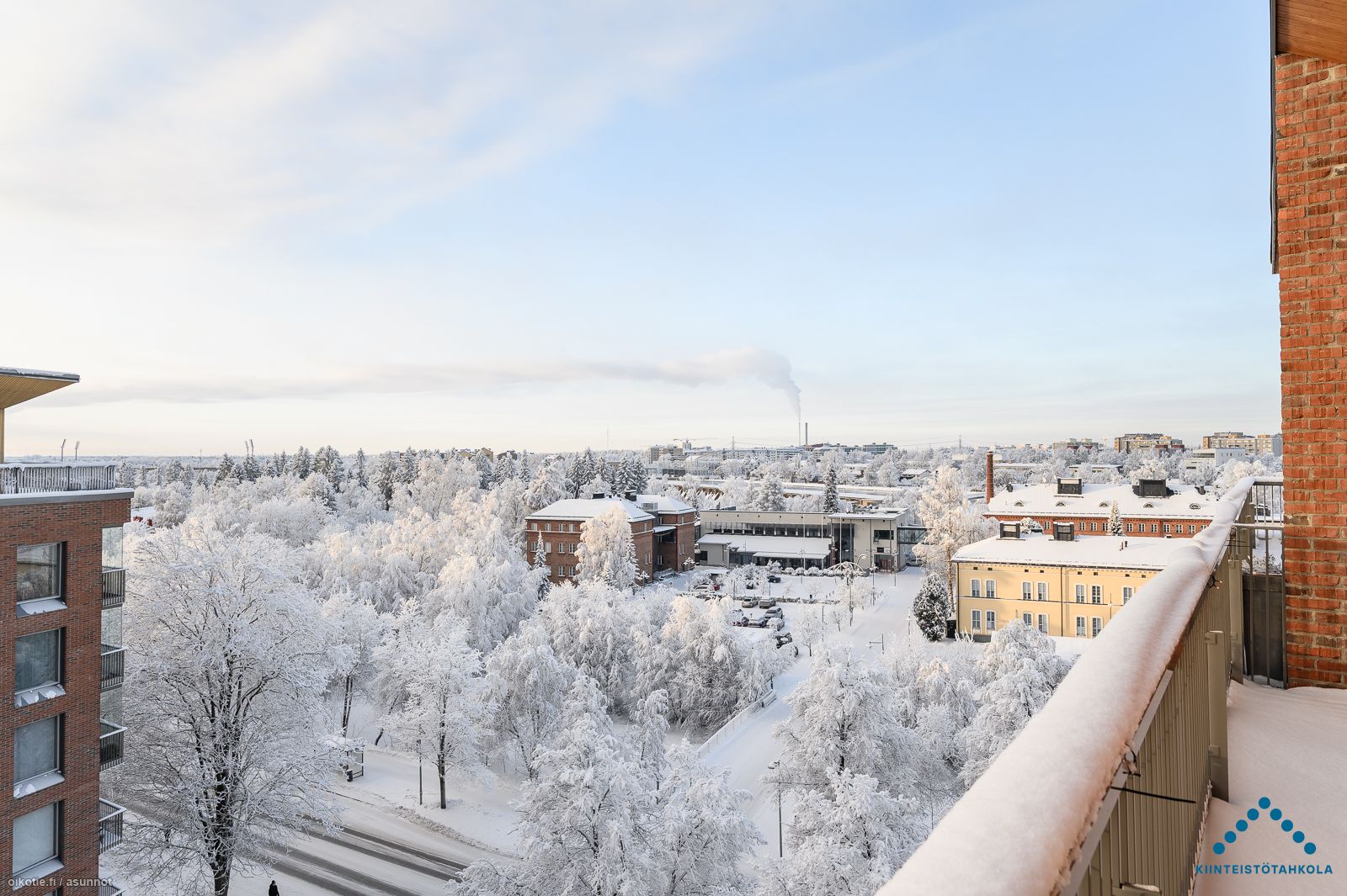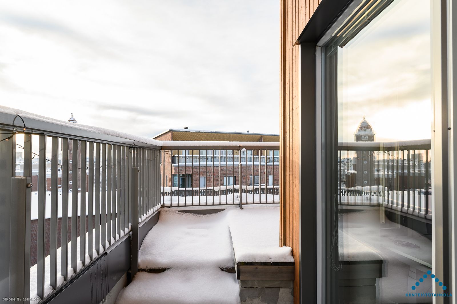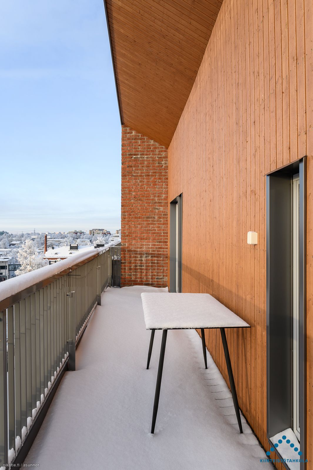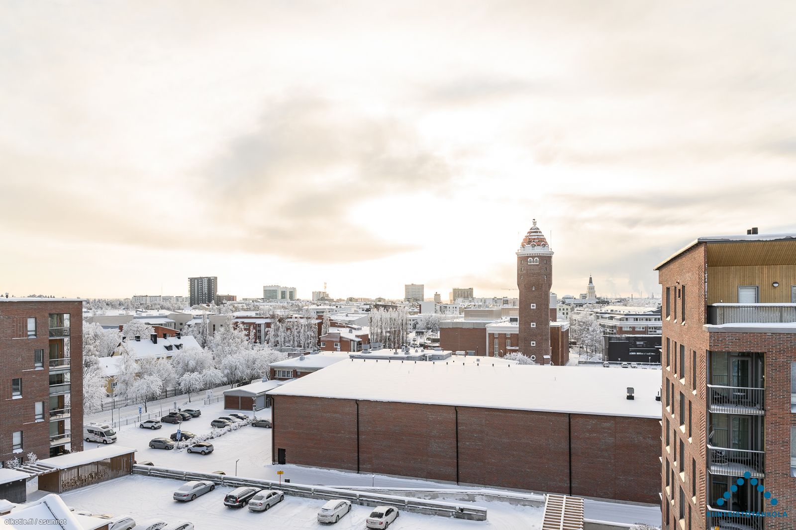 Asunnon 57 neliömetriä sisältää kaksi makuuhuonetta, tupakeittiön, kylpyhuoneen, vaatehuoneen, saunan sekä kattoterassin/parvekkeen. Ylimmän kerroksen sijainti takaa mahtavat näkymät kaupungin ylle. Asunnon lattiat laminaattia ja seinät vaalein maalipinnoin. Asunto on hyvässä kunnossa ja vapautuu uusille asukkaille 1.4.2026 alkaen.
