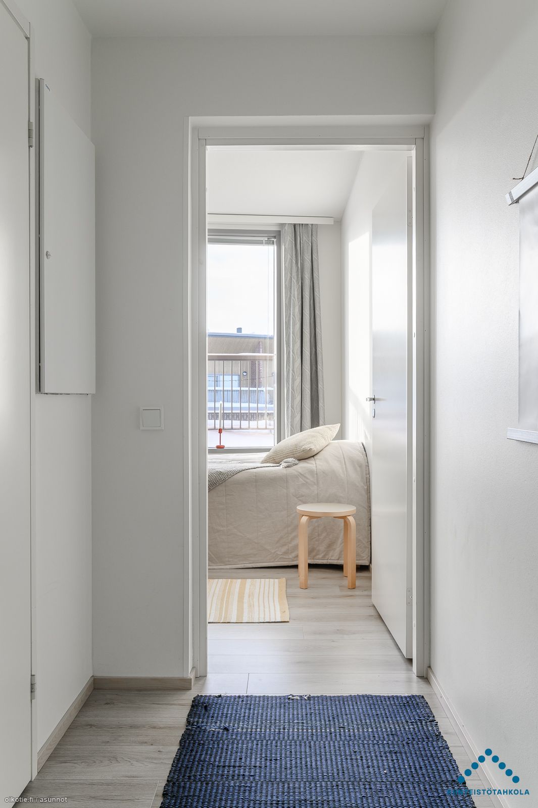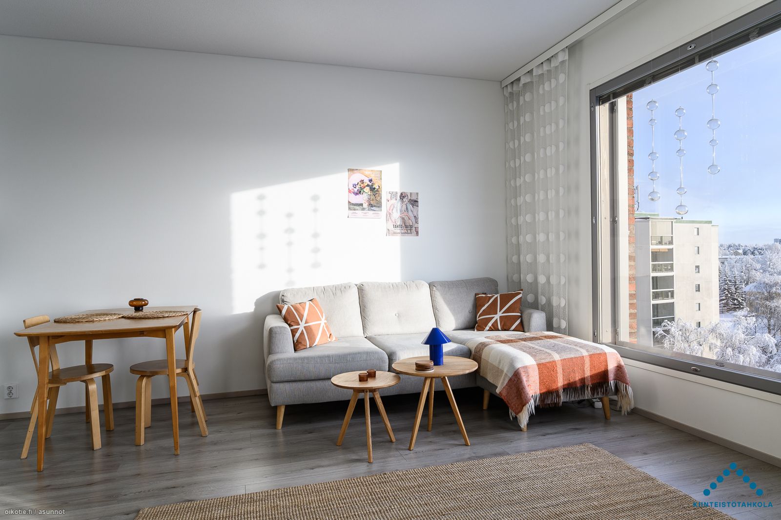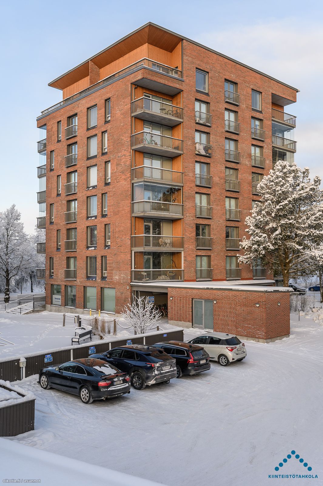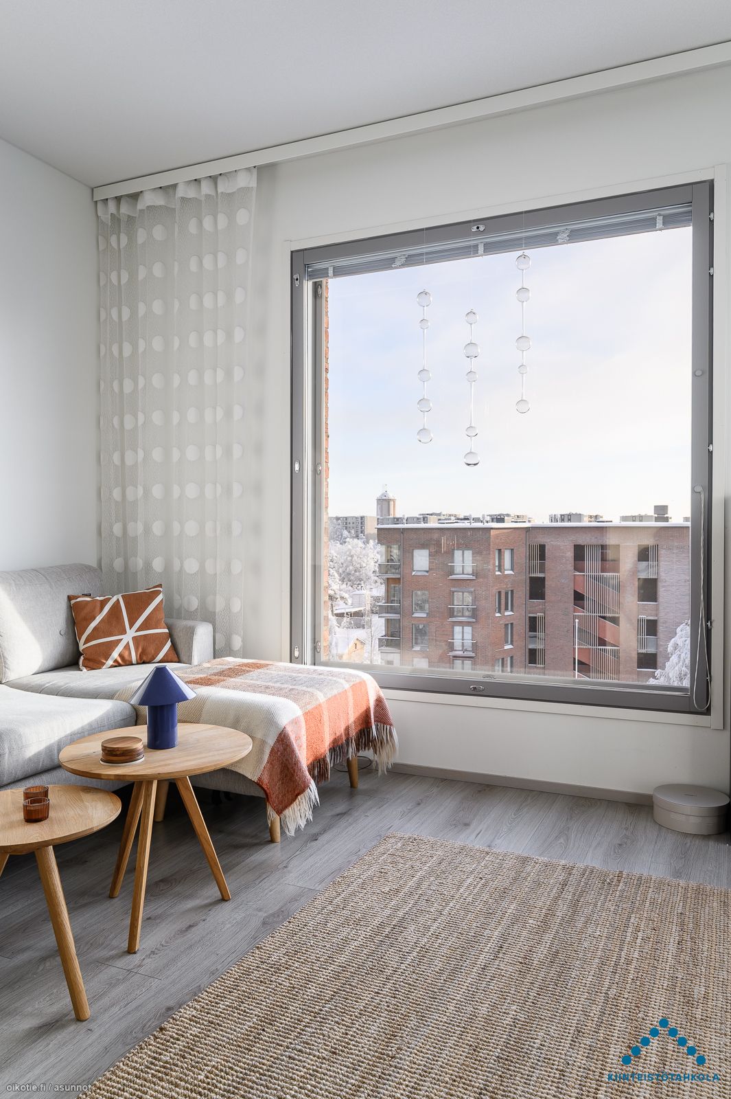 Asunnon 57 neliömetriä sisältää kaksi makuuhuonetta, tupakeittiön, kylpyhuoneen, vaatehuoneen, saunan sekä kattoterassin/parvekkeen. Ylimmän kerroksen sijainti takaa mahtavat näkymät kaupungin ylle. Asunnon lattiat laminaattia ja seinät vaalein maalipinnoin. Asunto on hyvässä kunnossa ja vapautuu uusille asukkaille 1.4.2026 alkaen.