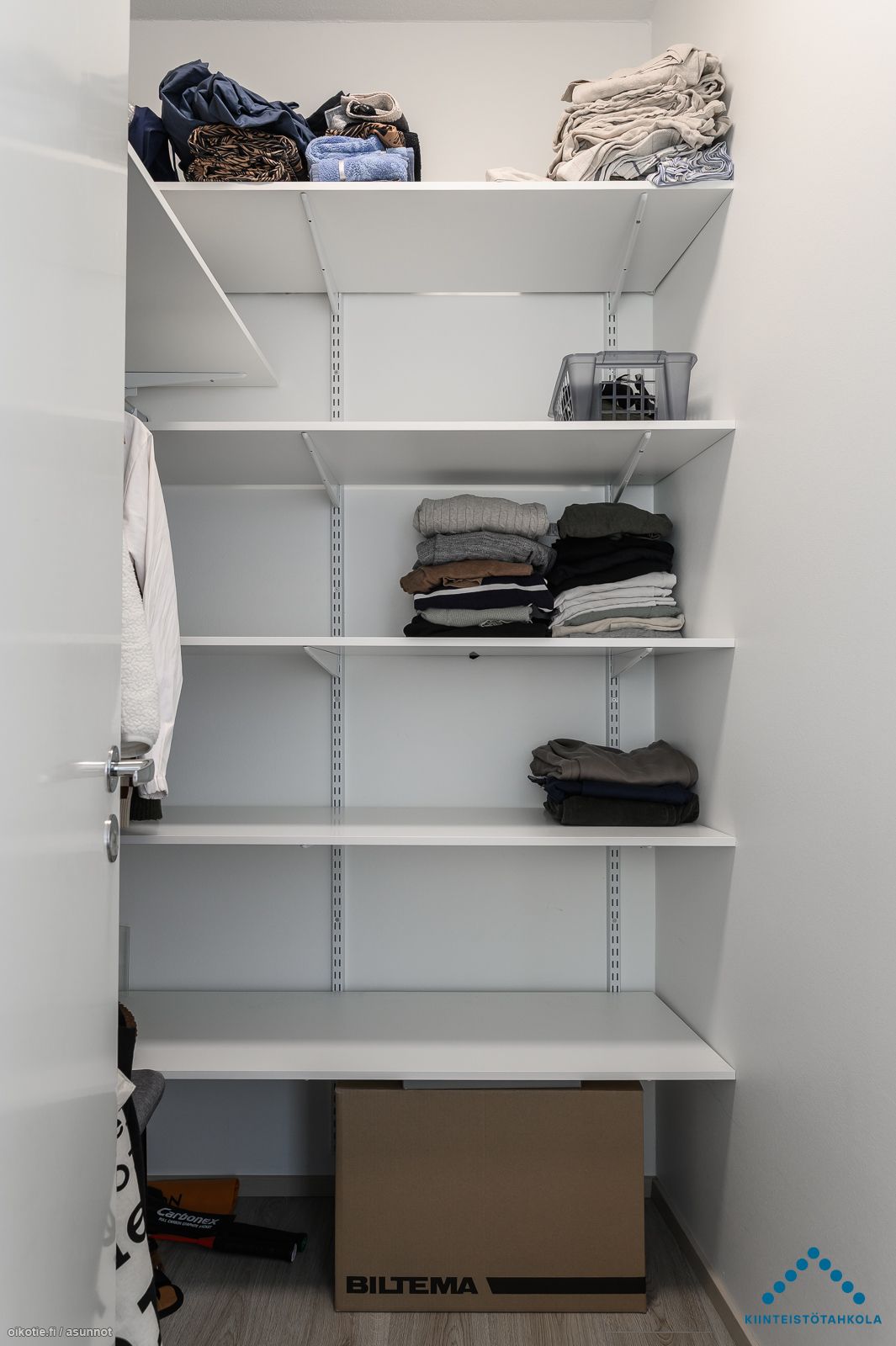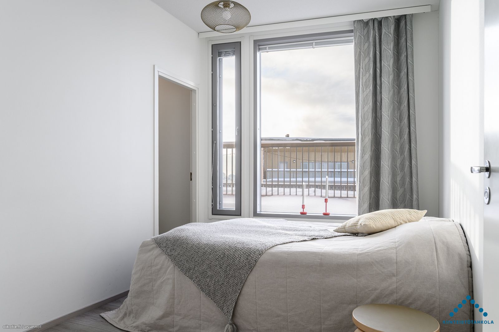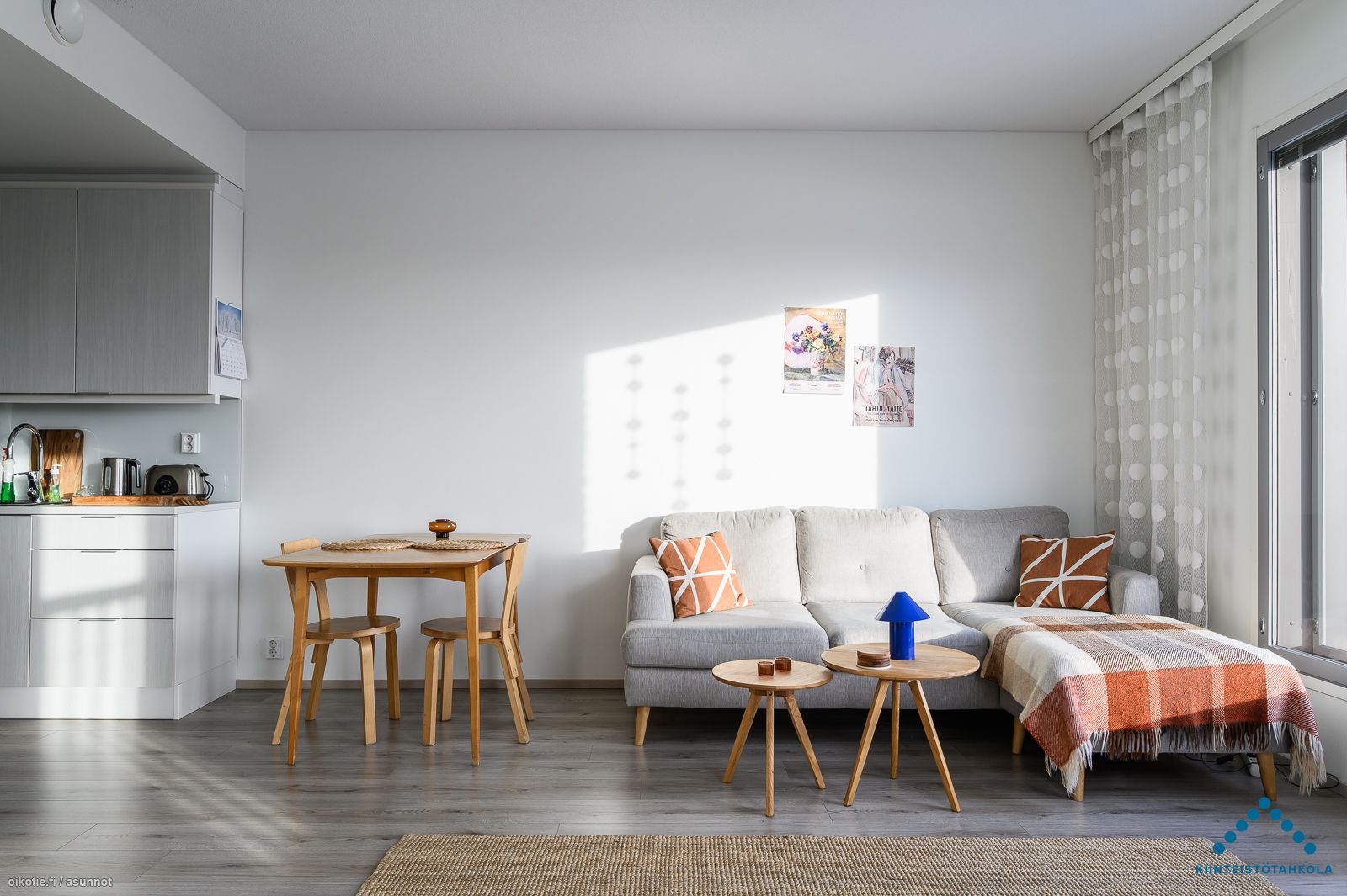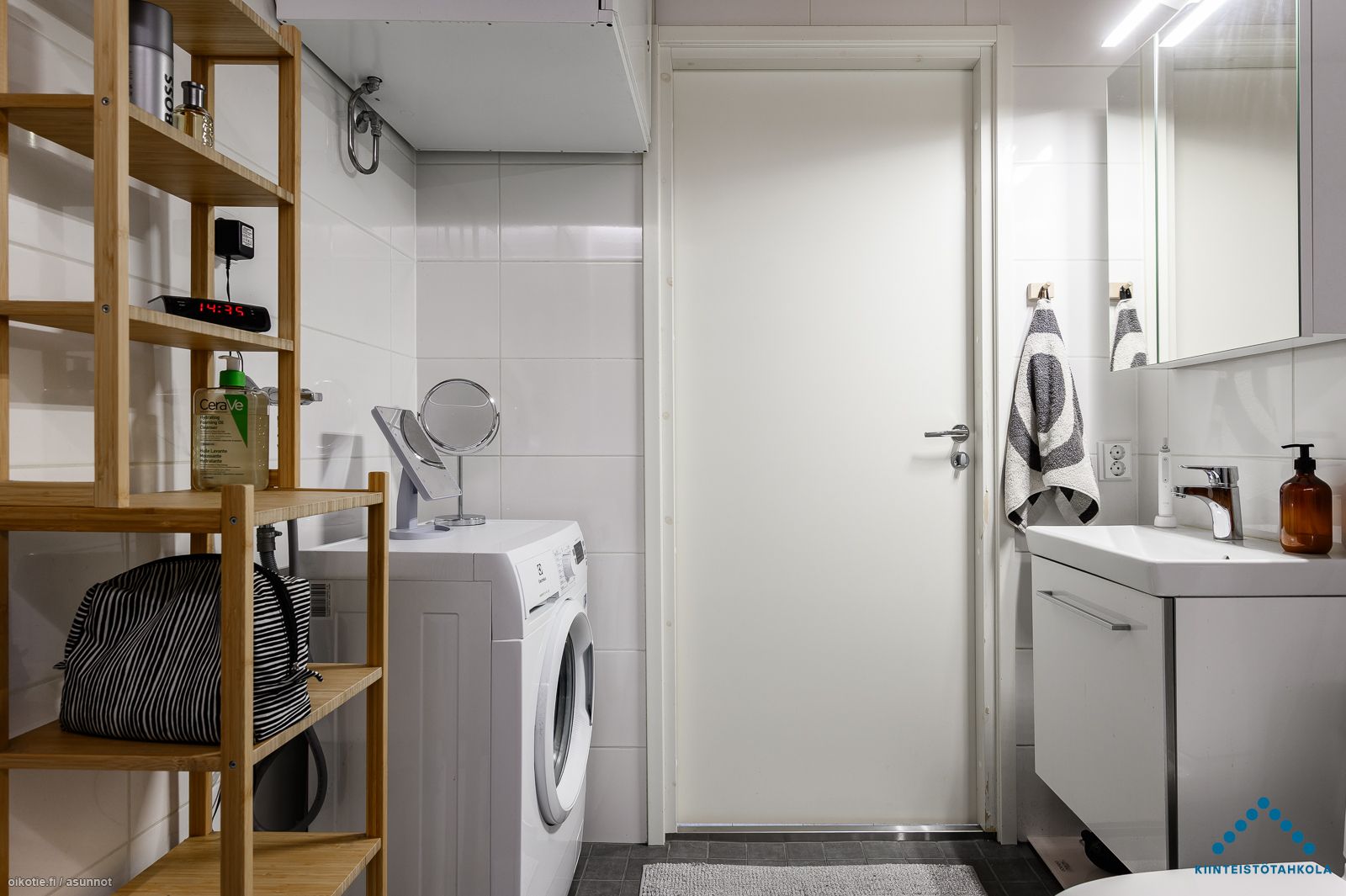 Asunnon 57 neliömetriä sisältää kaksi makuuhuonetta, tupakeittiön, kylpyhuoneen, vaatehuoneen, saunan sekä kattoterassin/parvekkeen. Ylimmän kerroksen sijainti takaa mahtavat näkymät kaupungin ylle. Asunnon lattiat laminaattia ja seinät vaalein maalipinnoin. Asunto on hyvässä kunnossa ja vapautuu uusille asukkaille 1.4.2026 alkaen.