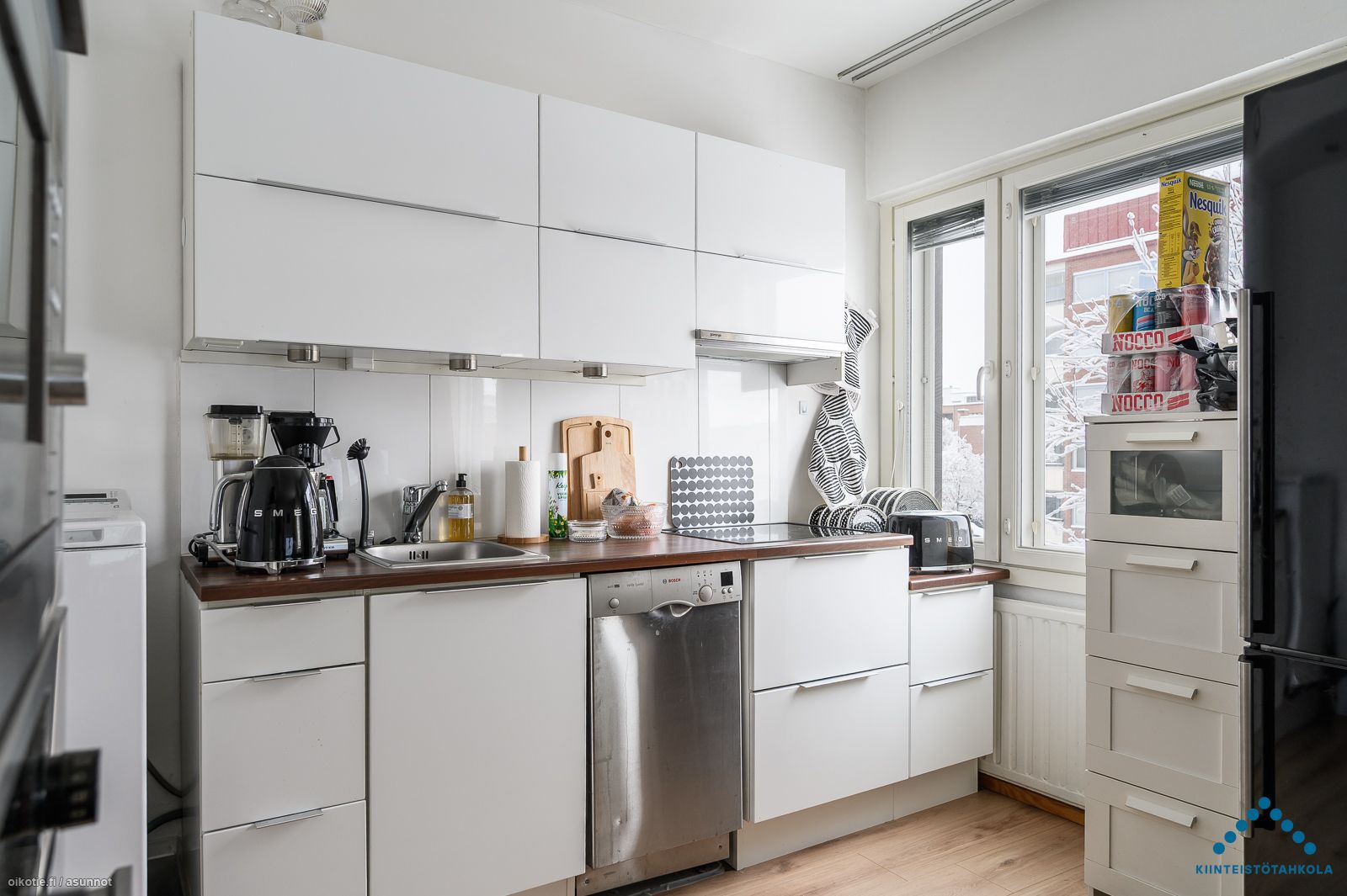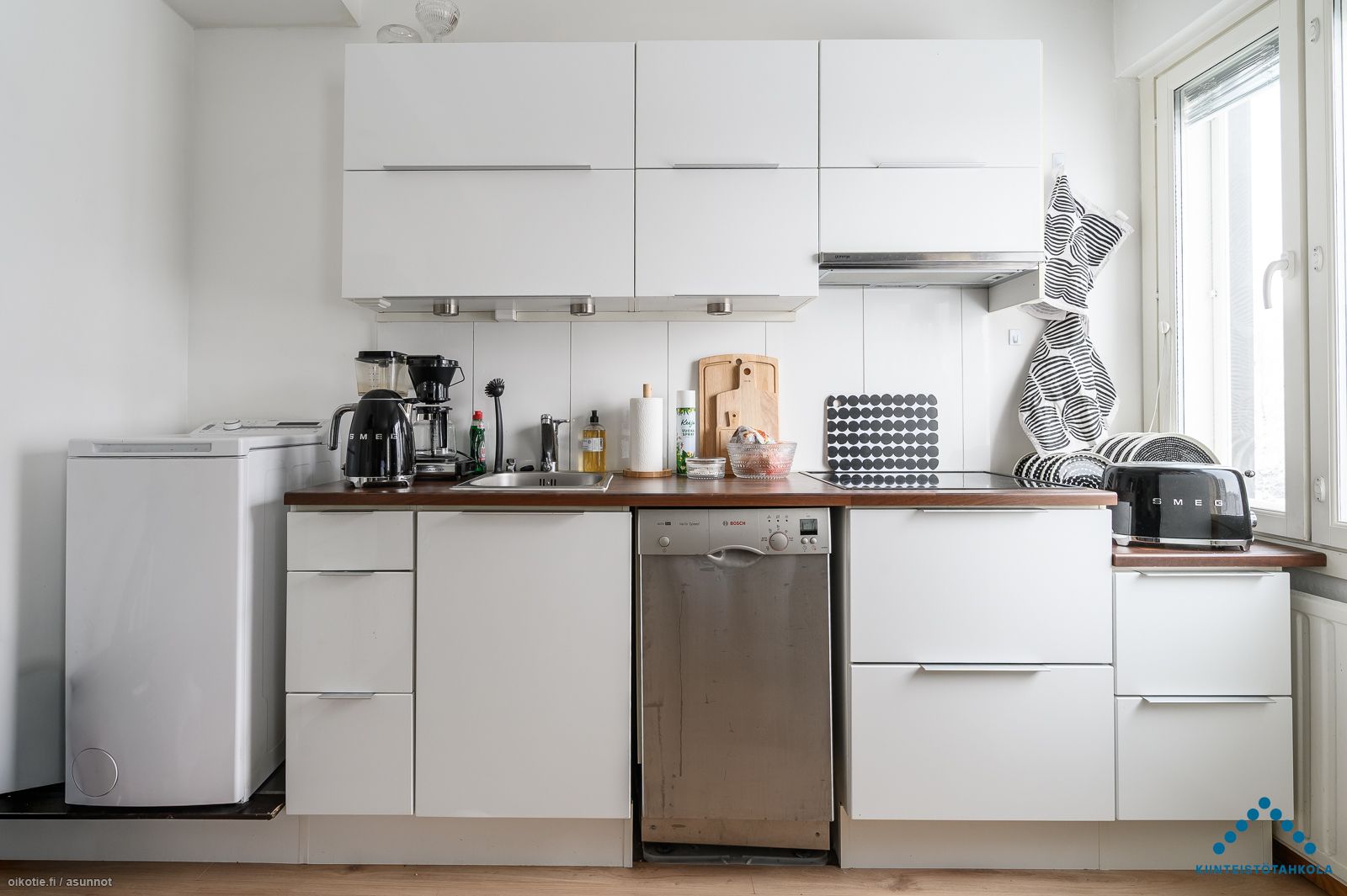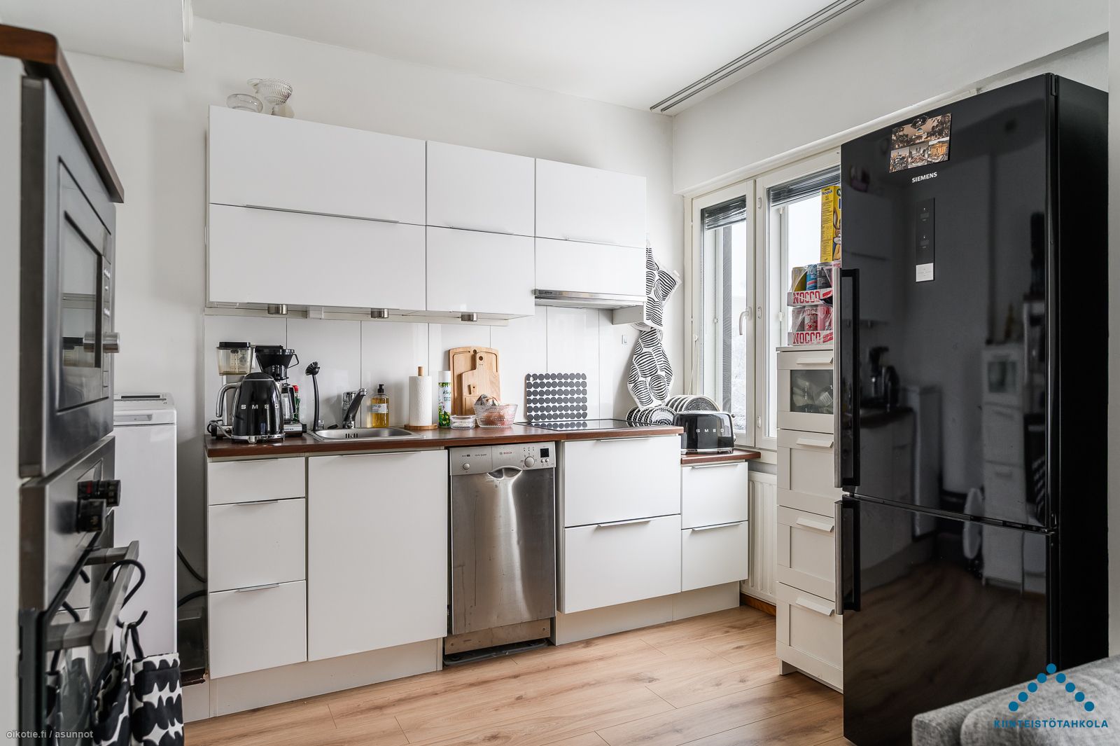| Keittiön varusteet | Varusteet: jääkaappipakastin, astianpesukone, pesukoneliitäntä. Työtaso: laminaattitaso. Liesi: mikroaaltouuni, liesitaso. avokeittiö |