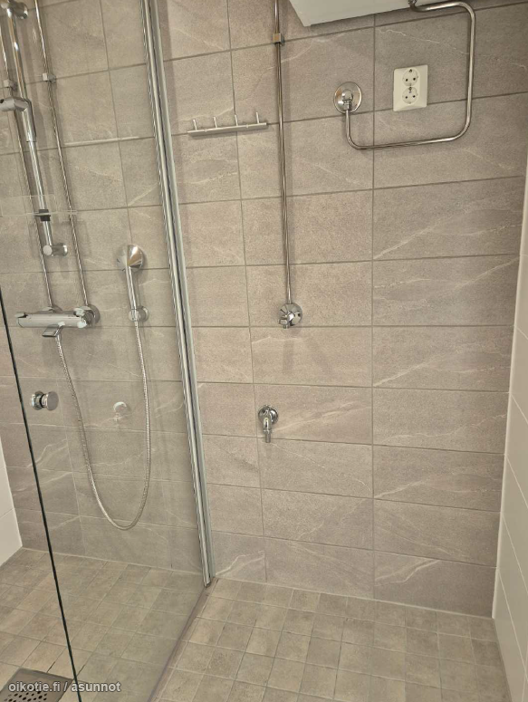 Tässä tilavassa ylimmän kerroksen kaksiossa lattiat ovat parkettia, kylpyhuoneessa lattia laatoitettu, ja seinät ovat vaalealla maalipinnalla. Keittiössä on nykyaikaiset kodinkoneet ja laadukkaat kalusteet. Kylpyhuoneessa on myös hyvin tilaa ja siellä on liitäntä pyykkikoneelle. Säilytystilaa tuo tilava vaatehuone.